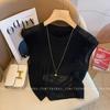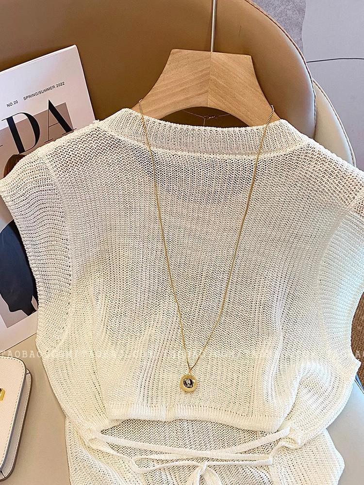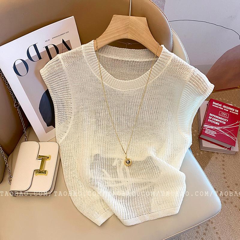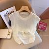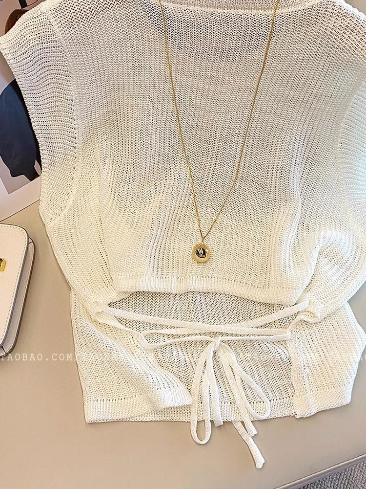 Chaleco de Punto de Manga Volante Pequeña Hueco con Tira Trasera para Mujer 2025 Nuevo Color Puro Sencillo Versátil Top de Punto de Manga Volante