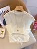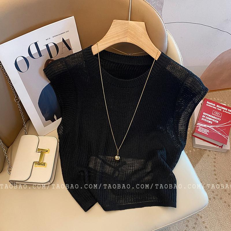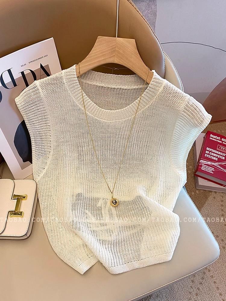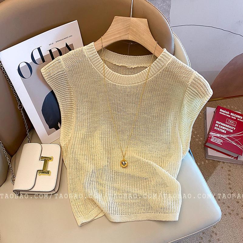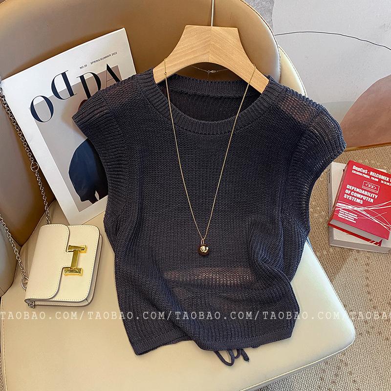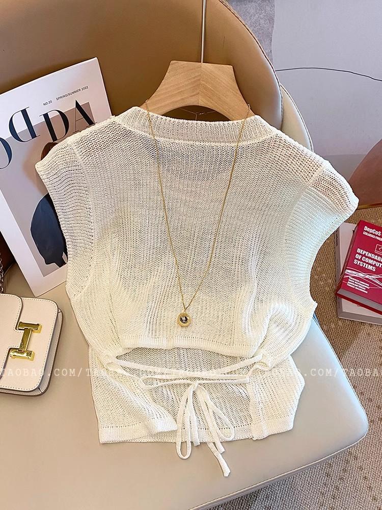 Compra Chaleco de Punto de Manga Volante Pequeña Hueco con Tira Trasera para Mujer 2025 Nuevo Color Puro Sencillo Versátil Top de Punto de Manga Volante al por mayor en Joom.pro