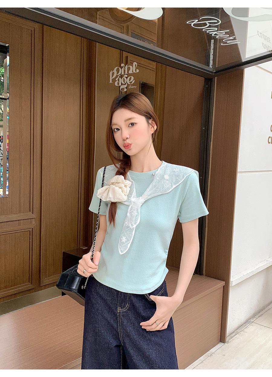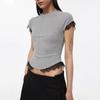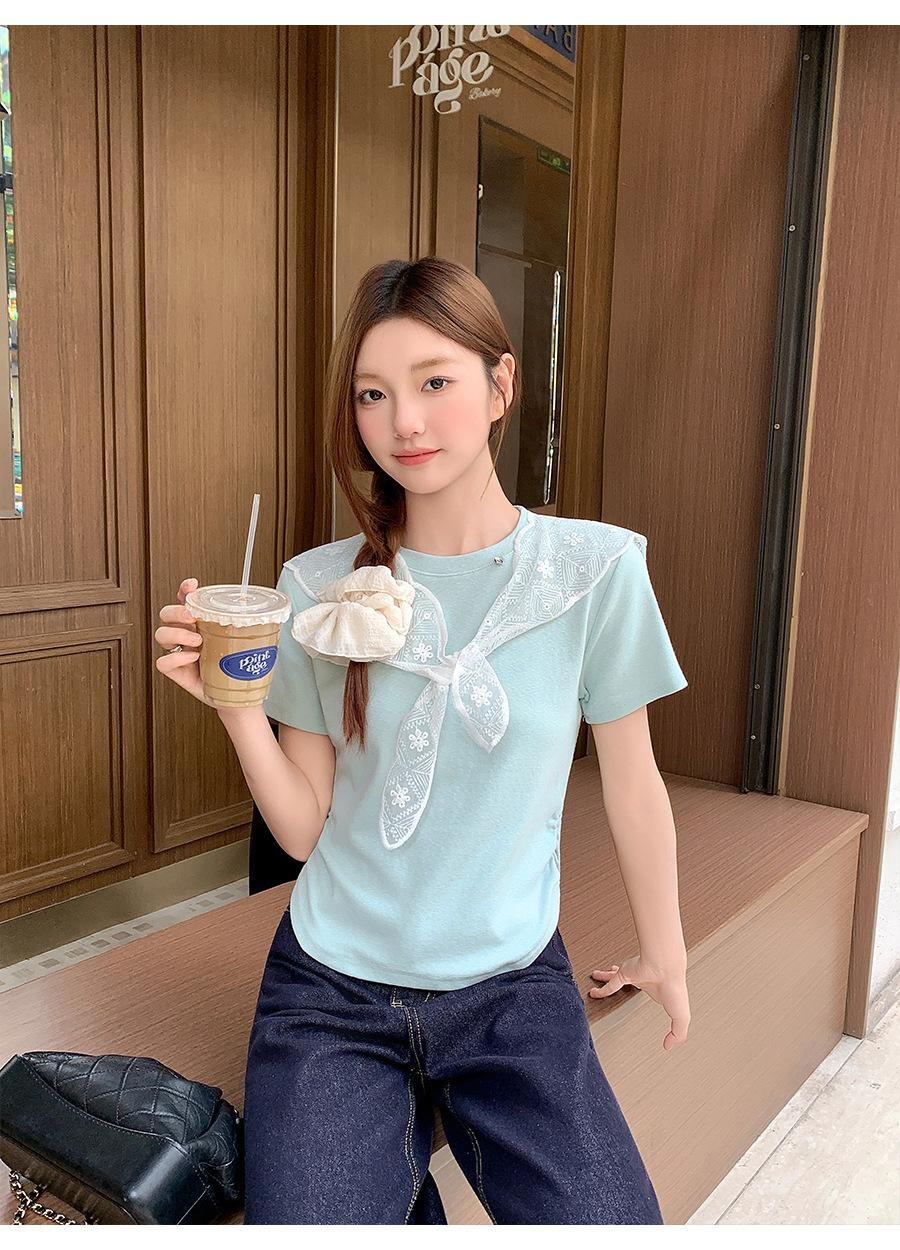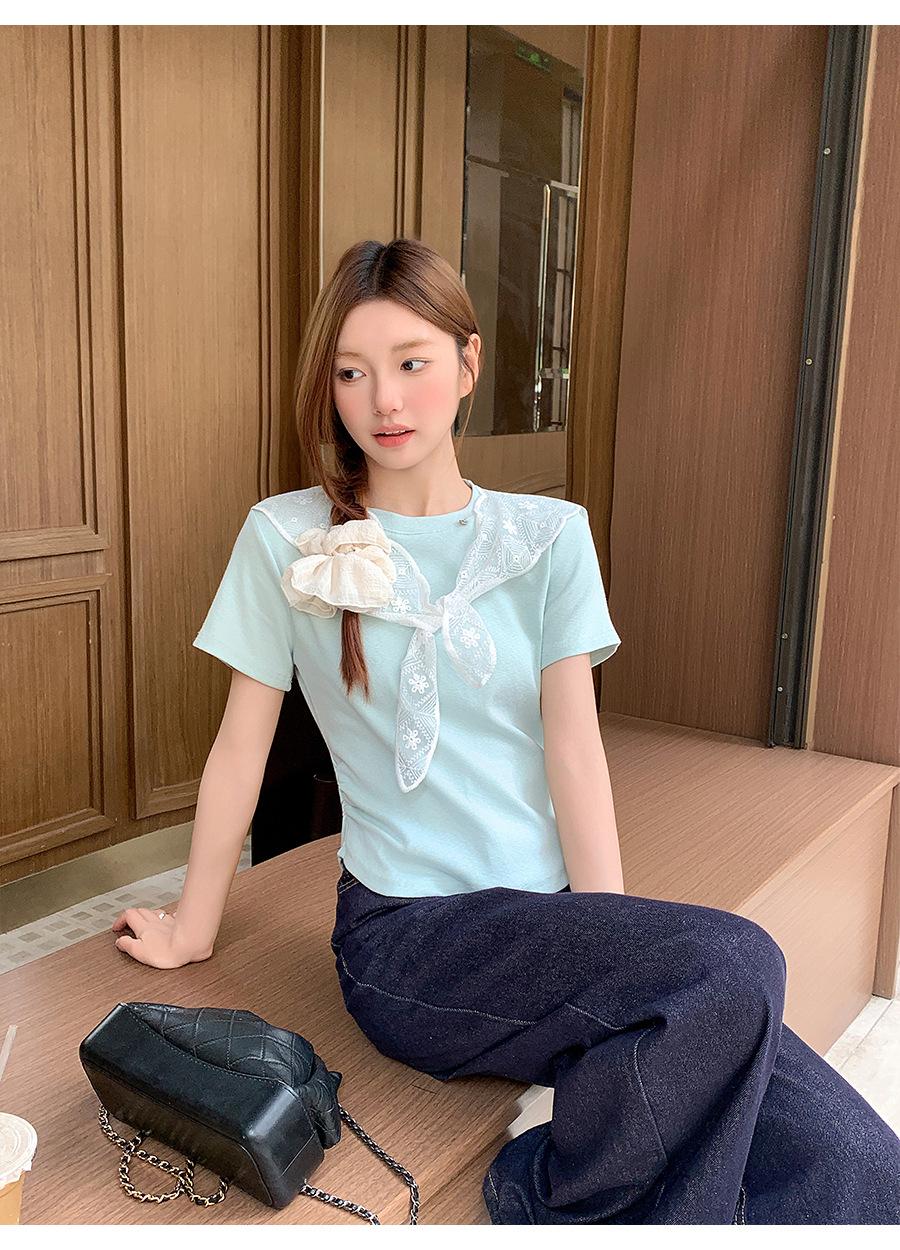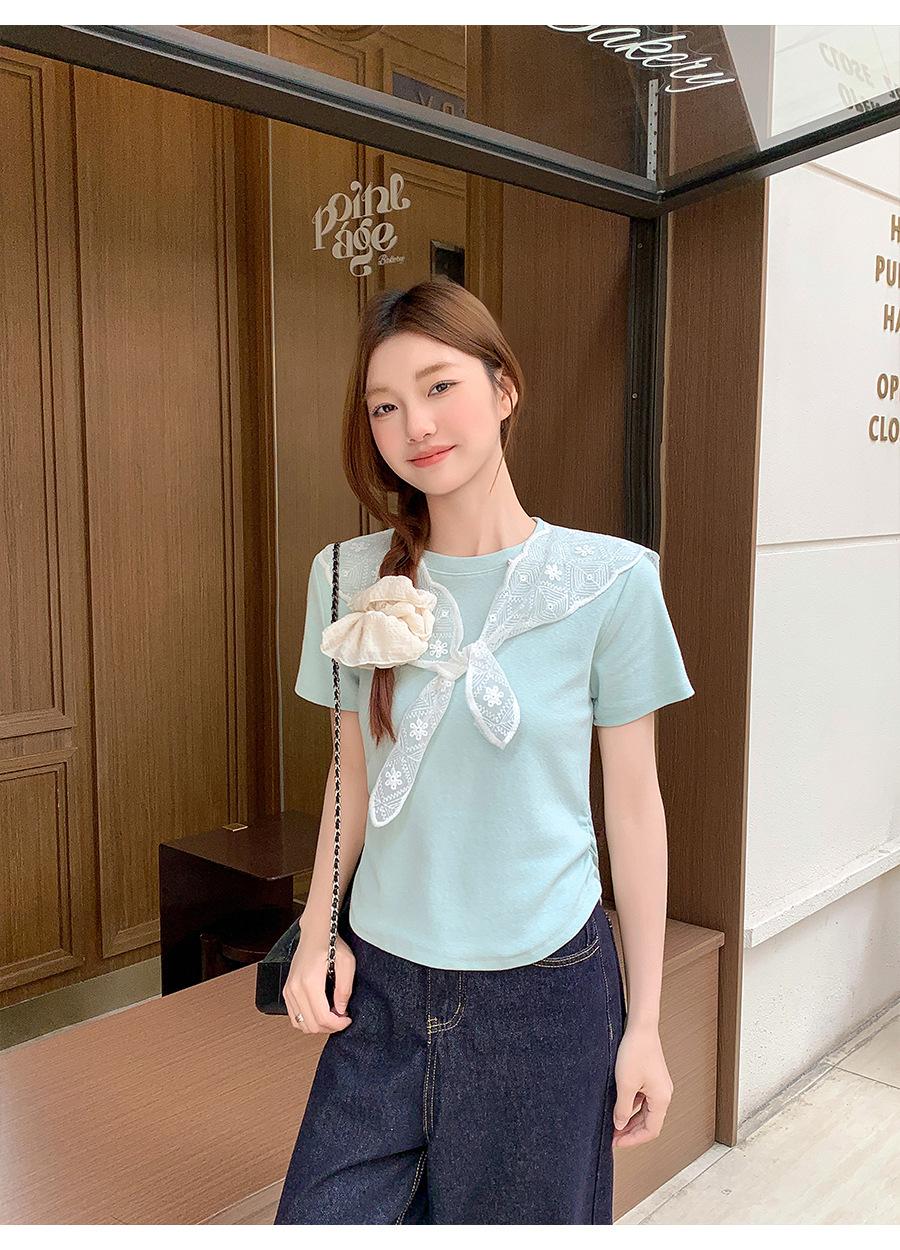 Chal de Encaje Camiseta de Manga Corta con Cuello Redondo para Mujer 2025 Verano Nuevo Diseño Cintura Plisada Look Adelgazante Top Corto