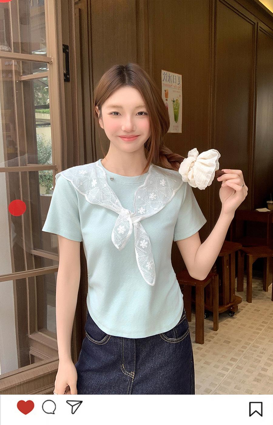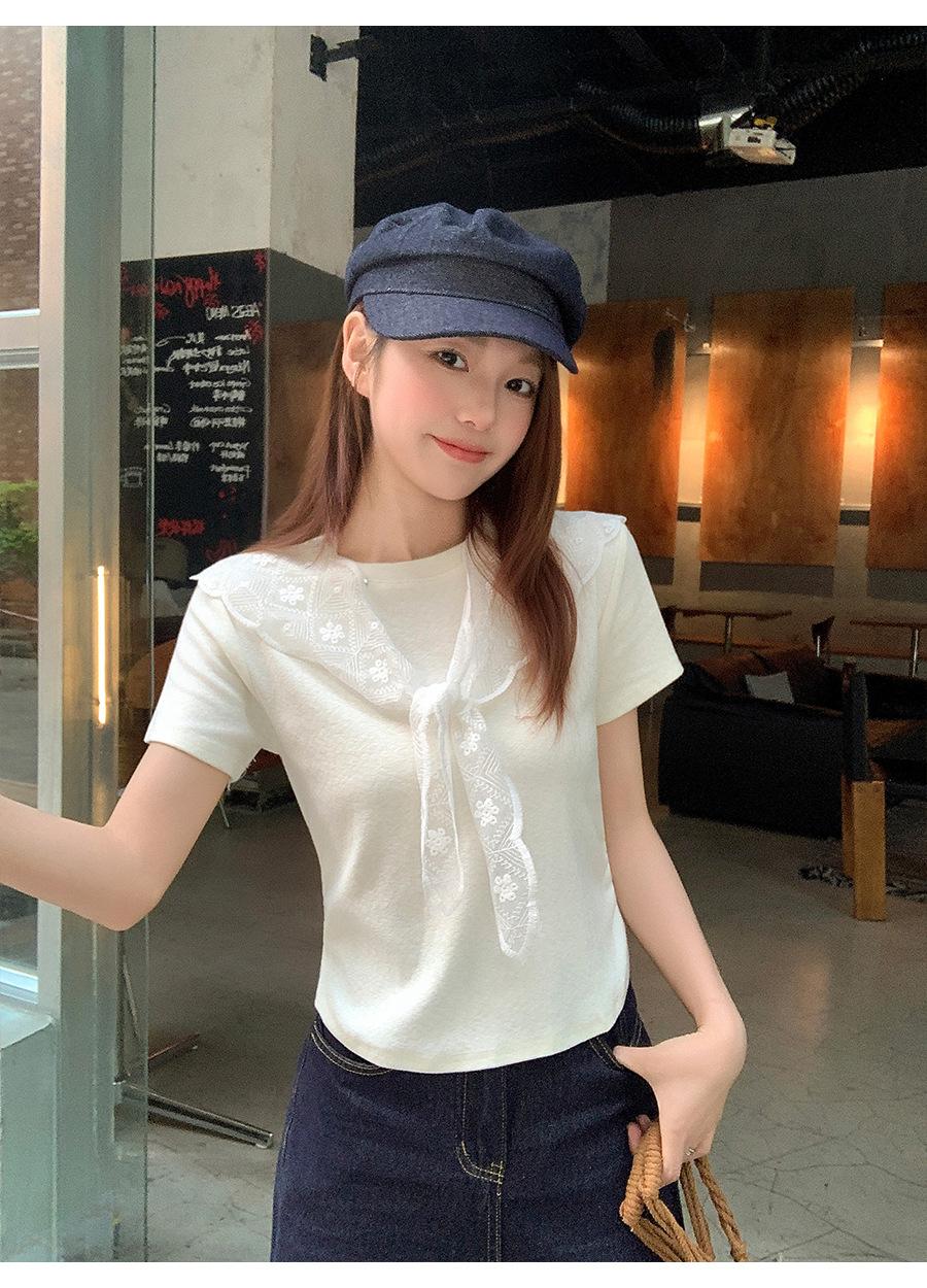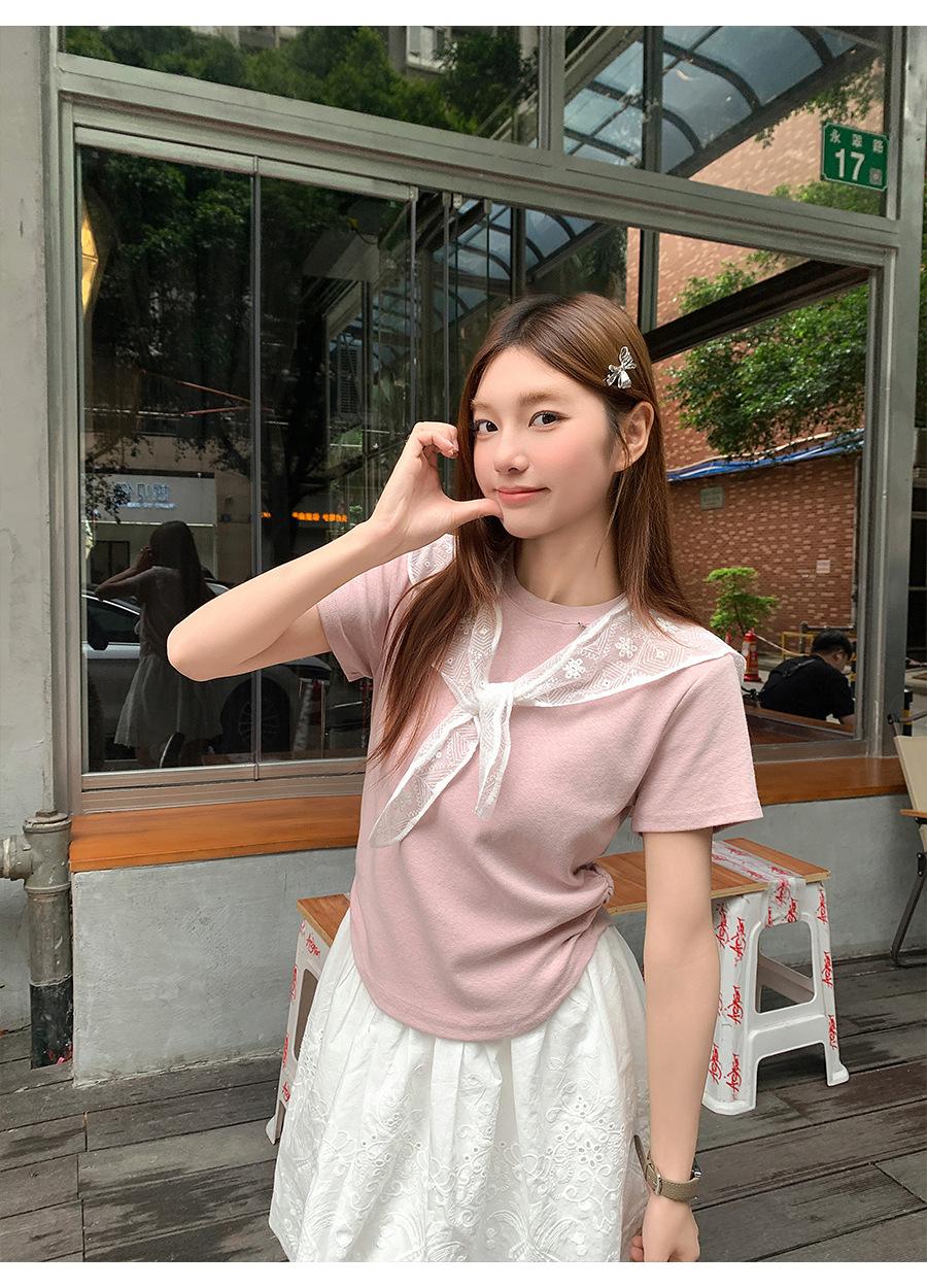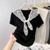 Chal de Encaje Camiseta de Manga Corta con Cuello Redondo para Mujer 2025 Verano Nuevo Diseño Cintura Plisada Look Adelgazante Top Corto