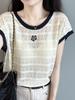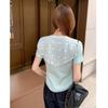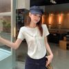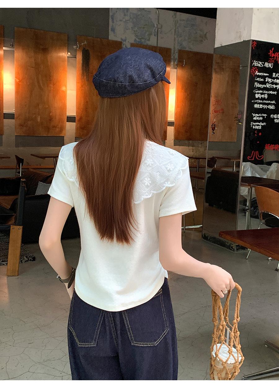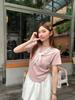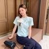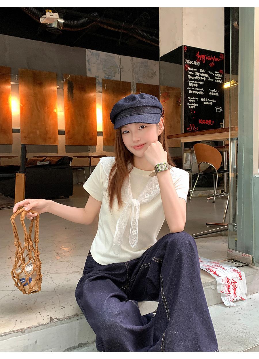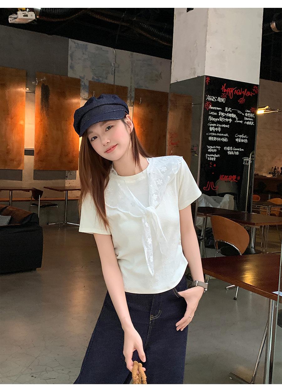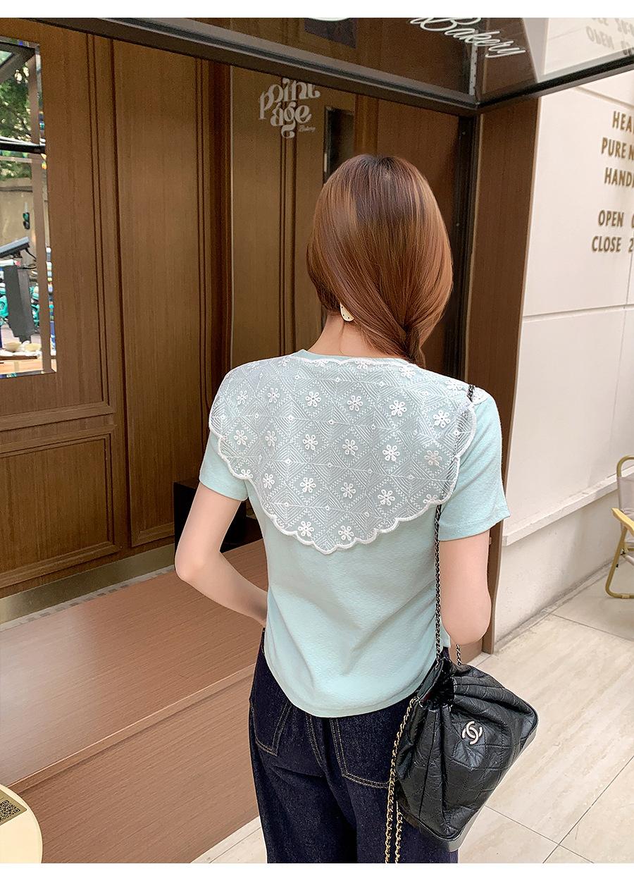 Chal de Encaje Camiseta de Manga Corta con Cuello Redondo para Mujer 2025 Verano Nuevo Diseño Cintura Plisada Look Adelgazante Top Corto