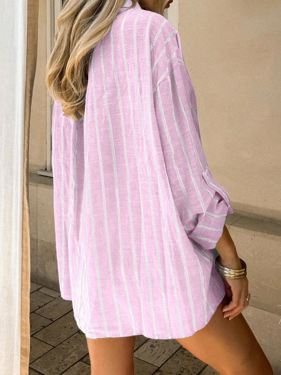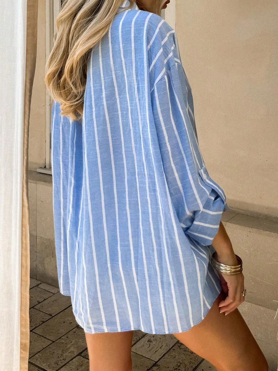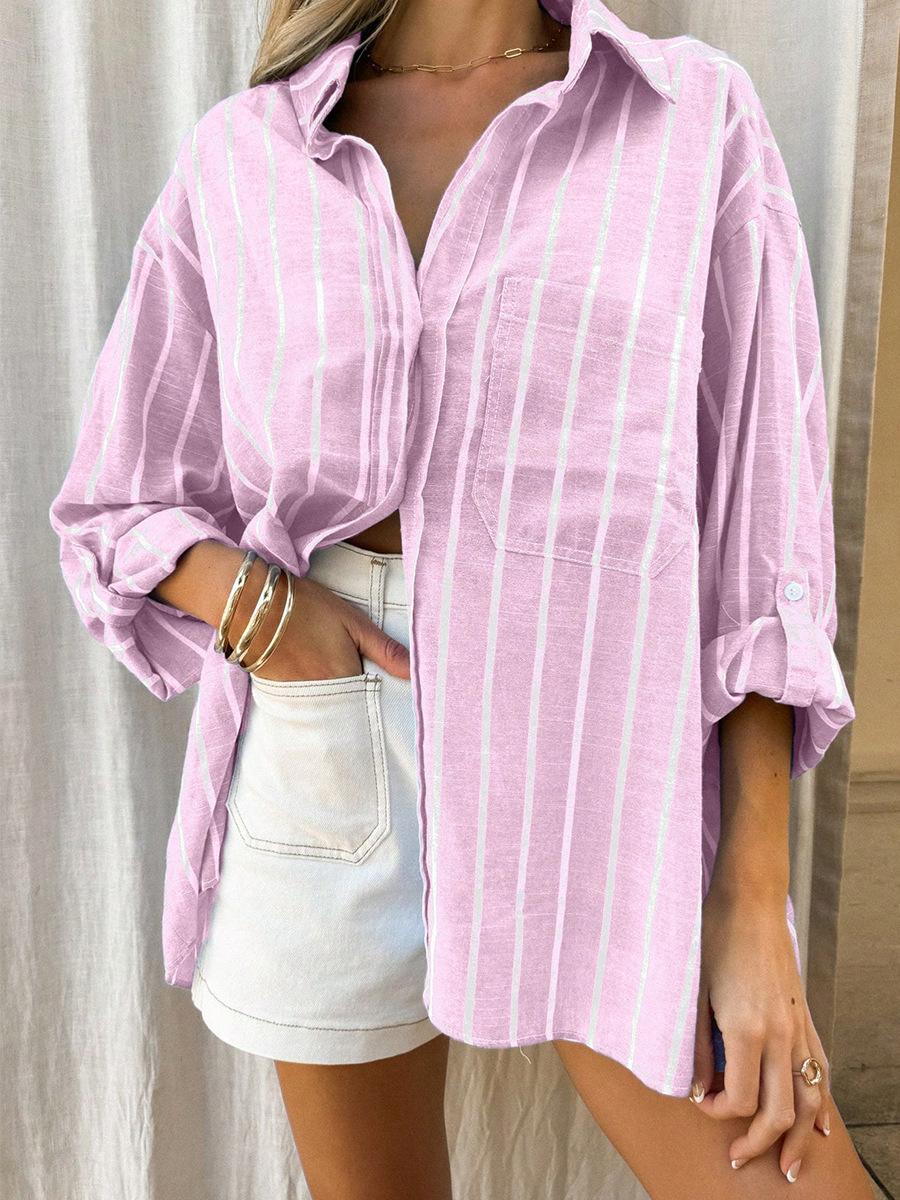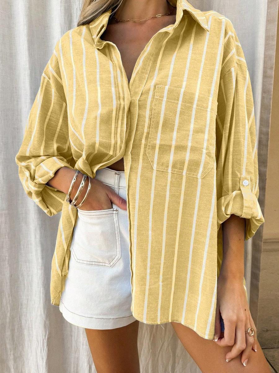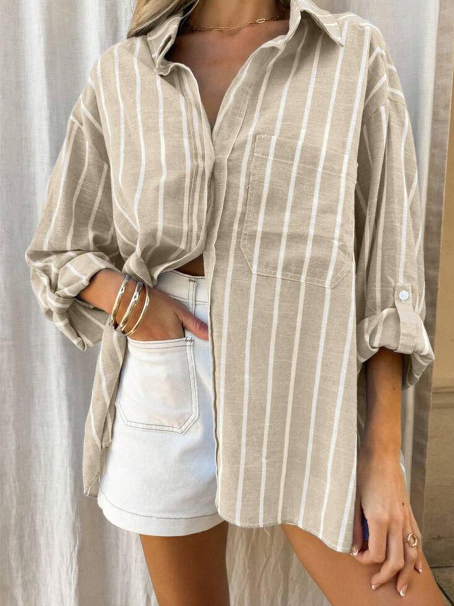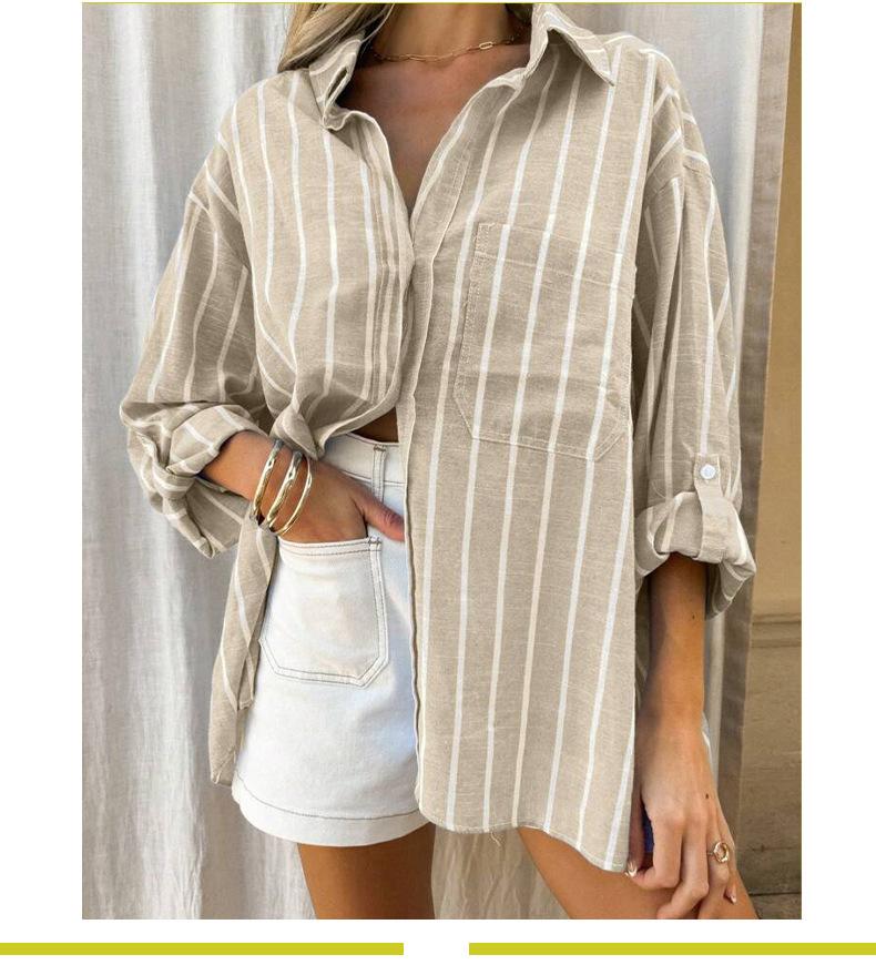 Compra Camisas de Rayas Europeas y Americanas Transfronterizas de Amazon para Mujer 2025 Nuevas Camisas Elegantes Versátiles de Manga Larga Cárdigan Ropa Holgada para Mujer al por mayor en Joom.pro