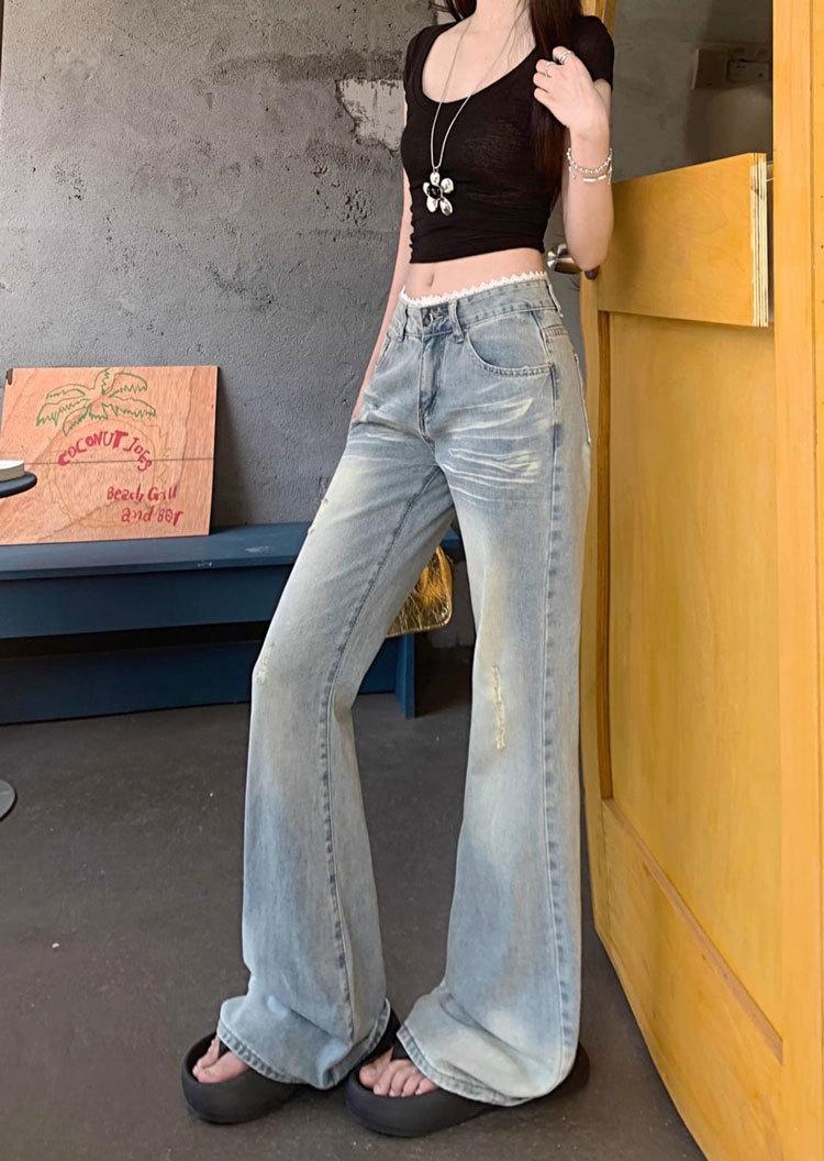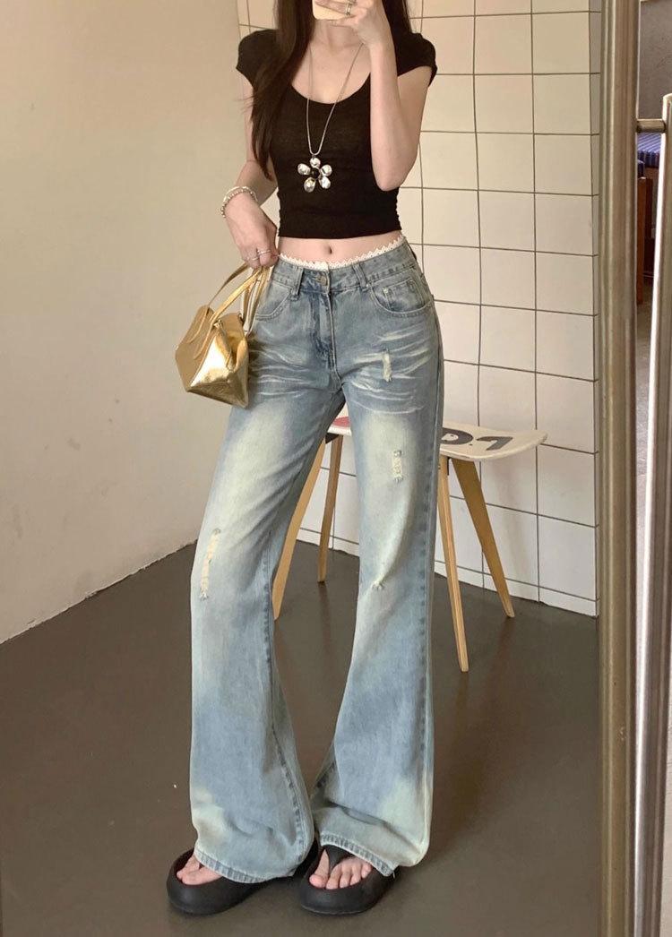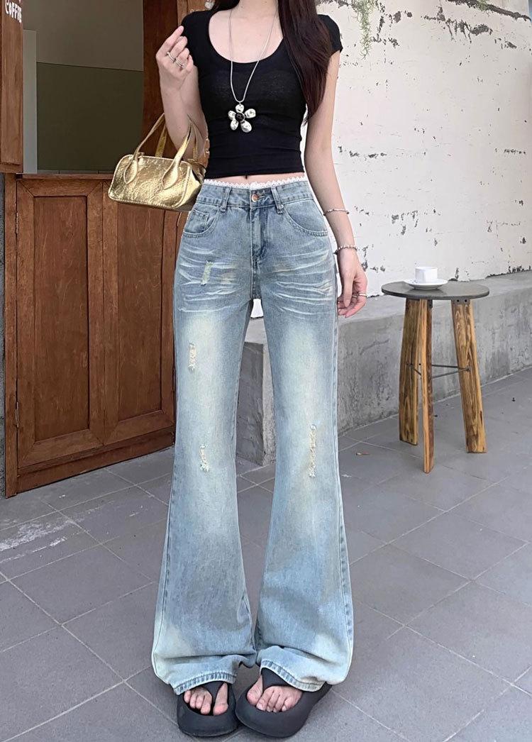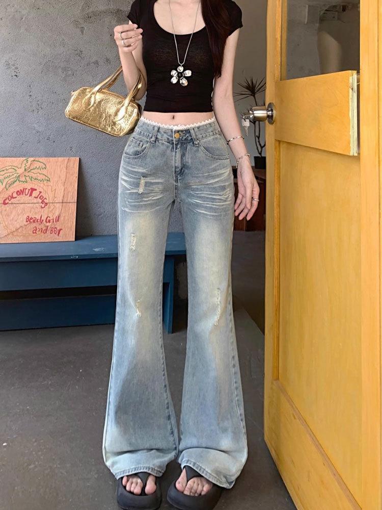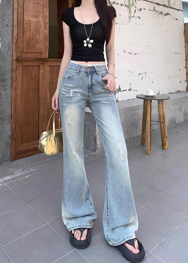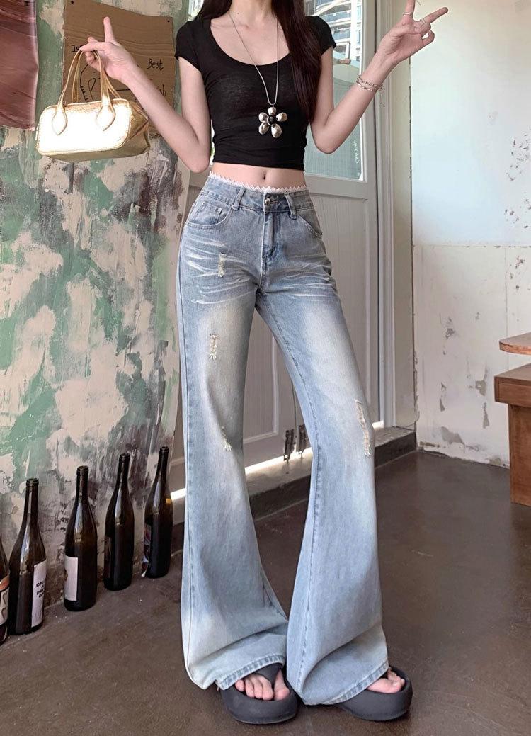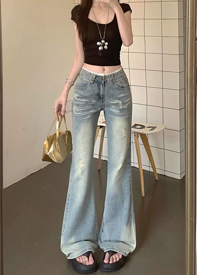 Jeans ajustados azul claro estilo americano rasgados para mujer, talla grande, empalme de encaje, cintura baja, petite, pantalones largos acampanados