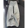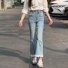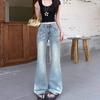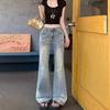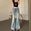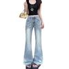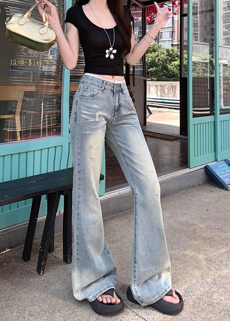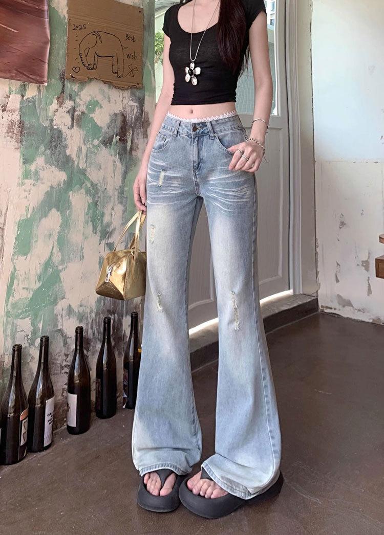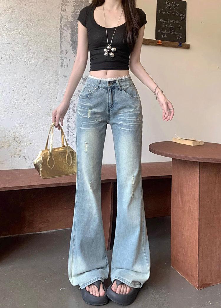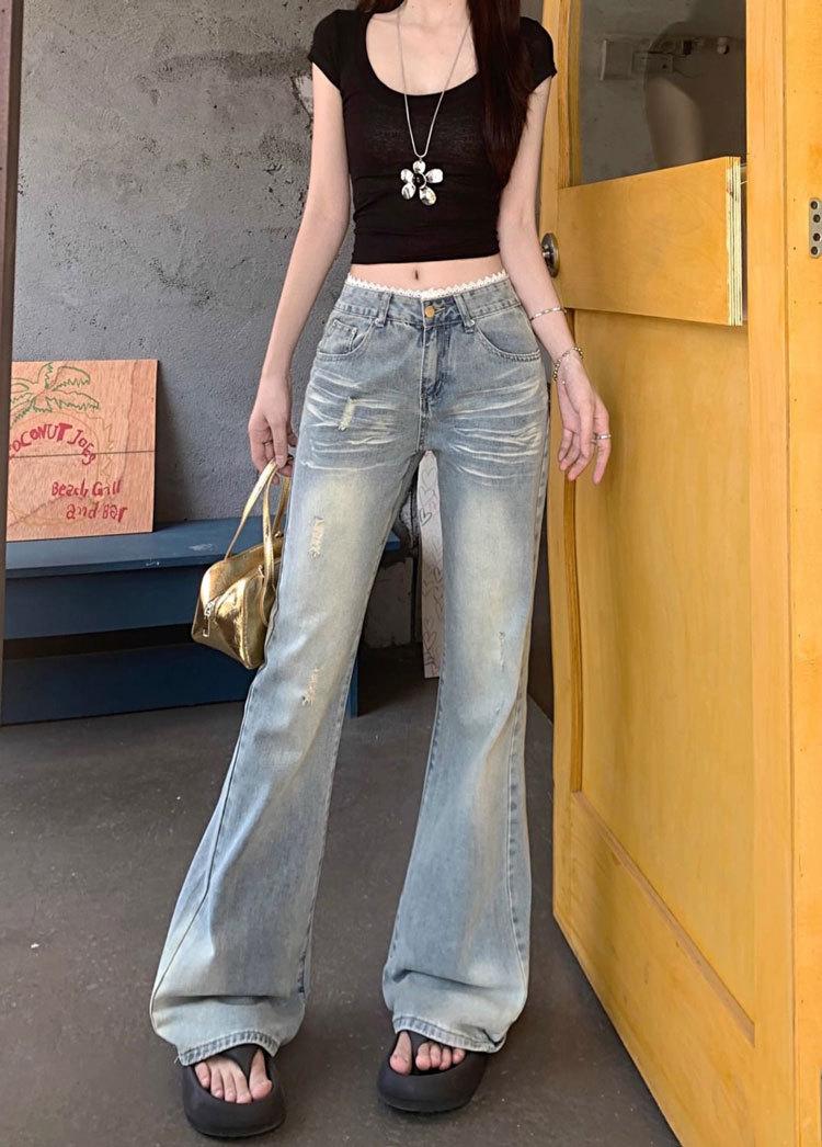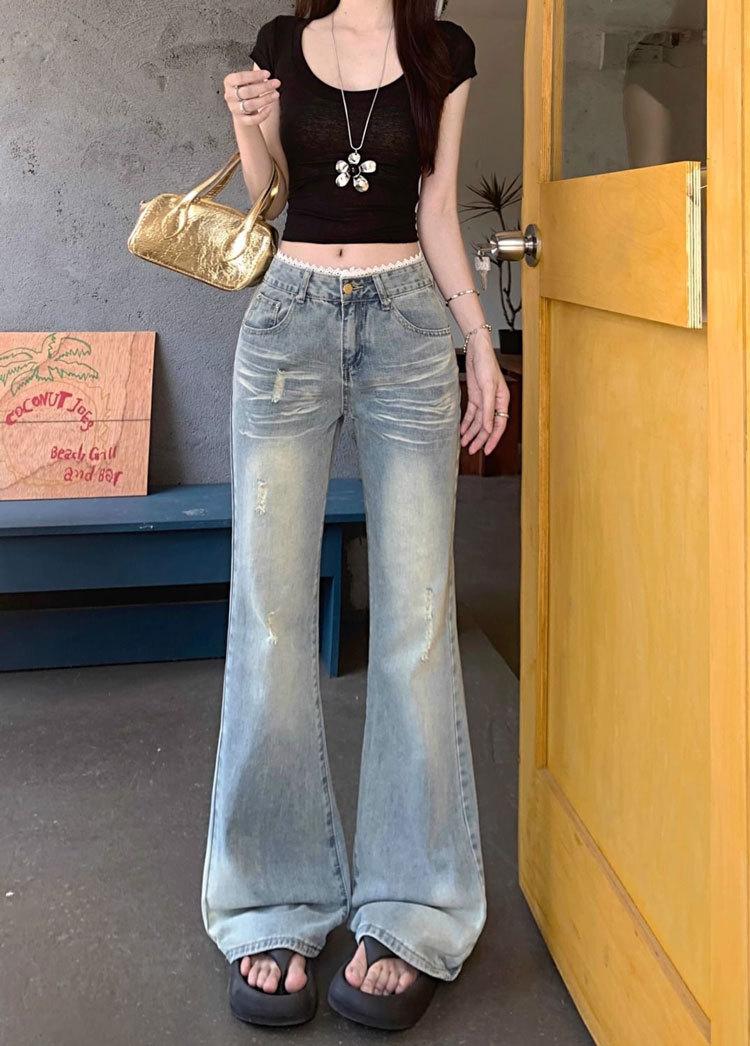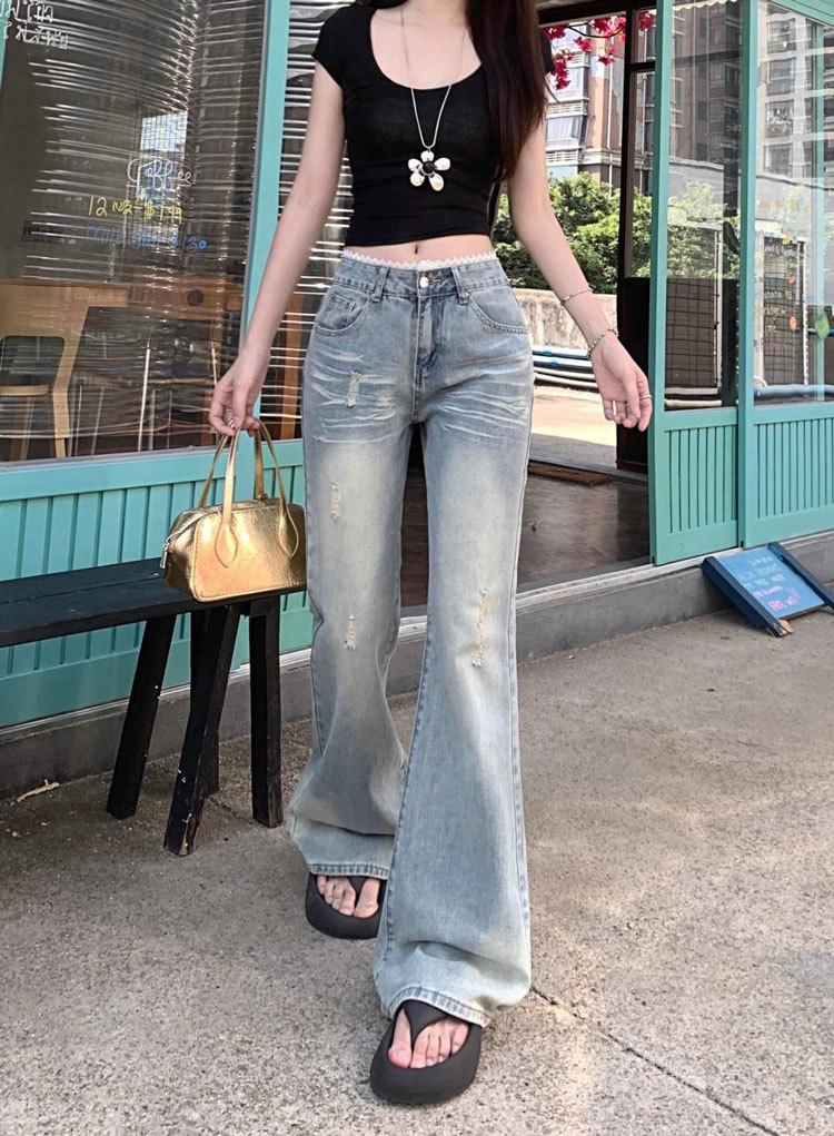 Jeans ajustados azul claro estilo americano rasgados para mujer, talla grande, empalme de encaje, cintura baja, petite, pantalones largos acampanados