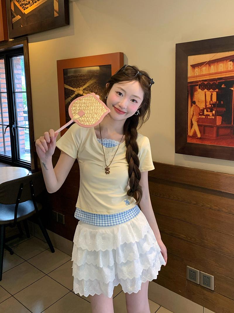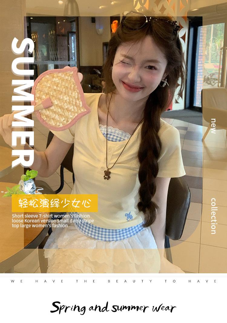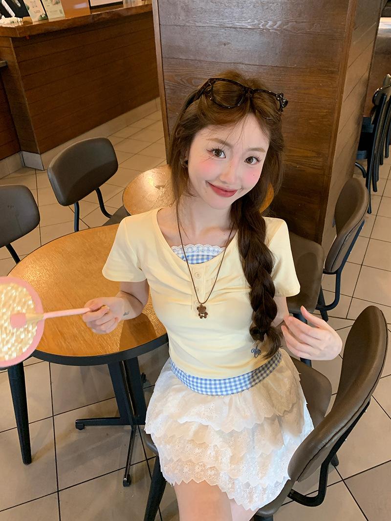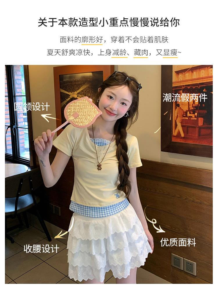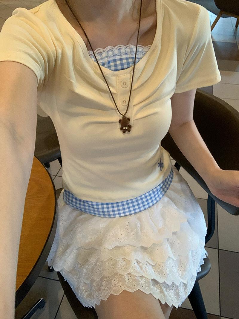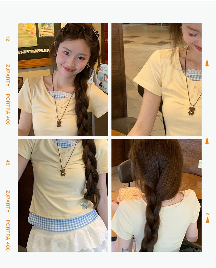 Fábrica de Origen Especializada en Comercio Exterior Camiseta de Encaje a Cuadros de Manga Corta Falsa de Dos Piezas Diseño de Verano para Mujer Top Corto Ajustado