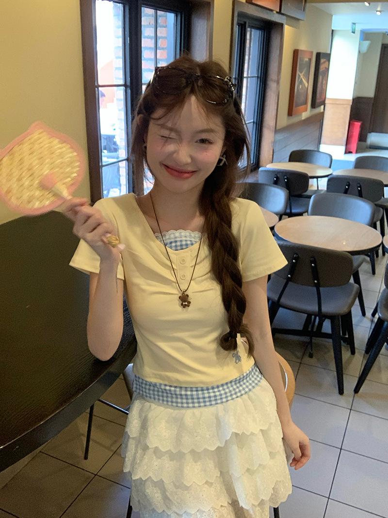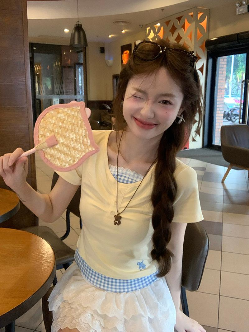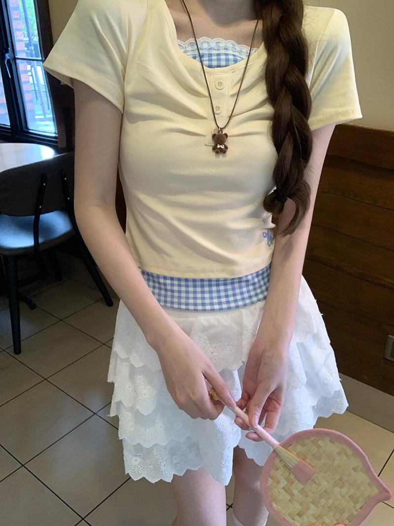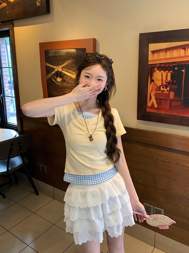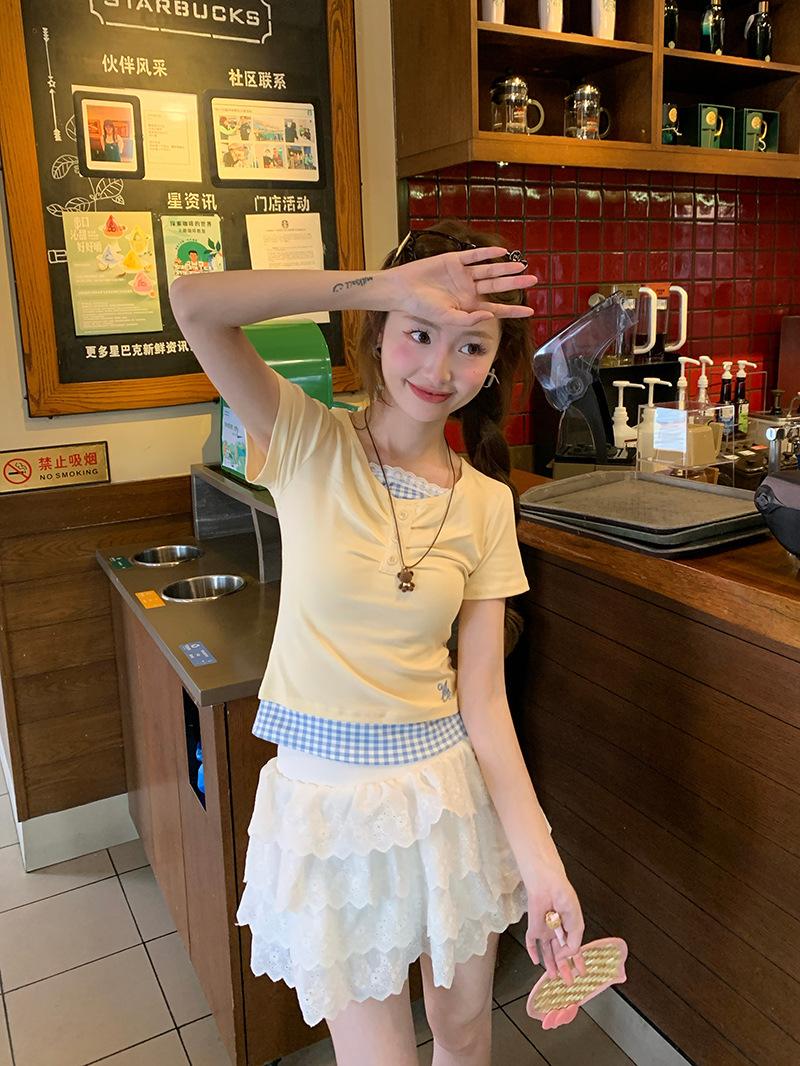 Fábrica de Origen Especializada en Comercio Exterior Camiseta de Encaje a Cuadros de Manga Corta Falsa de Dos Piezas Diseño de Verano para Mujer Top Corto Ajustado