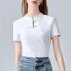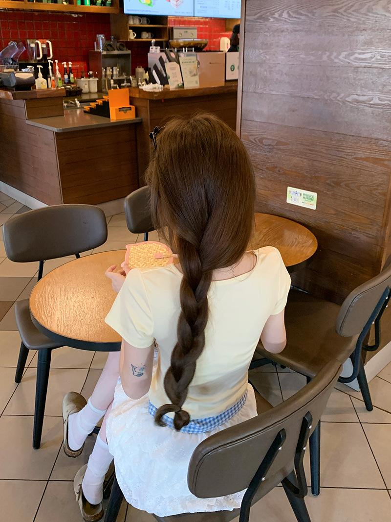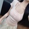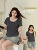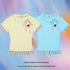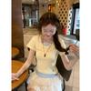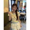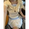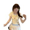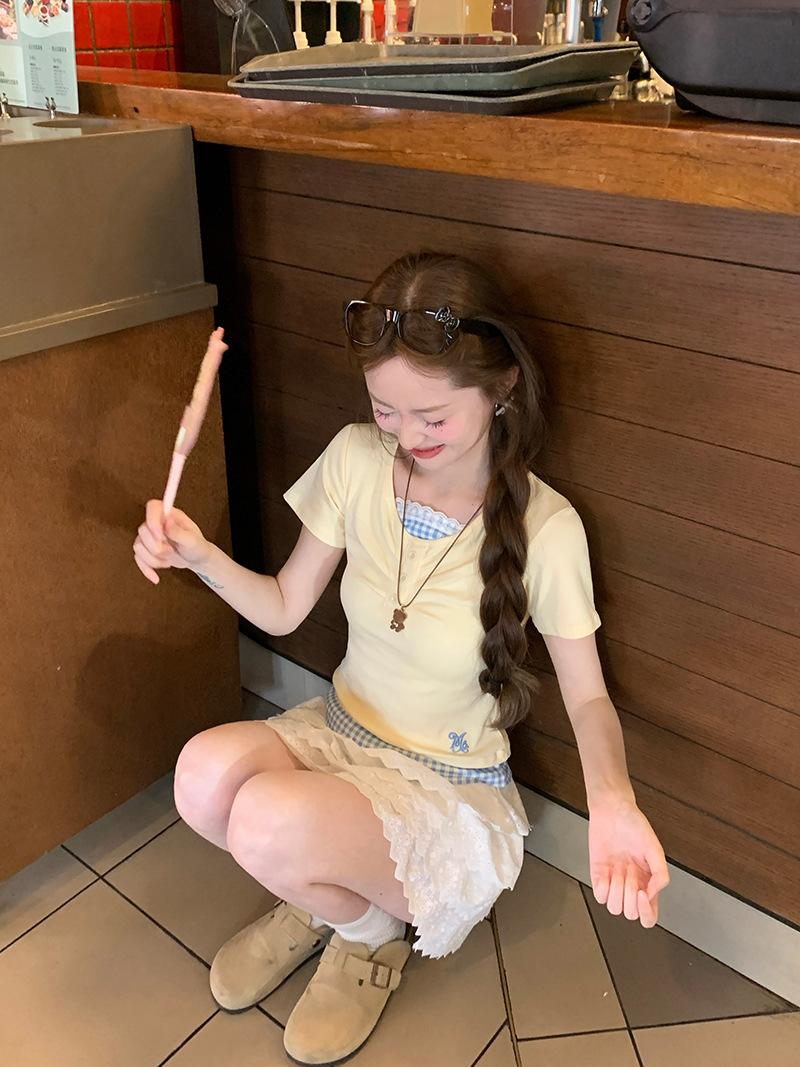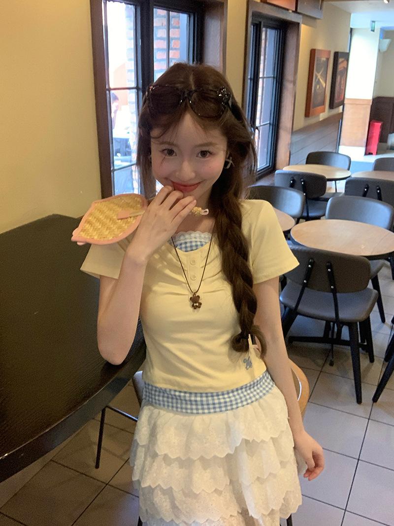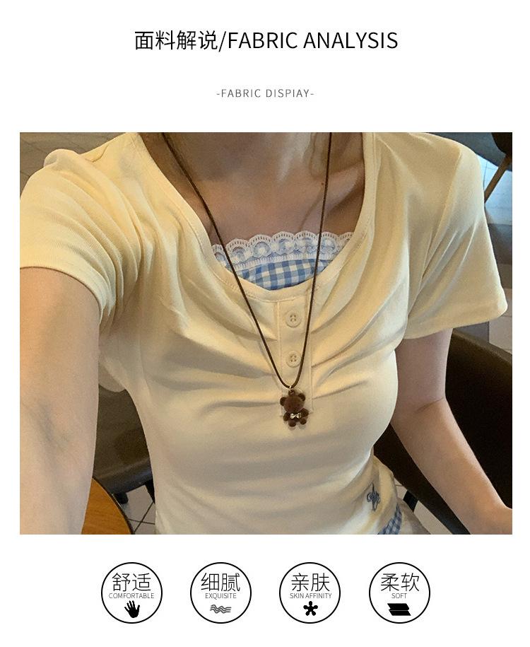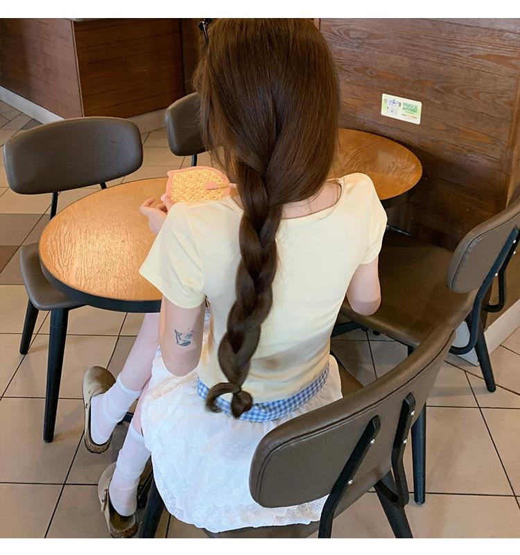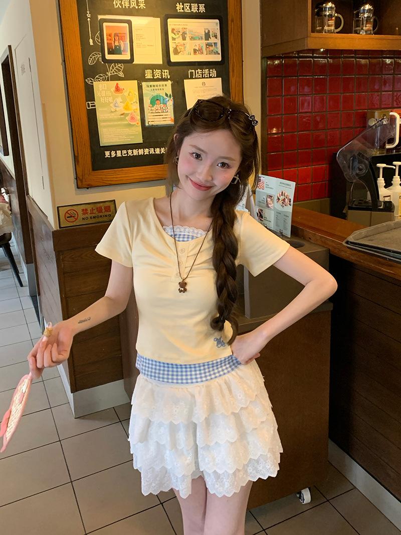 Fábrica de Origen Especializada en Comercio Exterior Camiseta de Encaje a Cuadros de Manga Corta Falsa de Dos Piezas Diseño de Verano para Mujer Top Corto Ajustado