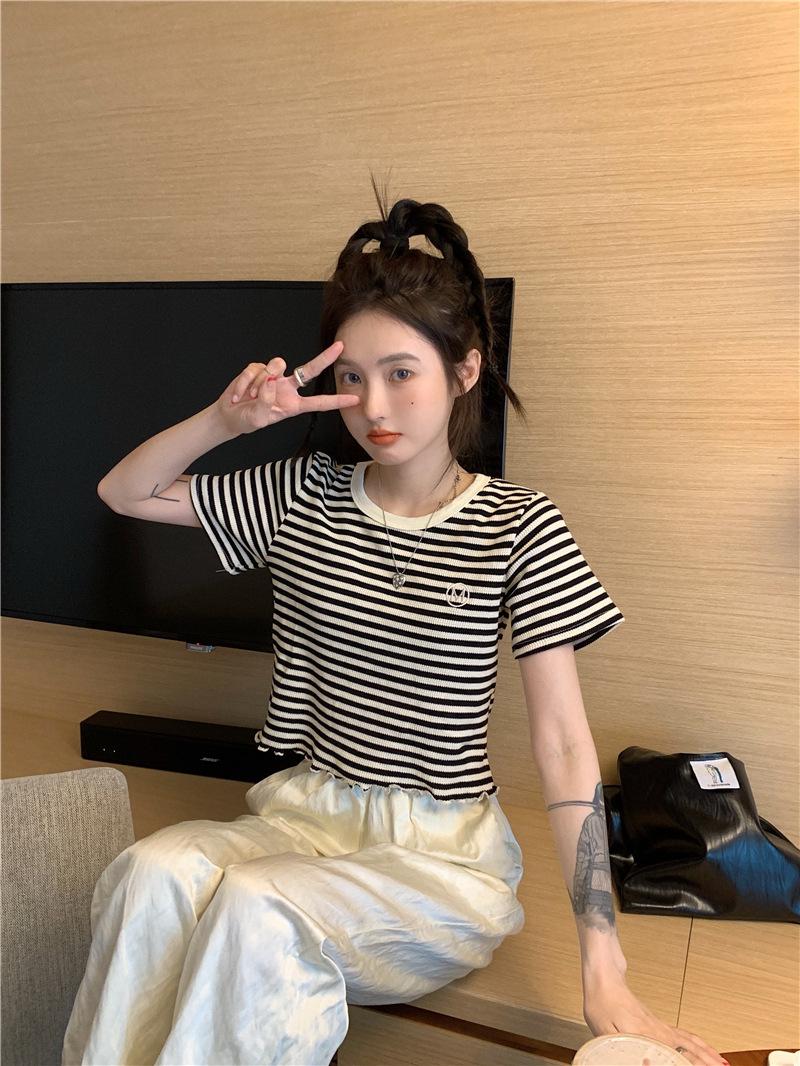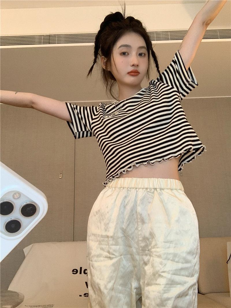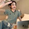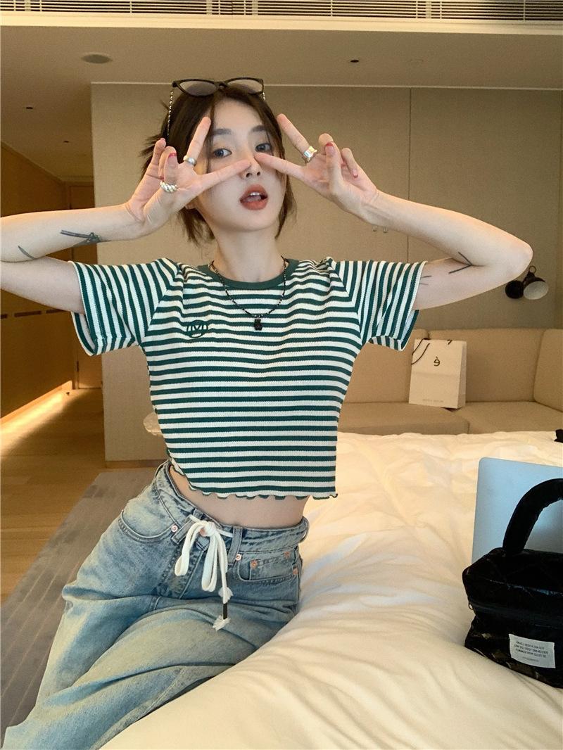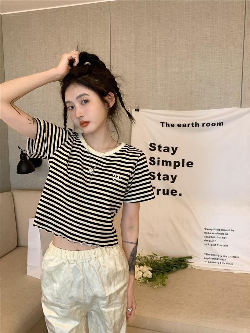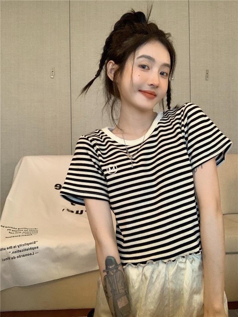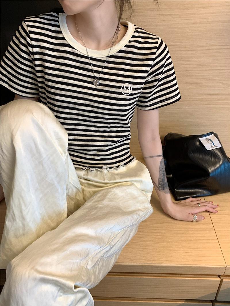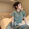 Nueva Llegada Hombro Combinable Camiseta Rayada de Manga Corta para Mujer Verano Estilo Coreano Moda Cuello Redondo Ajustada Rizos Top Corto