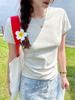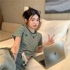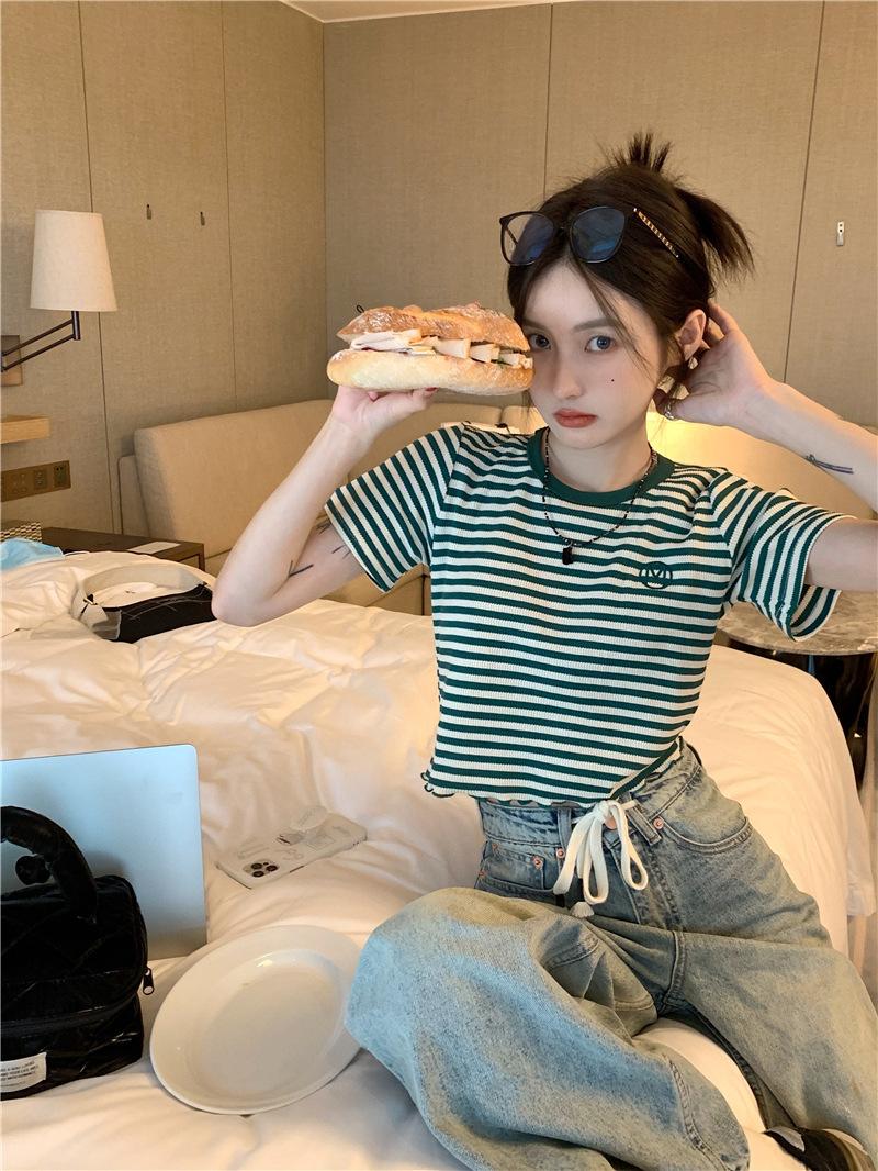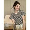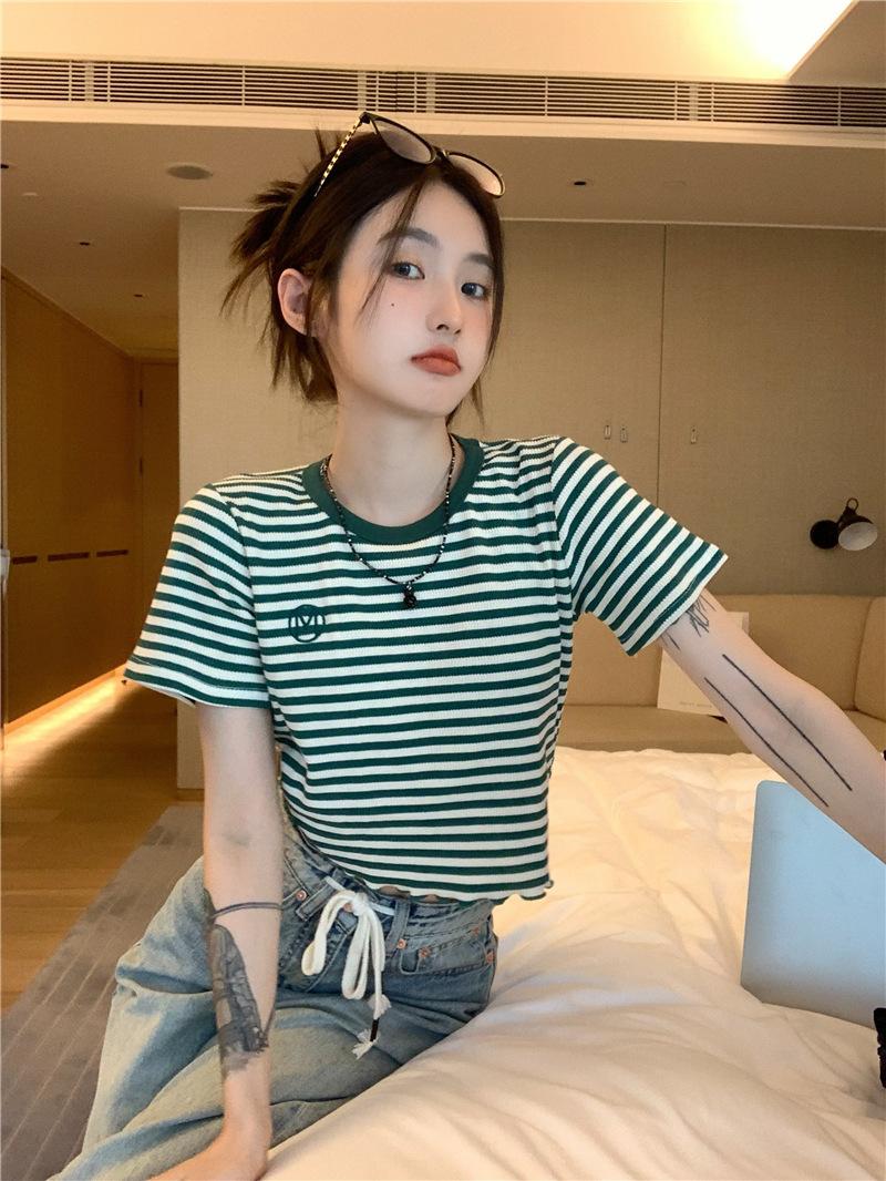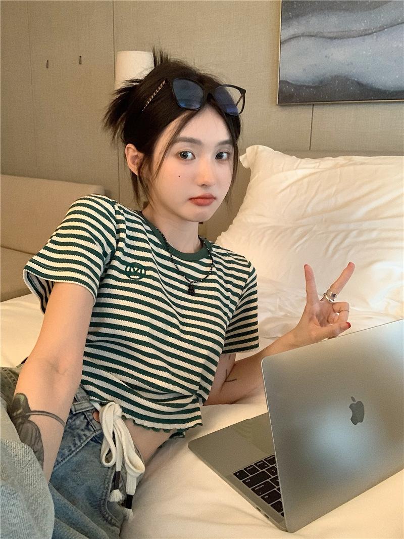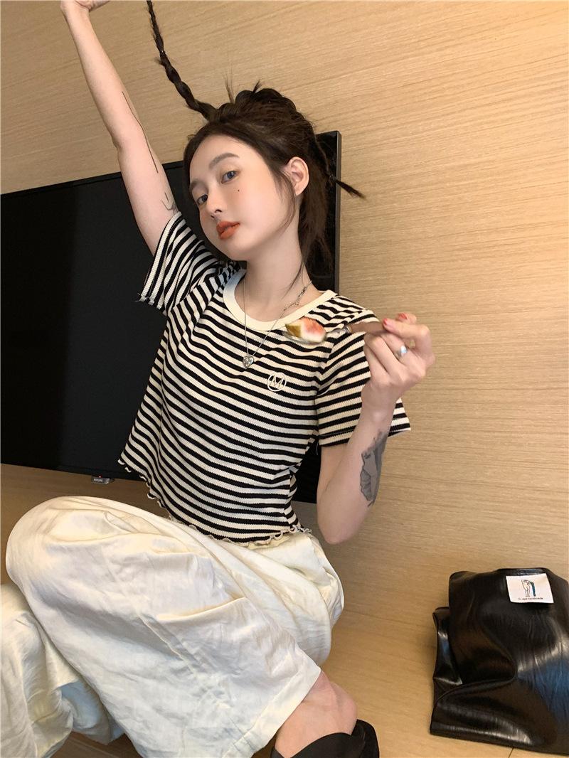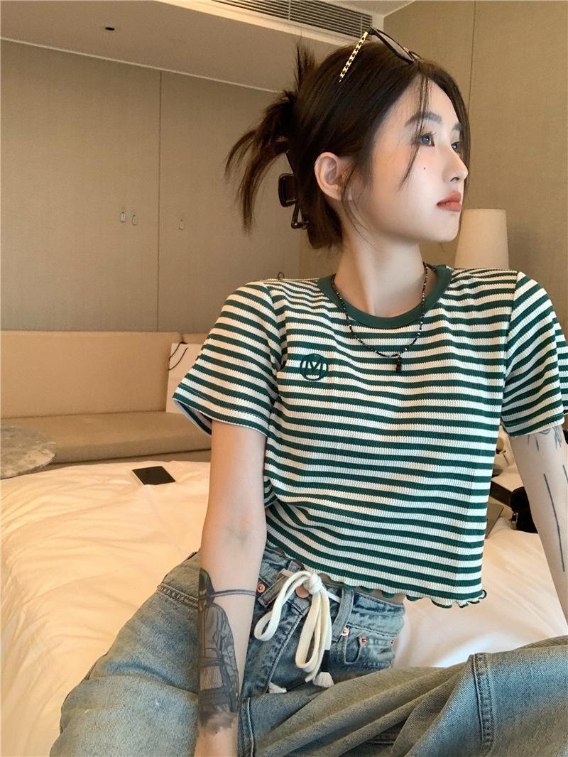 Nueva Llegada Hombro Combinable Camiseta Rayada de Manga Corta para Mujer Verano Estilo Coreano Moda Cuello Redondo Ajustada Rizos Top Corto