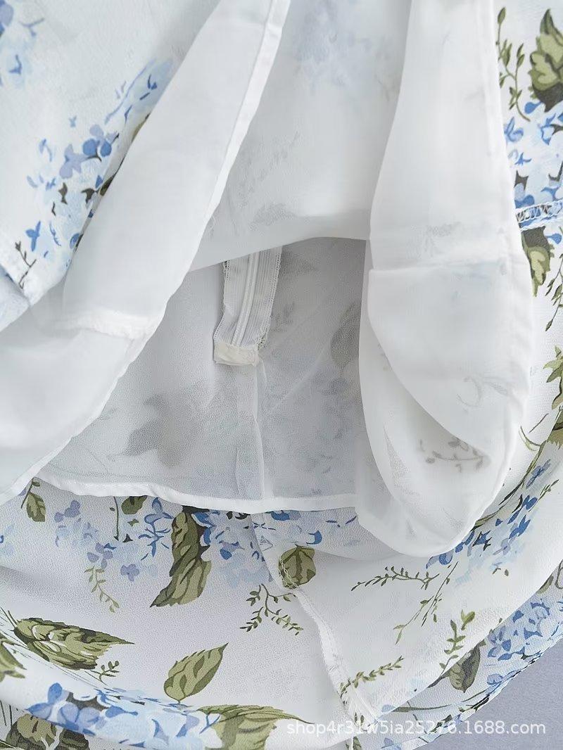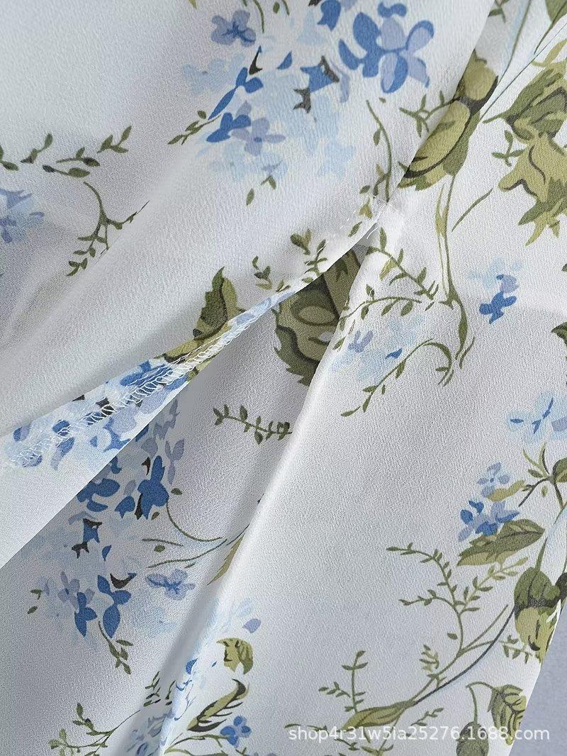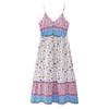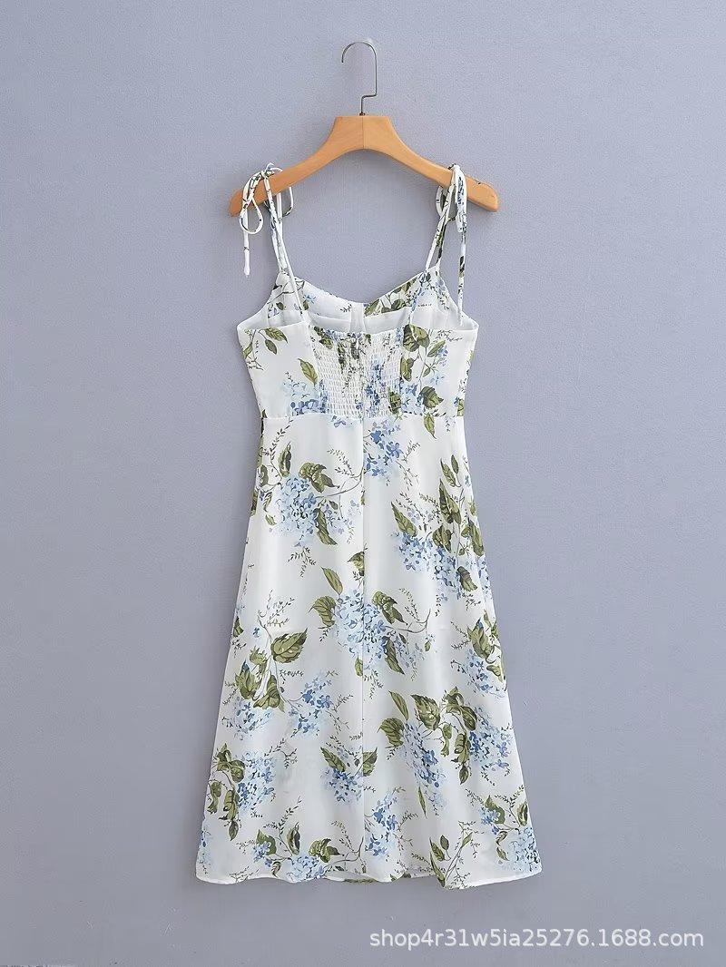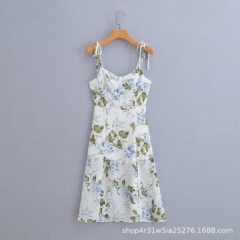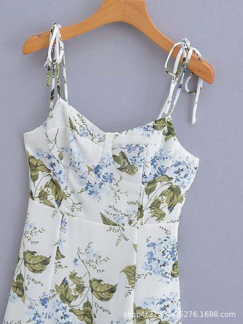 Verano nuevo vestido de mujer francés retro estampado floral con abertura lateral y tirantes de lazo al por mayor