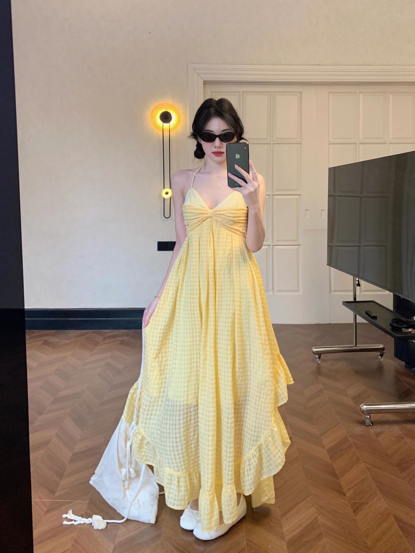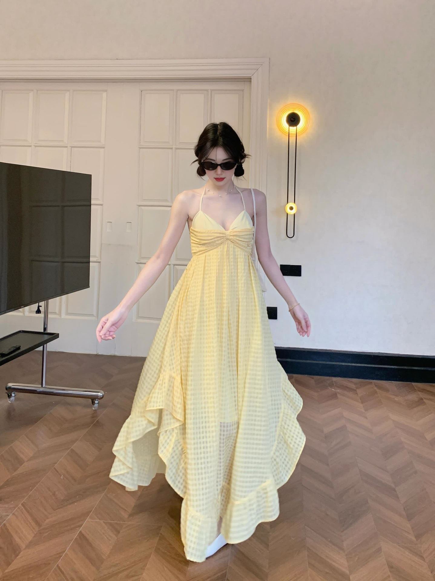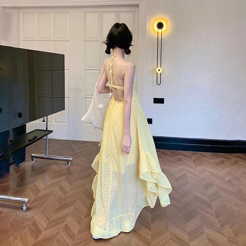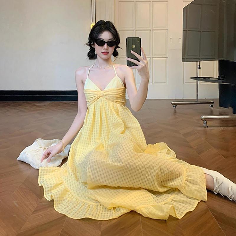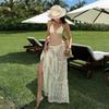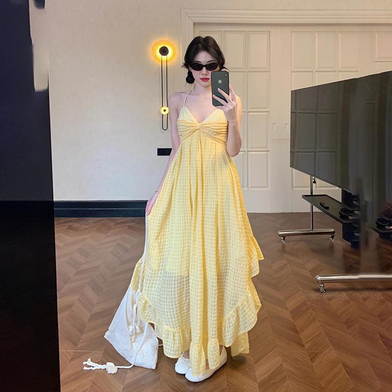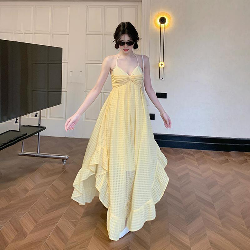 Estilo Vacaciones de Verano Francés Cuello en V Playa Vestido Largo Diseño Nicho Viaje Junto al Mar Sexy Vestido de Tirantes para Mujer