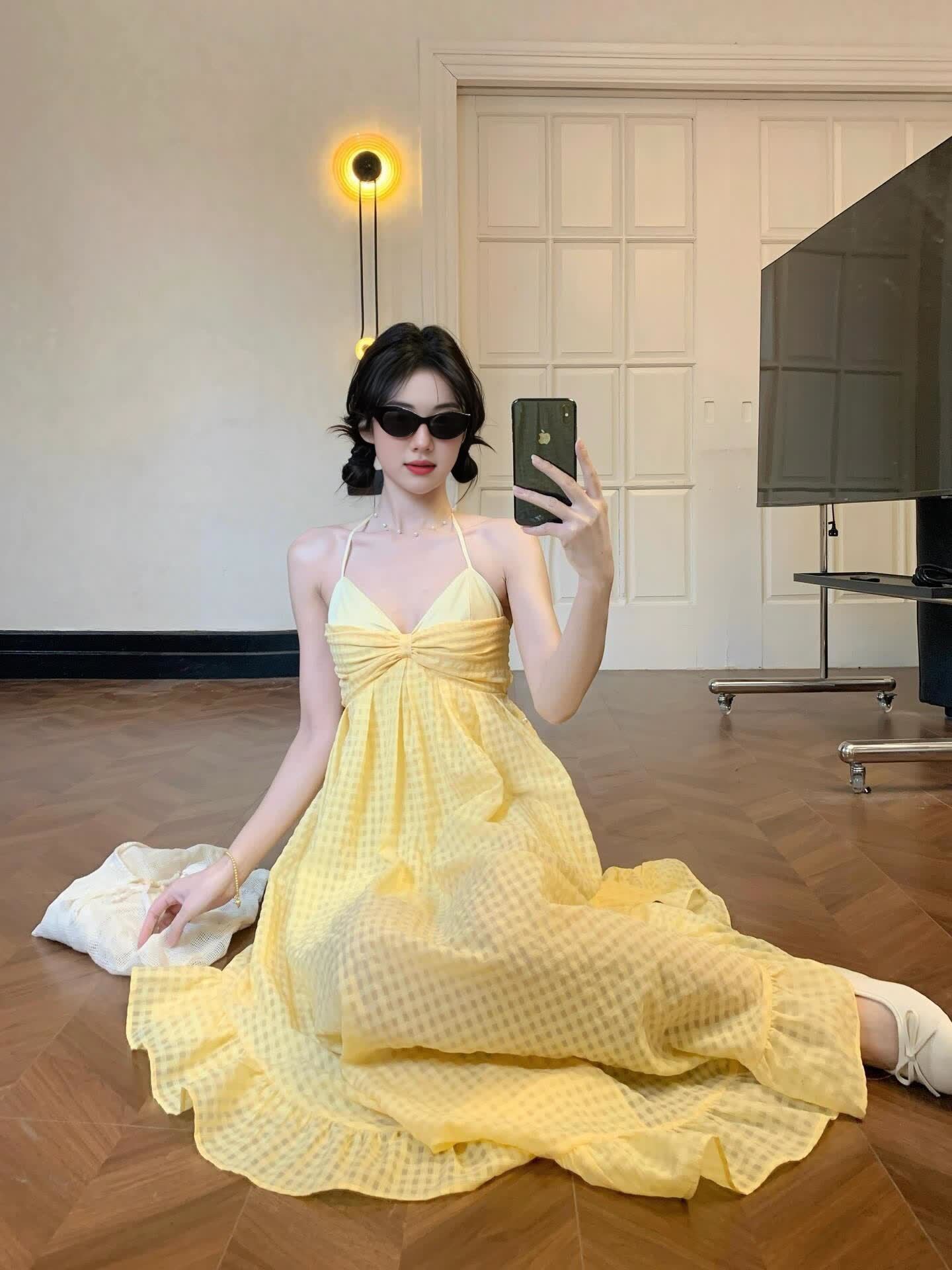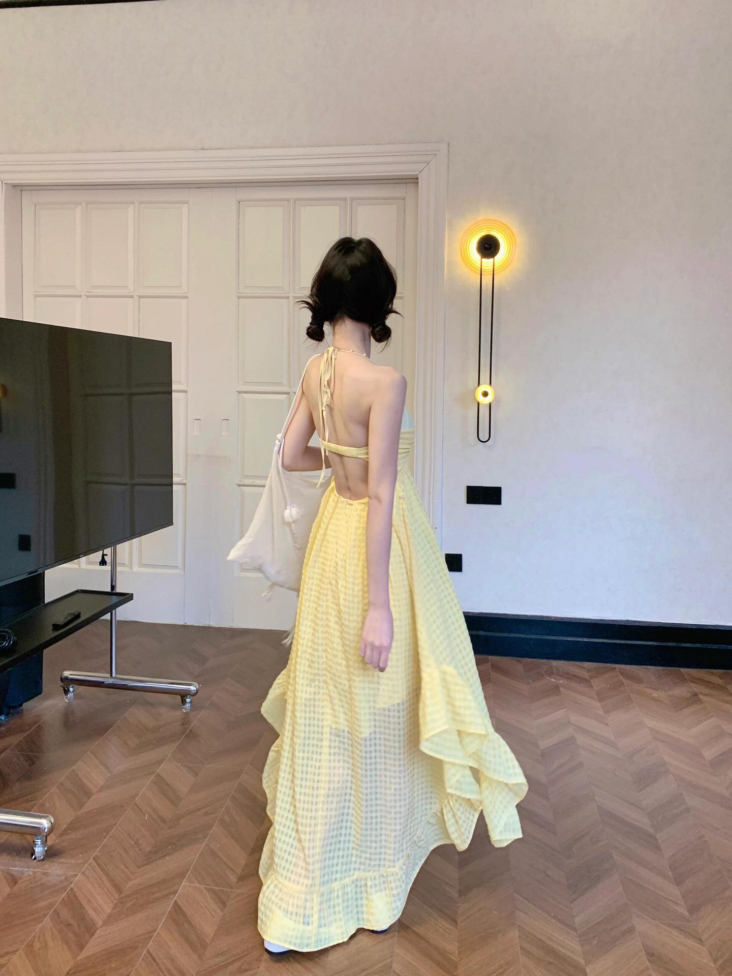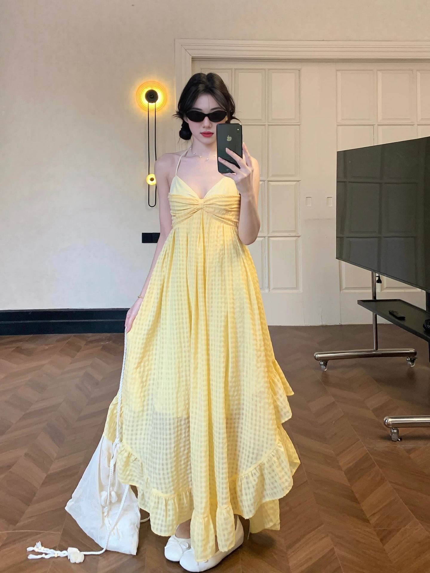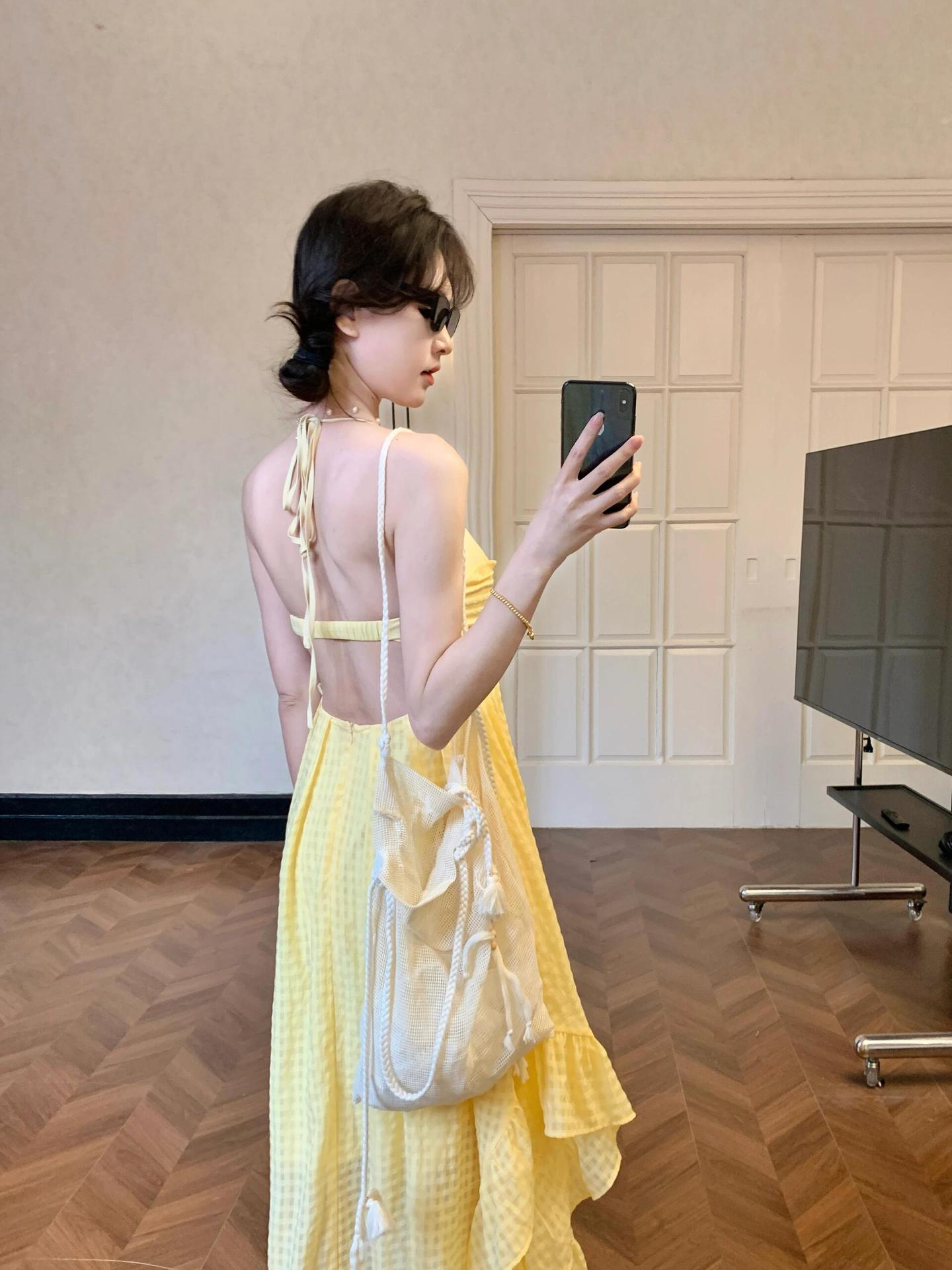 Estilo Vacaciones de Verano Francés Cuello en V Playa Vestido Largo Diseño Nicho Viaje Junto al Mar Sexy Vestido de Tirantes para Mujer