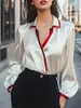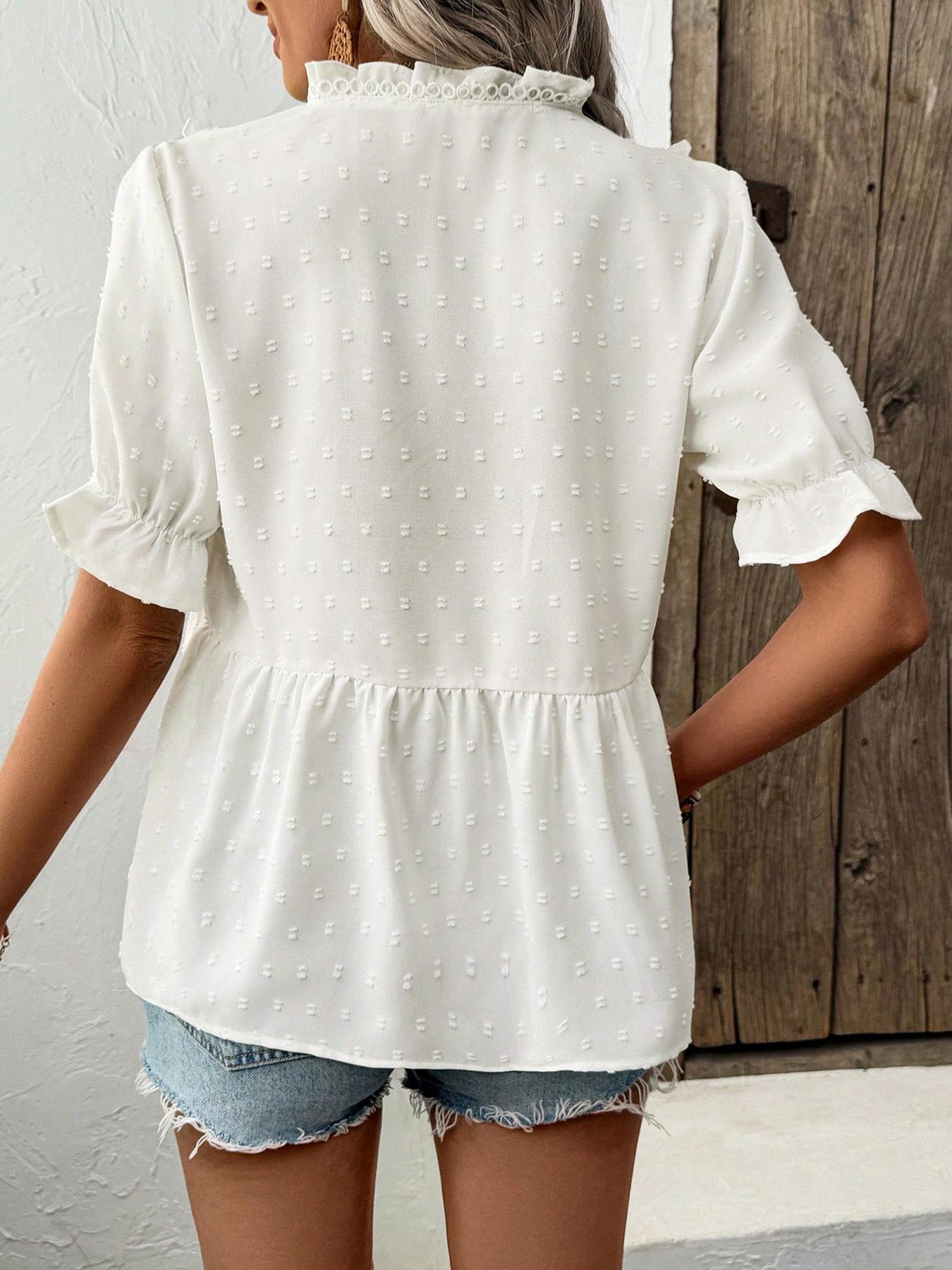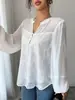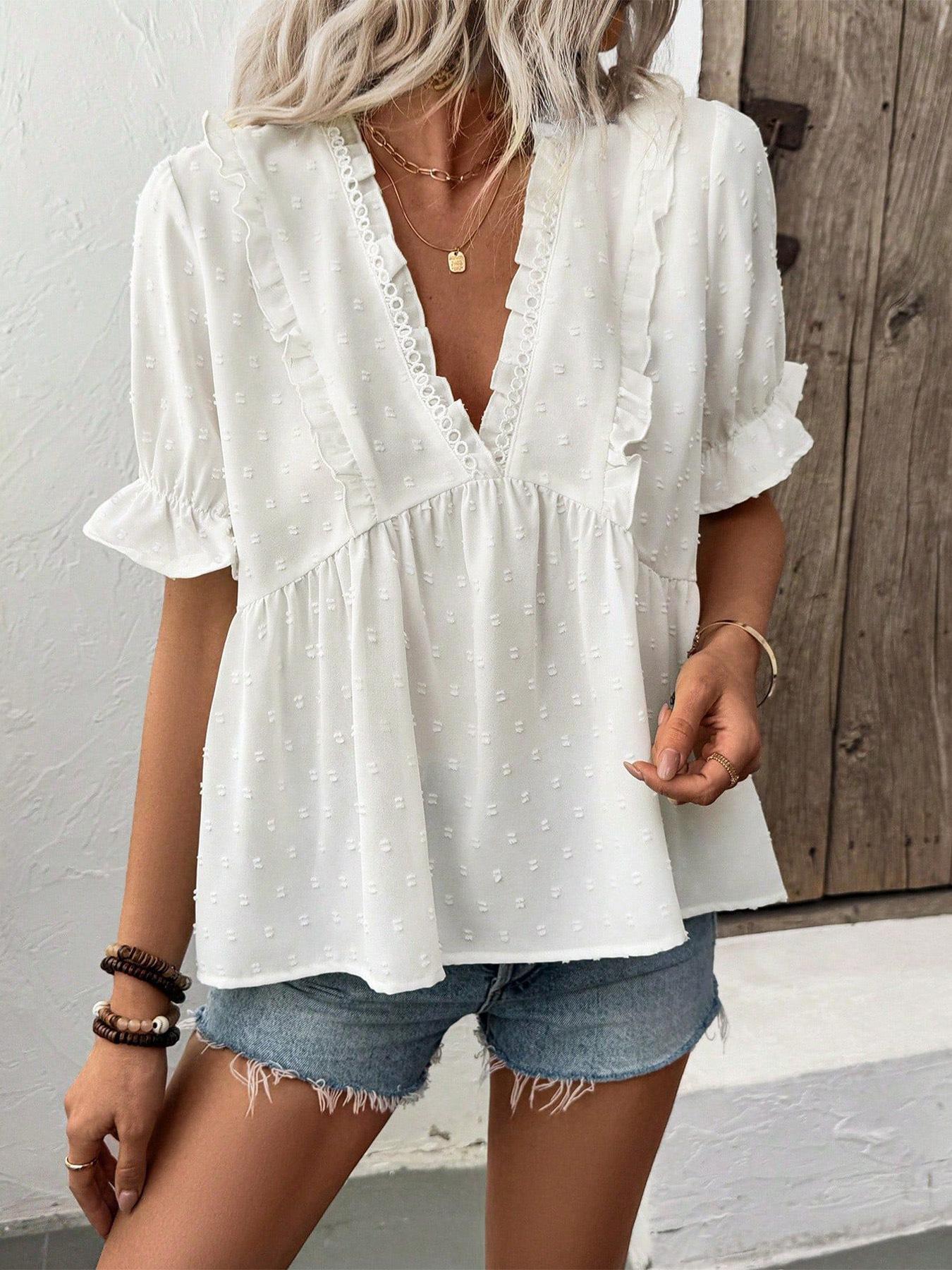 Moda elegante europea y americana 2025 color sólido cuello en V manga corta encaje patchwork blusa de encaje