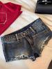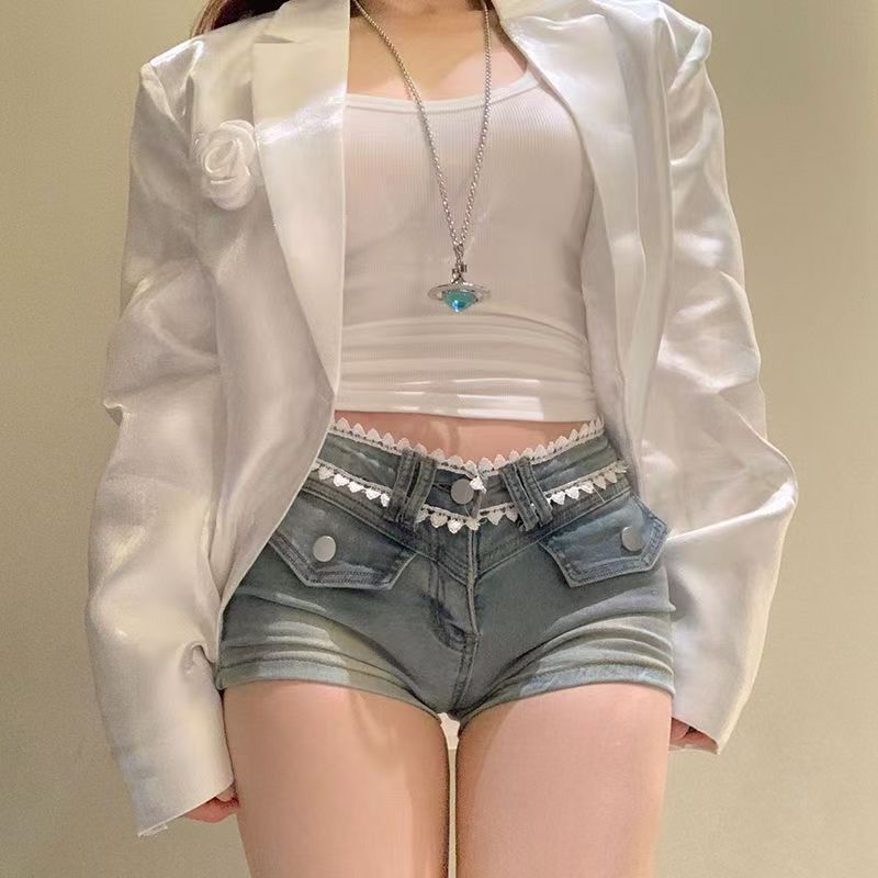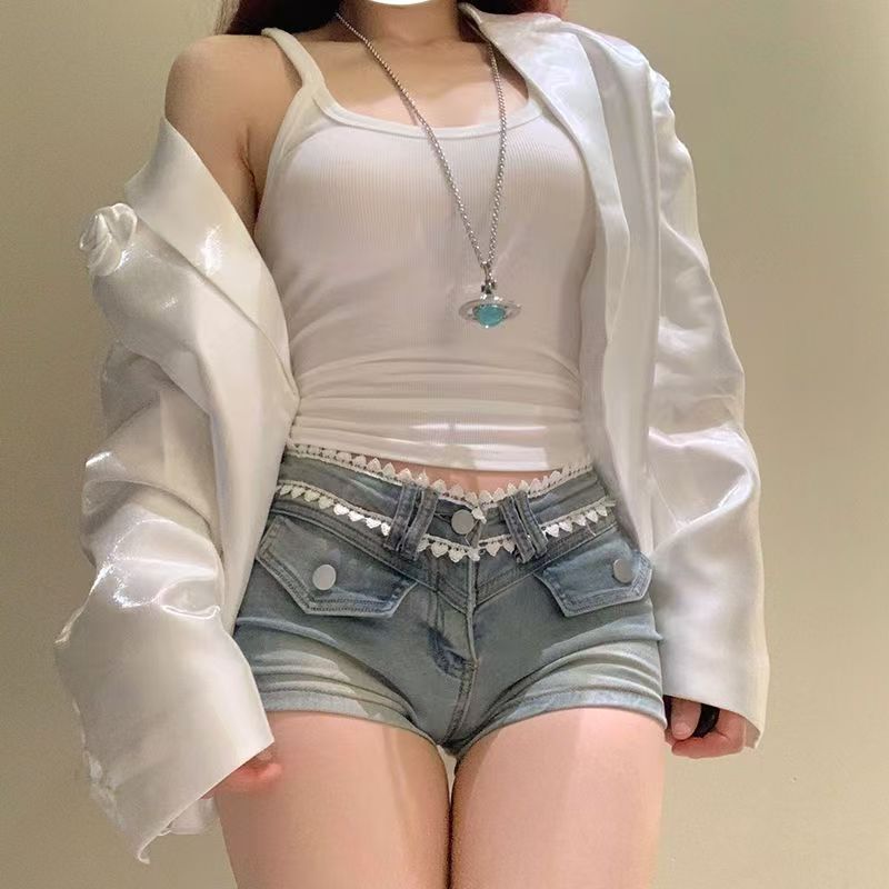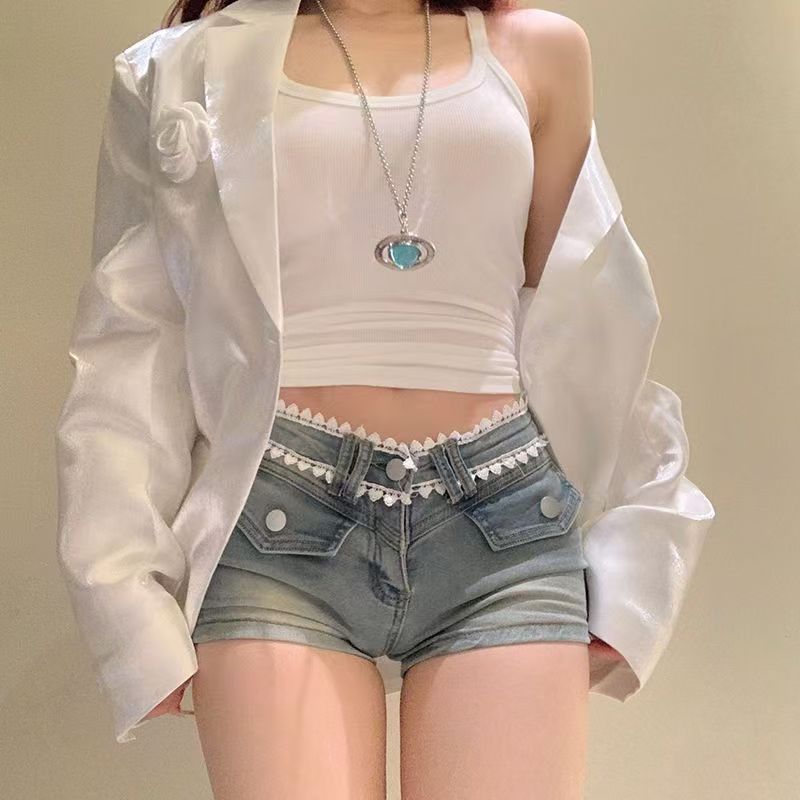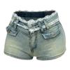 Verano Nuevo Ajustado Chica Picante Sexy Retro Versátil Mezclilla Patchwork Tiro Bajo Shorts Ajustados Rectos Lavados Pantalones Cortos Hot