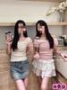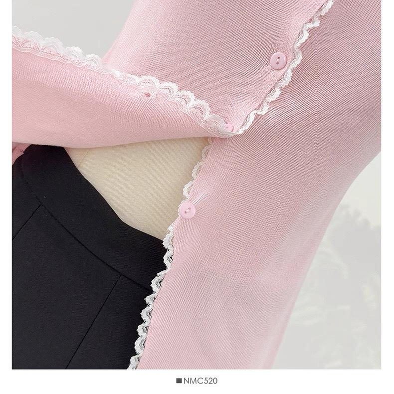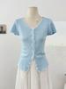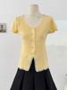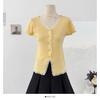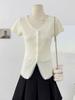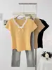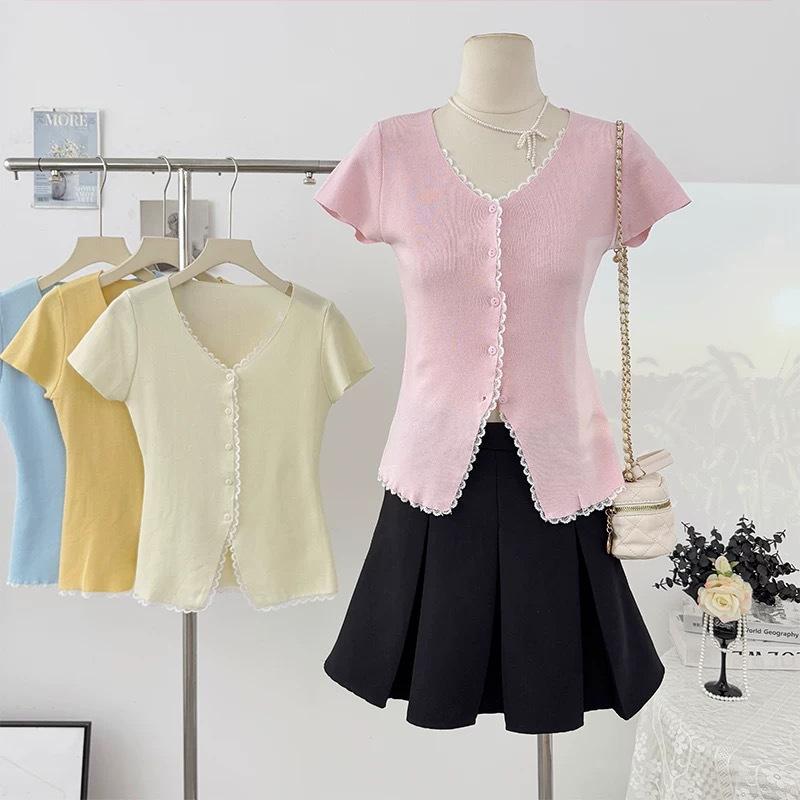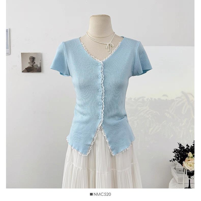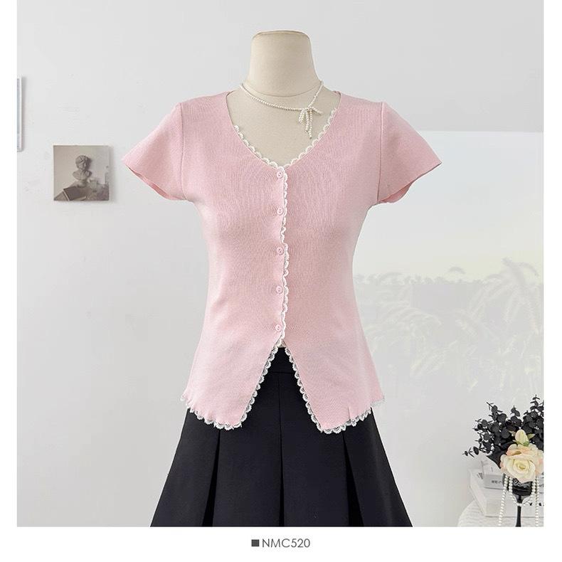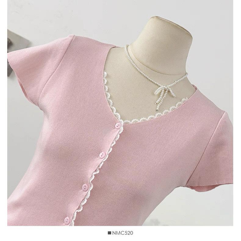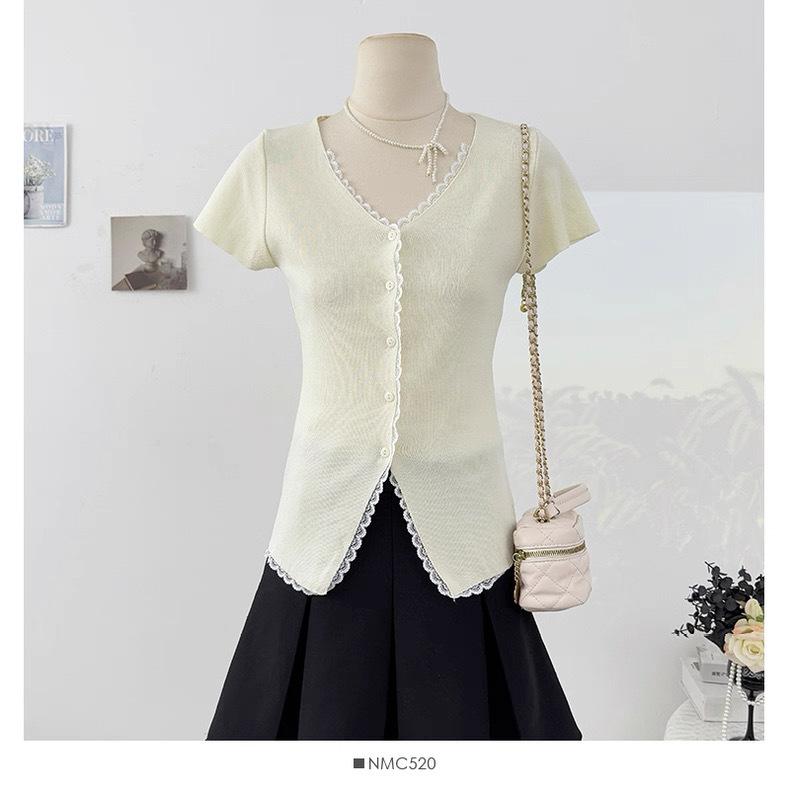 Tejido de punto de manga corta con cuello en V y empalme de encaje francés para mujer Diseño de verano Top ajustado con abertura y abotonadura sencilla