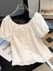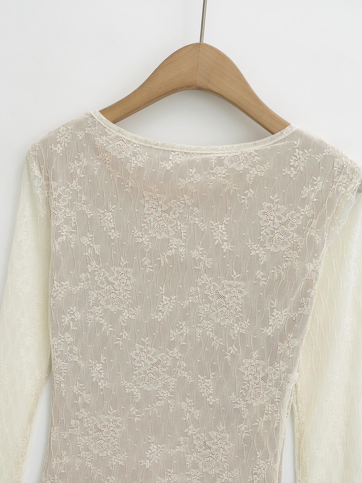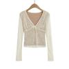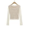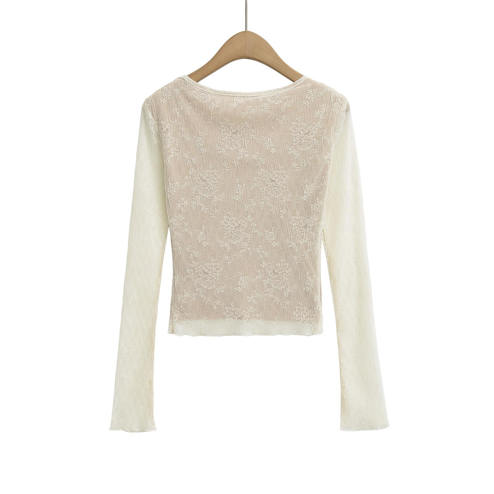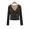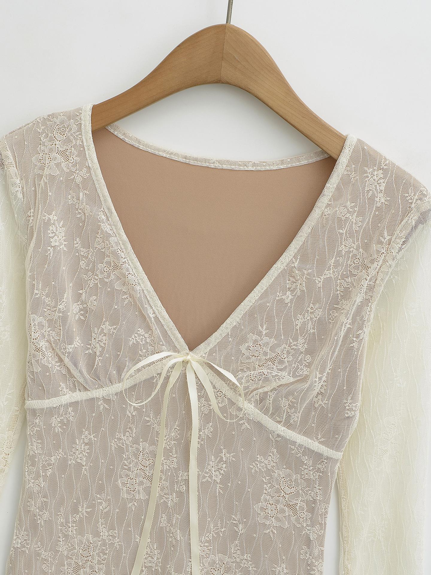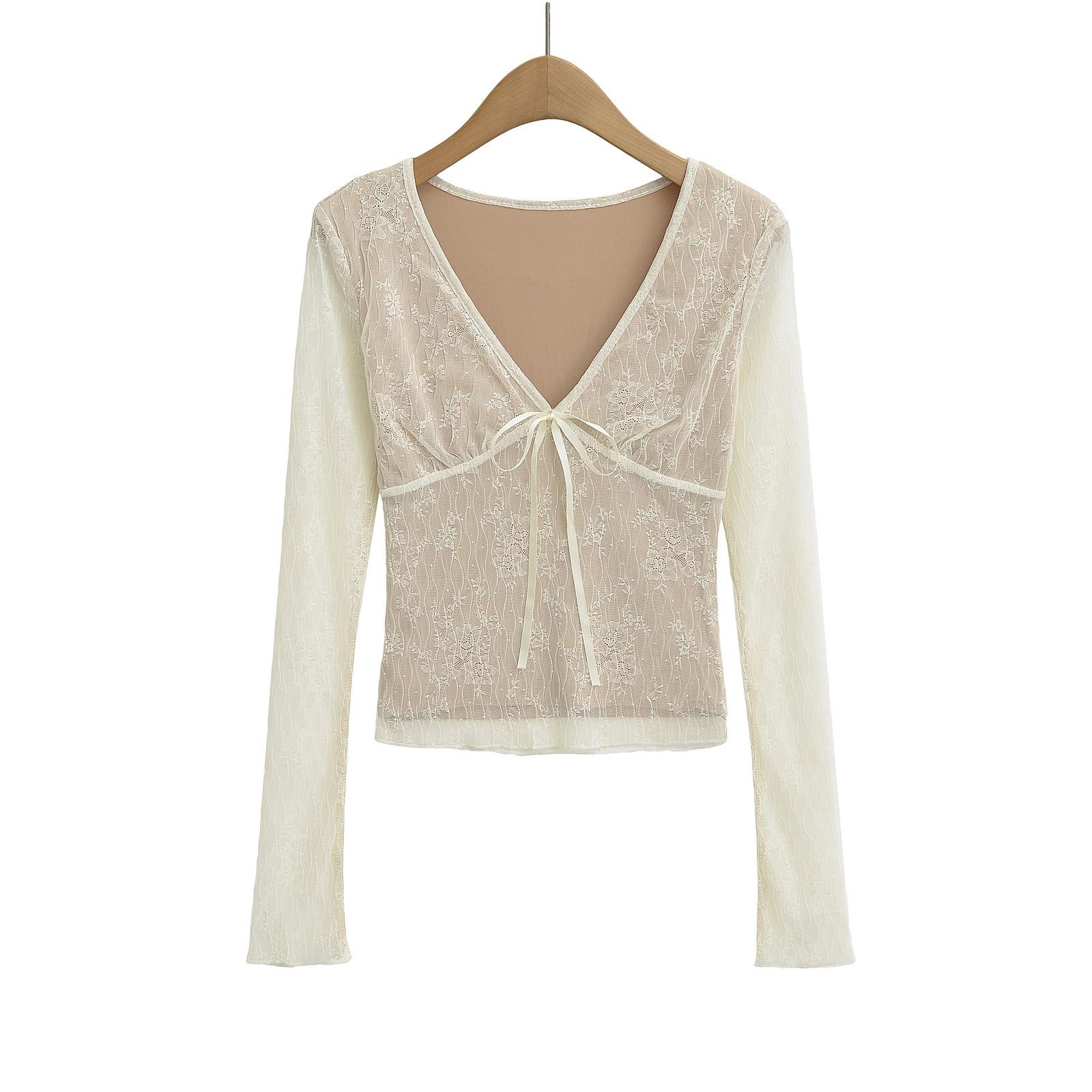 2522-25 Estilo de Verano Deseo Puro Chica Caliente Cuello en V Lazo Encaje Manga Larga Camiseta para Mujer Corte Ajustado Corto Hombro Regular Top
