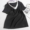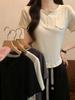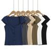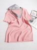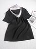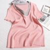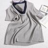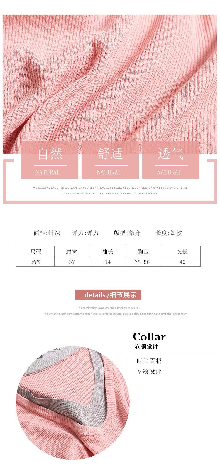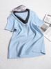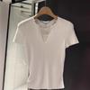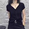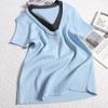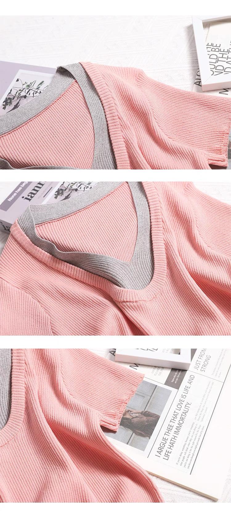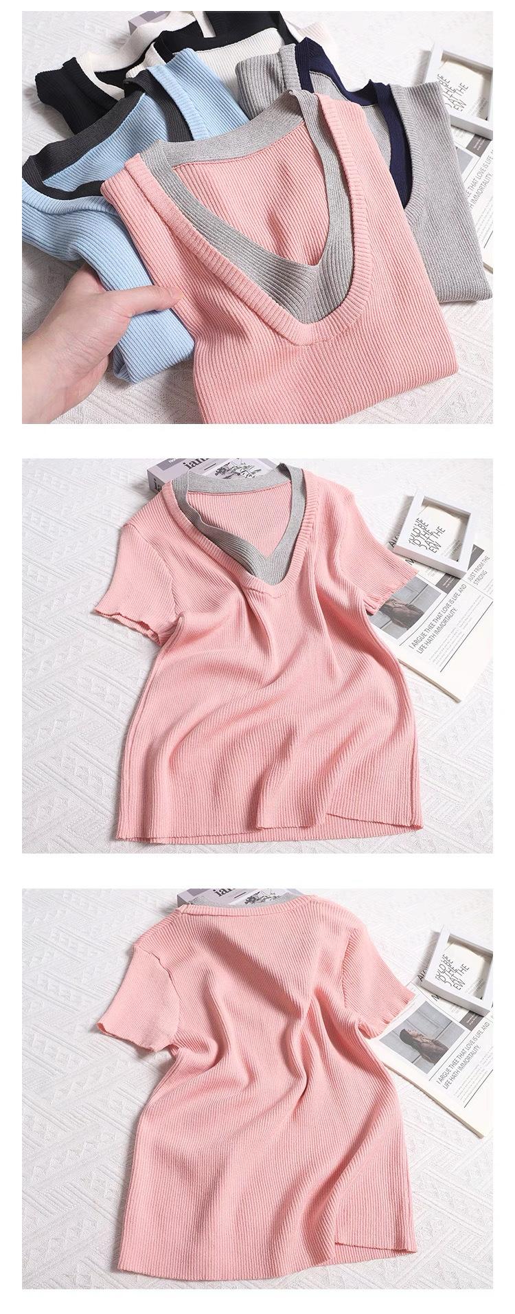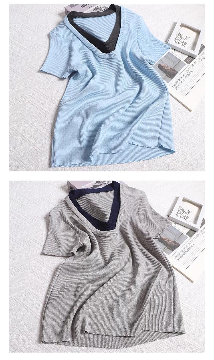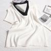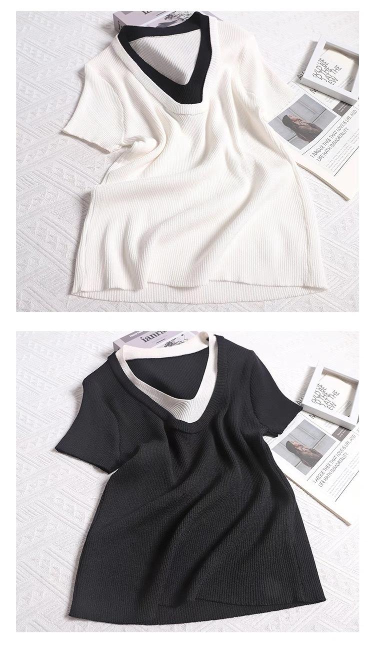 Suéter de punto de manga corta con cuello en V de color contrastante para mujer, verano, nuevo diseño, sentido, pequeño, ajustado, top ajustado para mujer