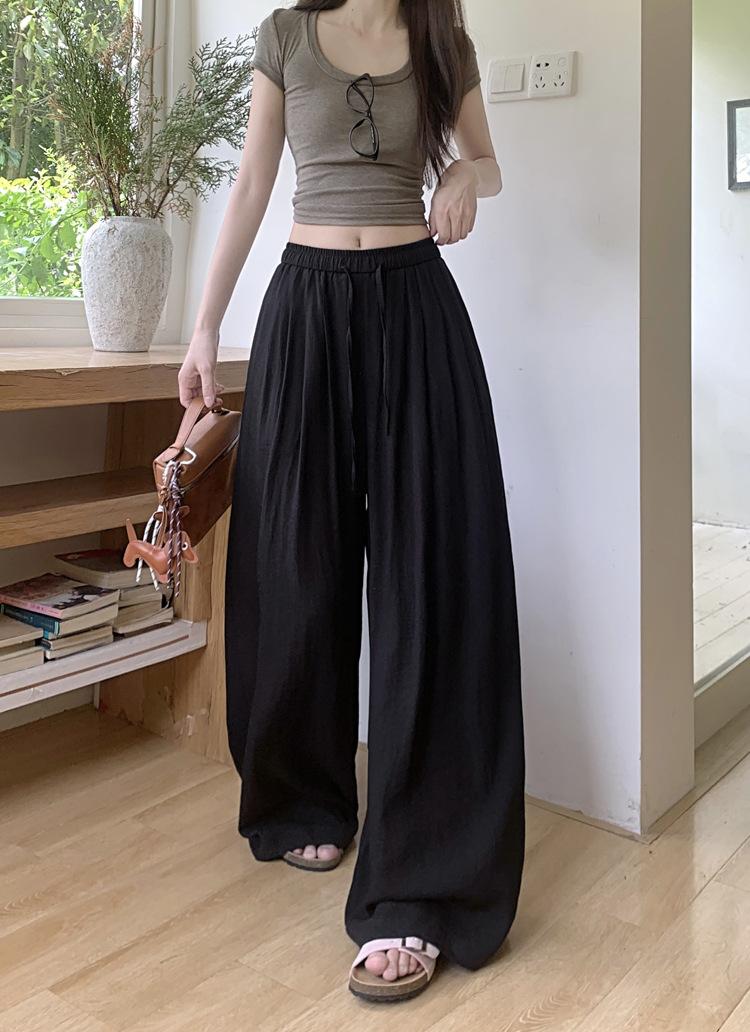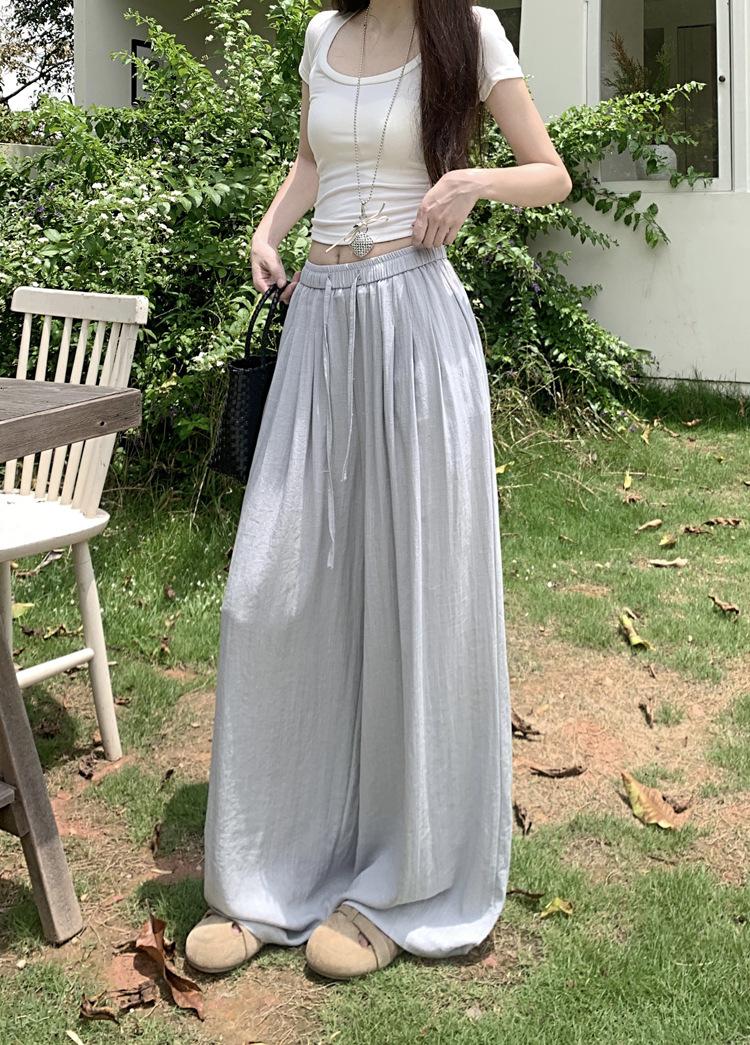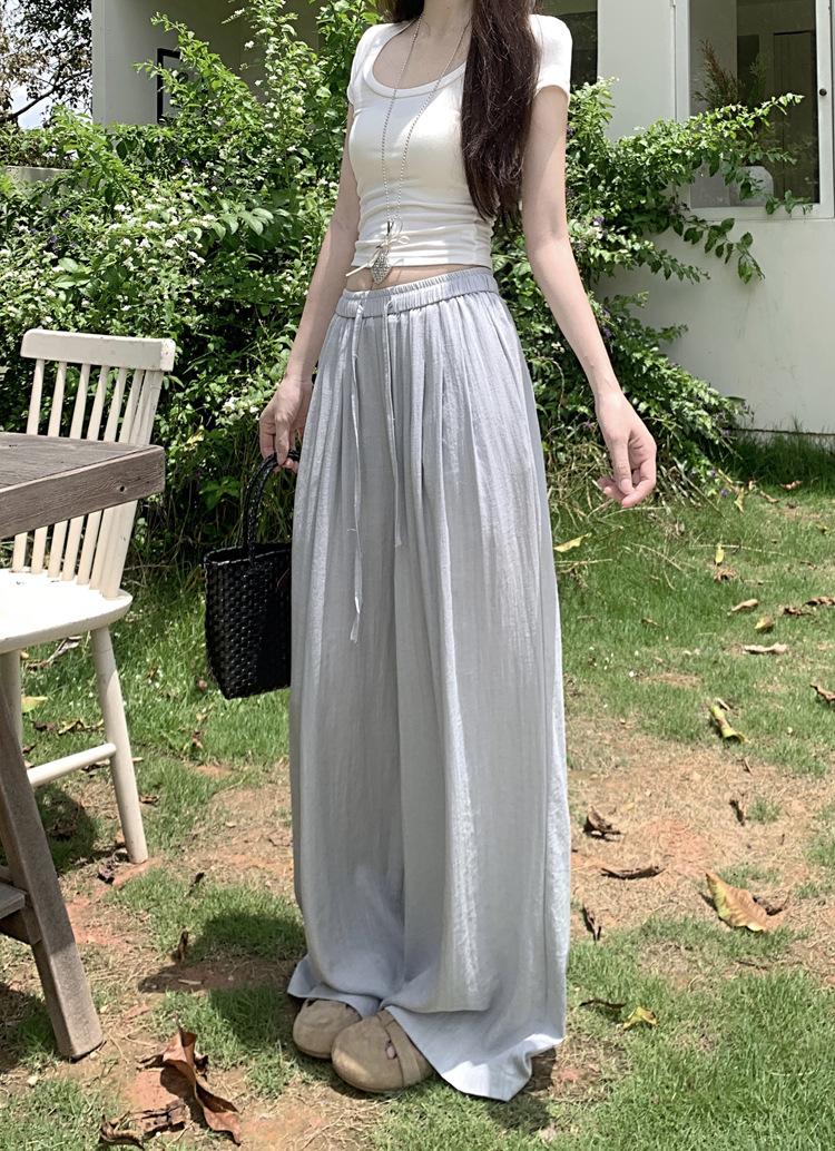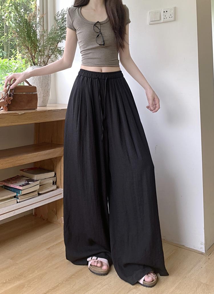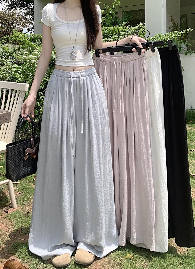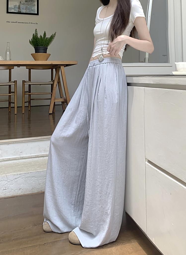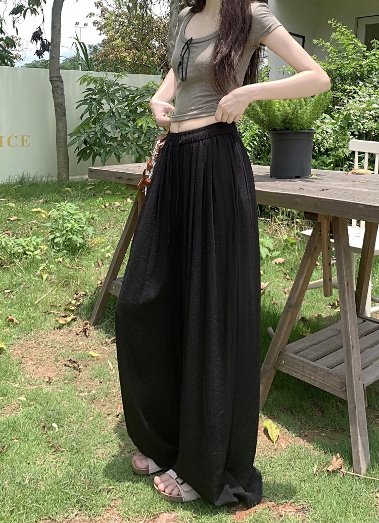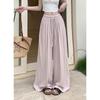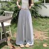 Foto real de pantalones casuales de seda de hielo para mujer, pantalones de verano con cintura elástica, pantalones adelgazantes de pierna ancha, pantalones sueltos drapeados hasta el suelo