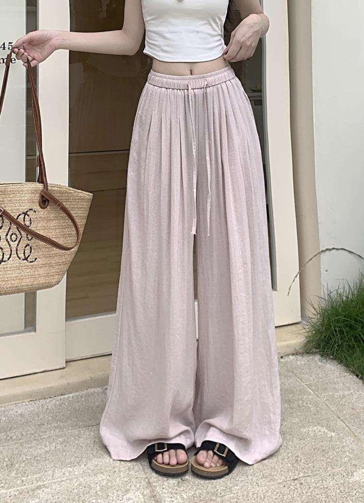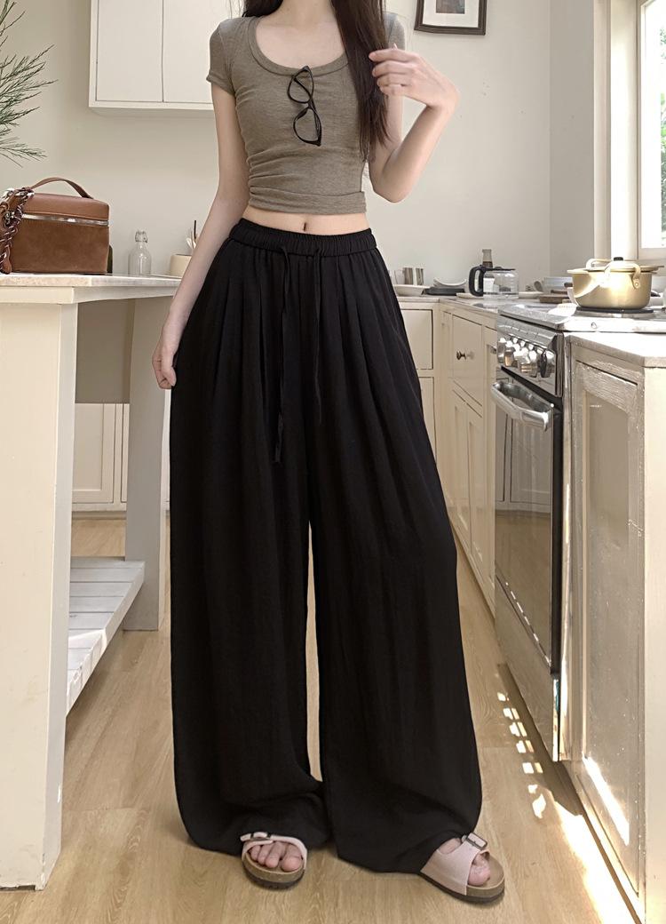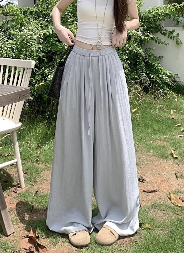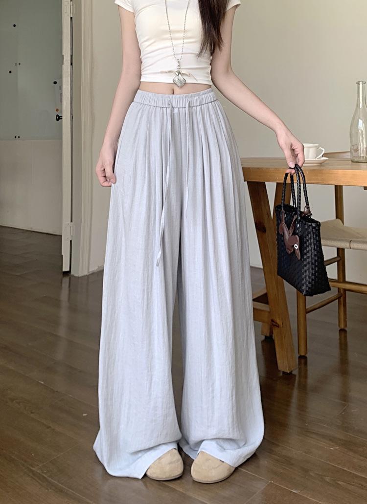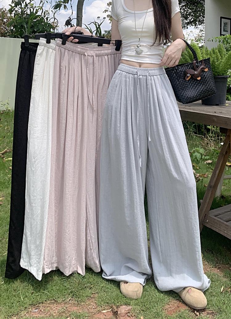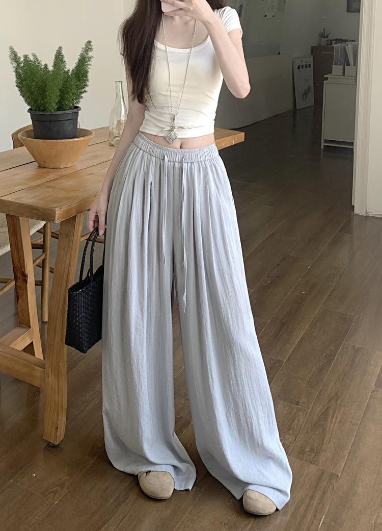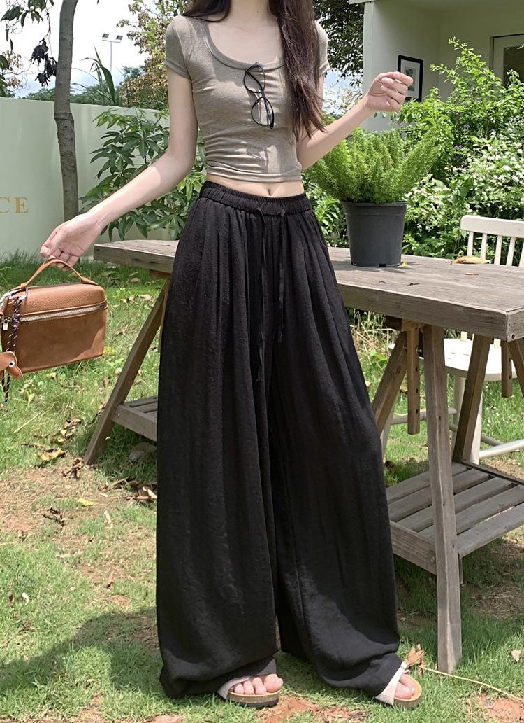 Foto real de pantalones casuales de seda de hielo para mujer, pantalones de verano con cintura elástica, pantalones adelgazantes de pierna ancha, pantalones sueltos drapeados hasta el suelo