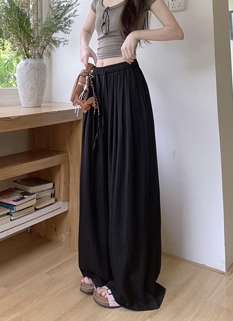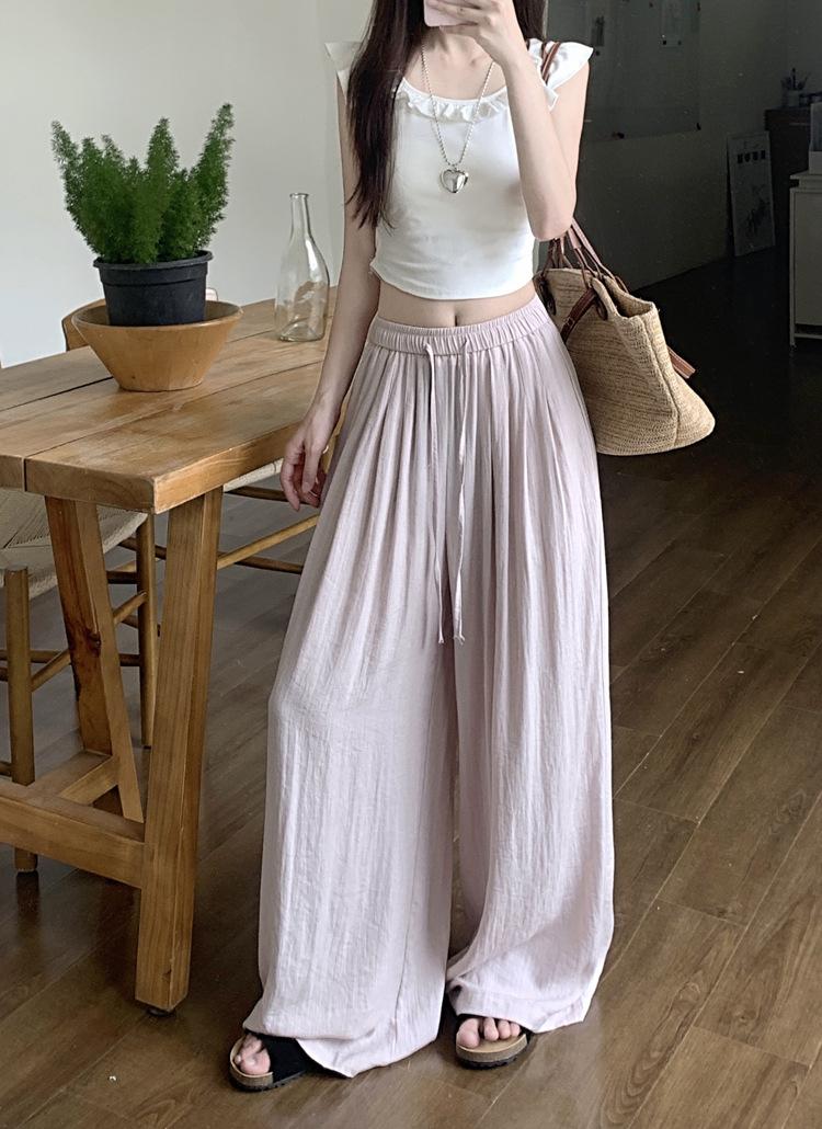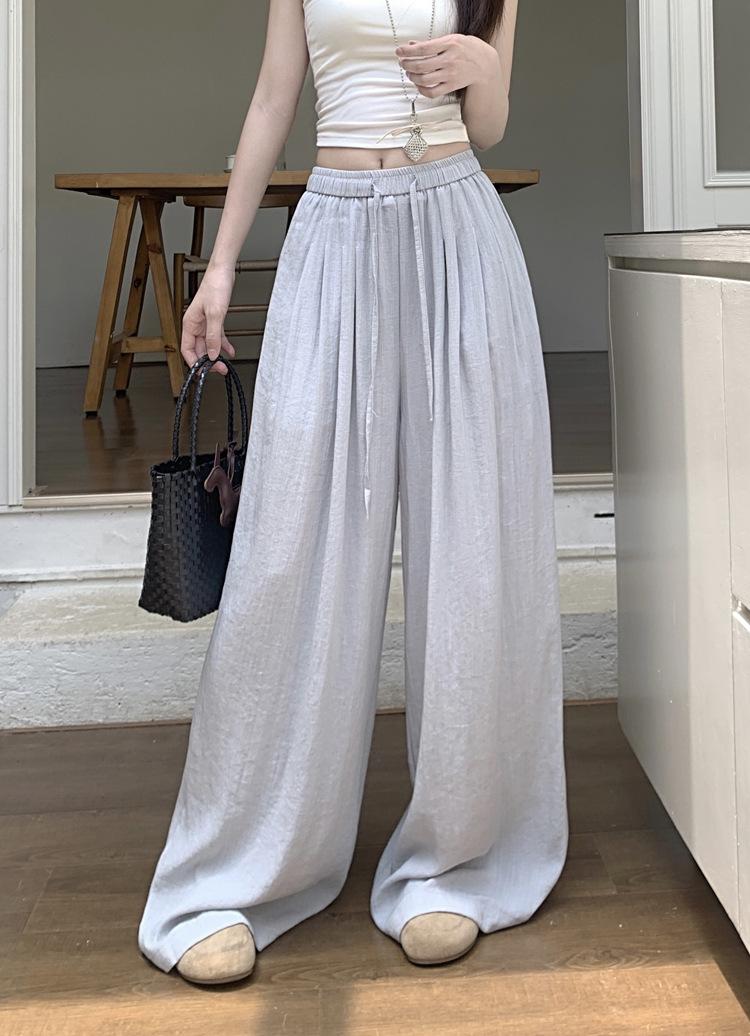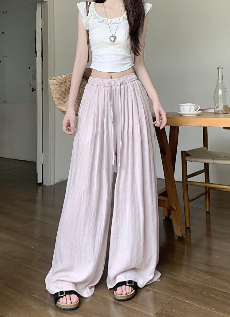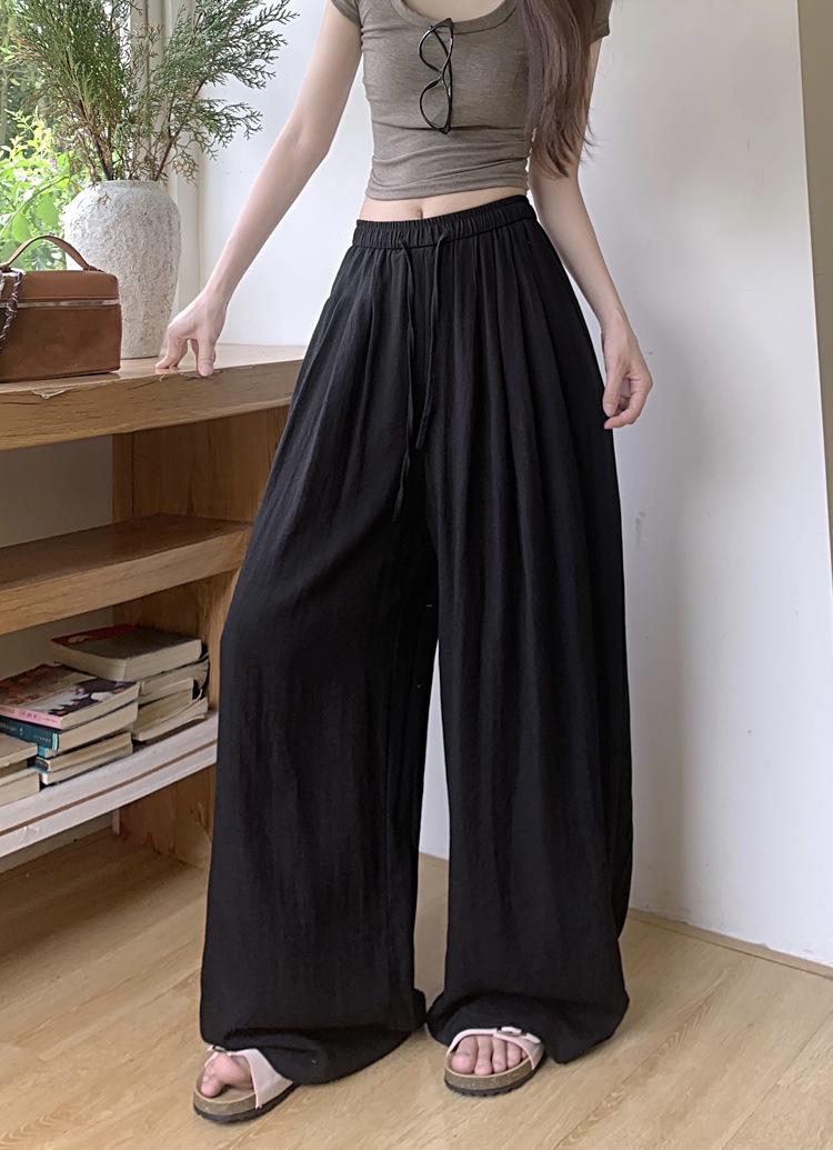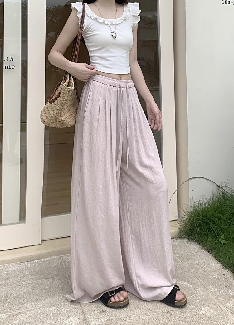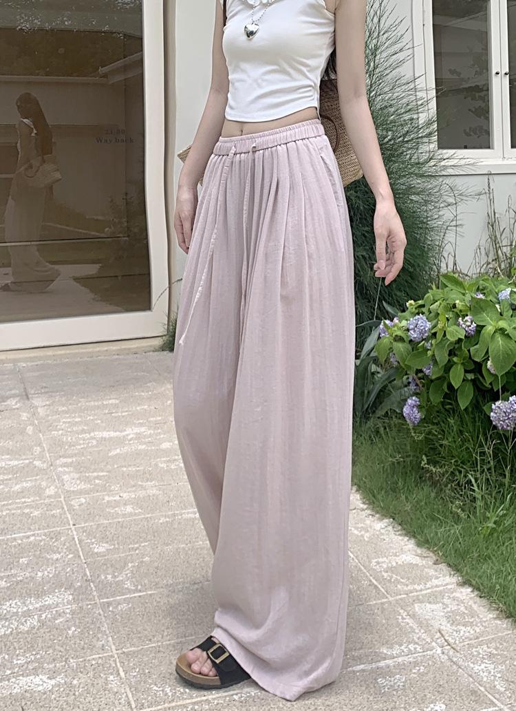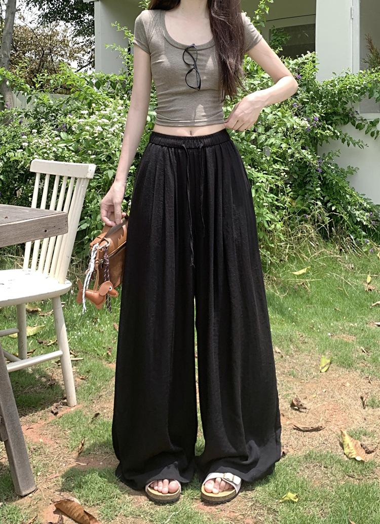 Foto real de pantalones casuales de seda de hielo para mujer, pantalones de verano con cintura elástica, pantalones adelgazantes de pierna ancha, pantalones sueltos drapeados hasta el suelo