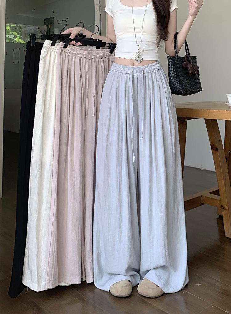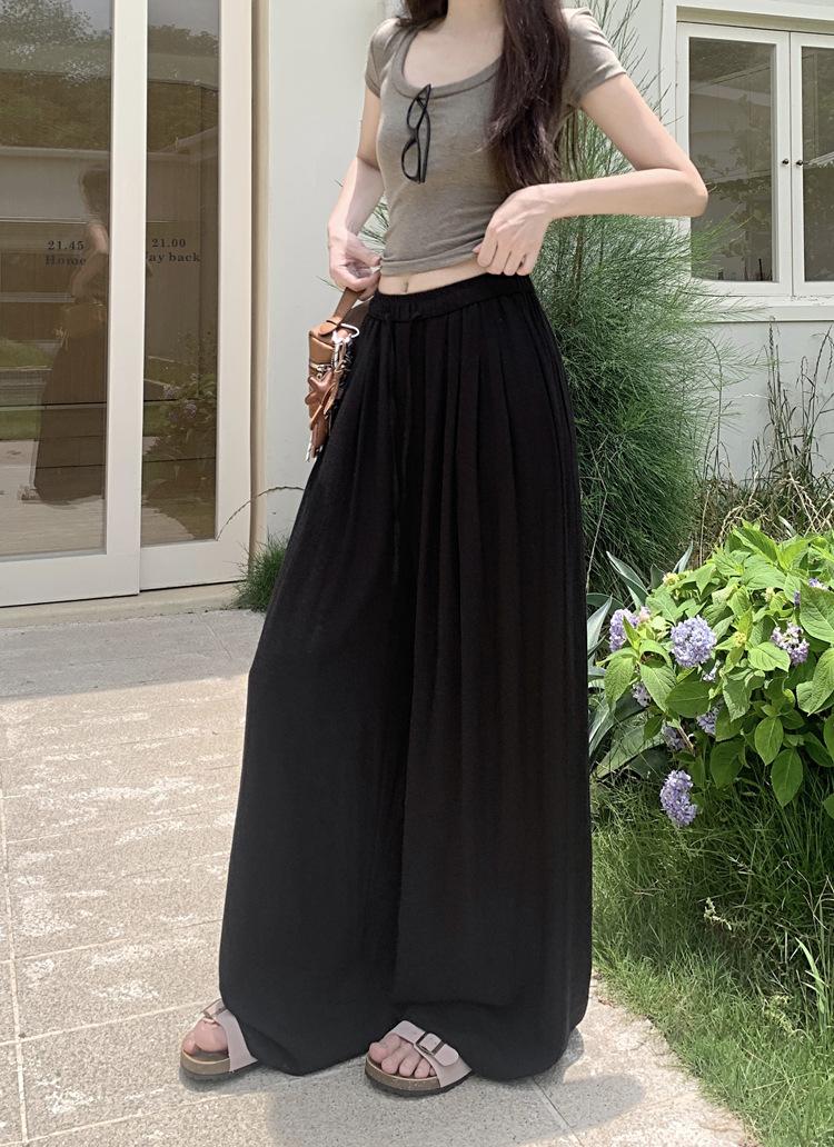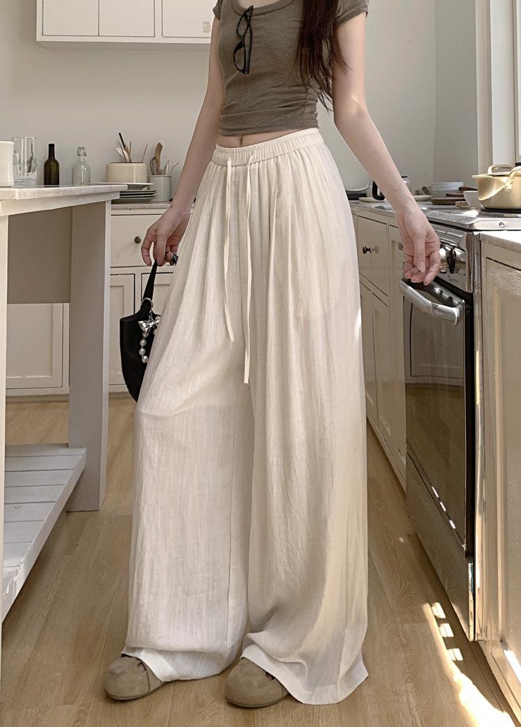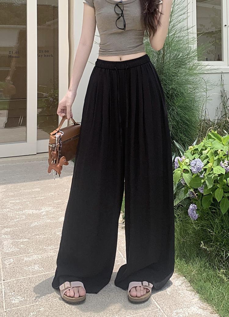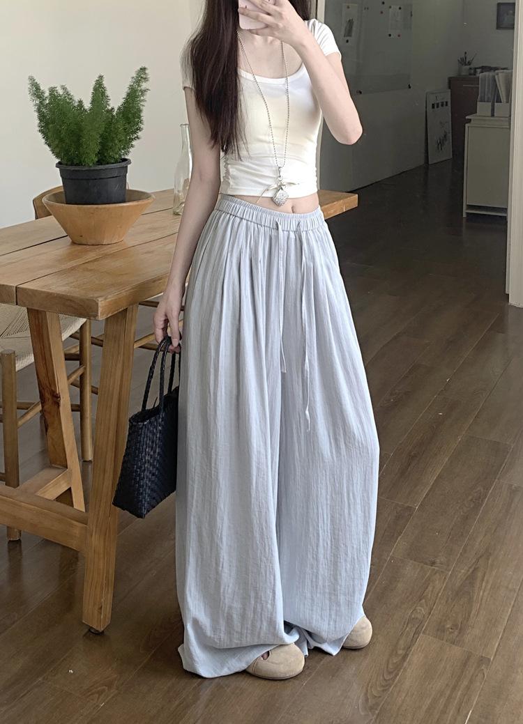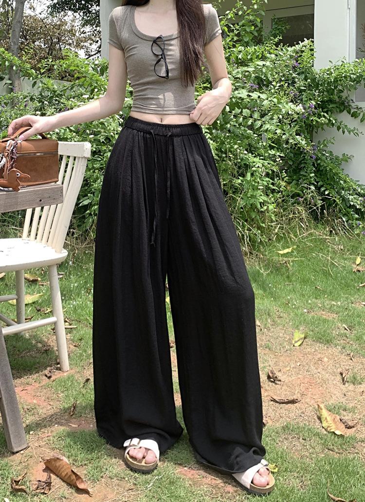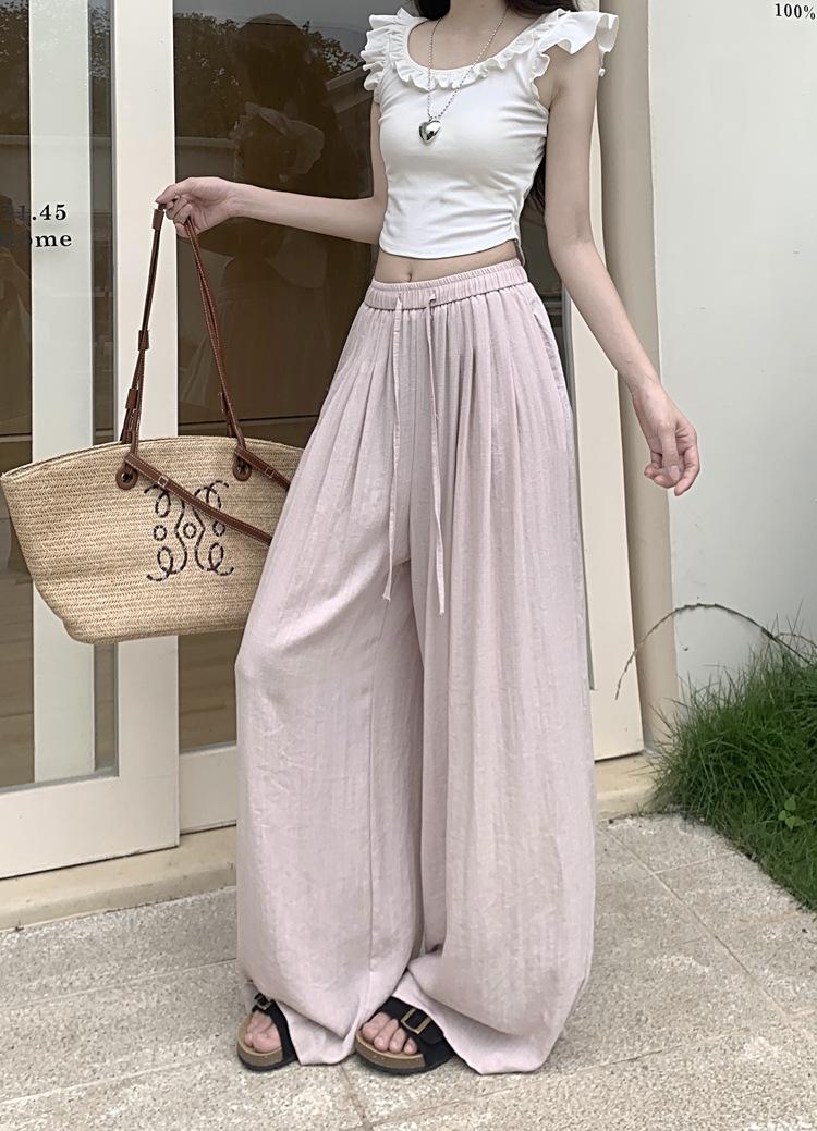 Foto real de pantalones casuales de seda de hielo para mujer, pantalones de verano con cintura elástica, pantalones adelgazantes de pierna ancha, pantalones sueltos drapeados hasta el suelo