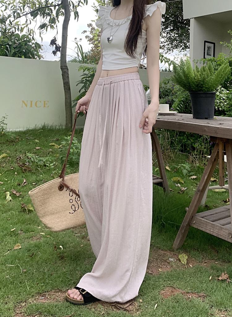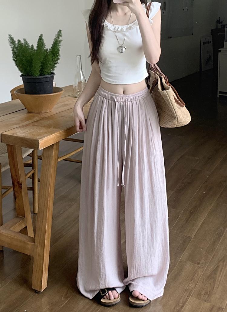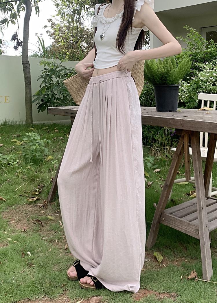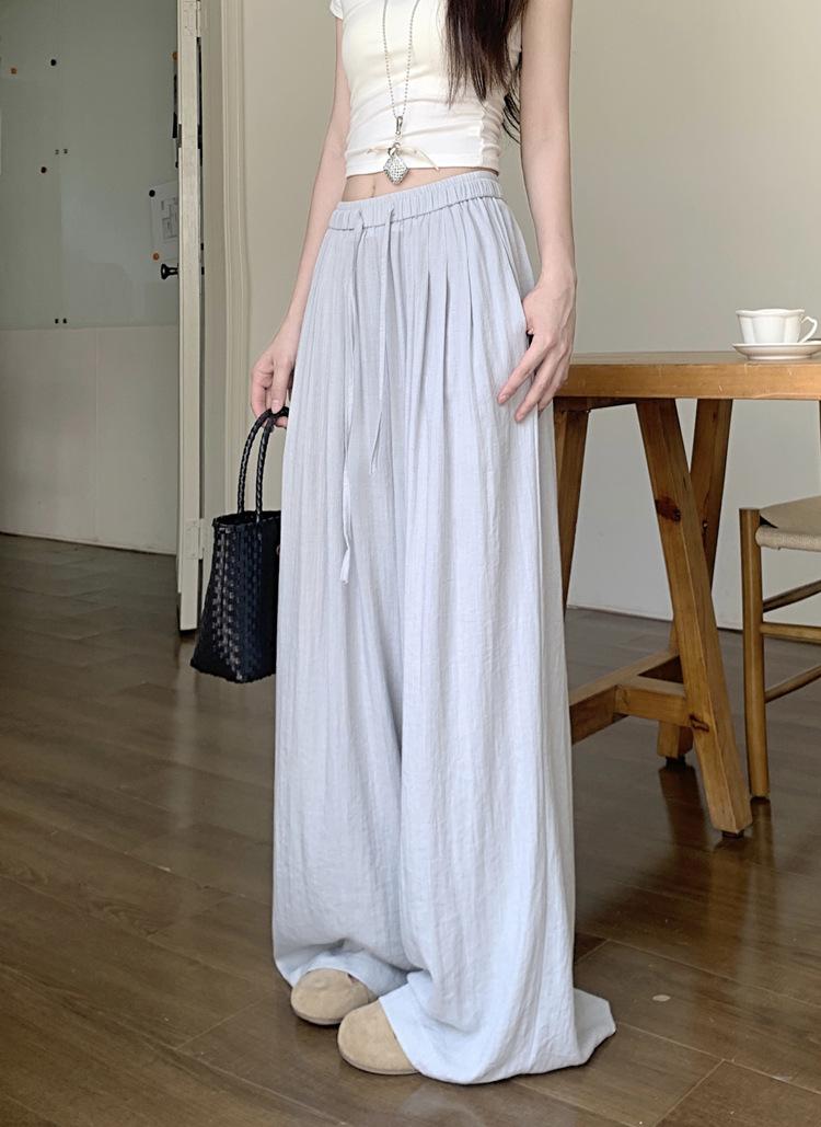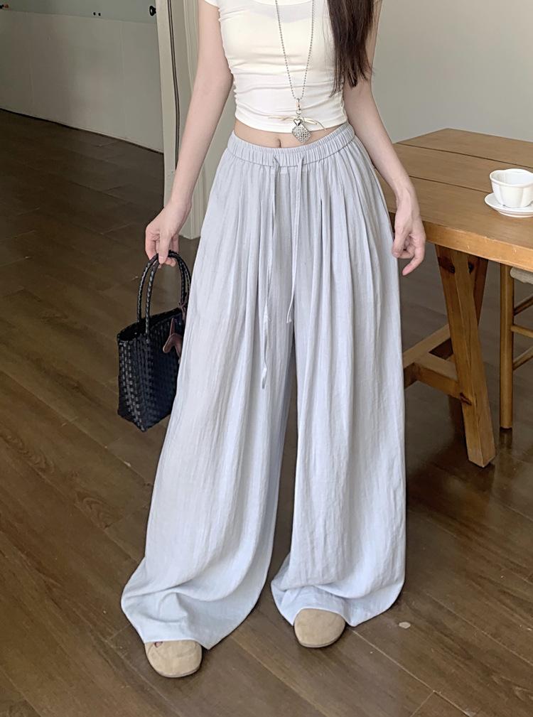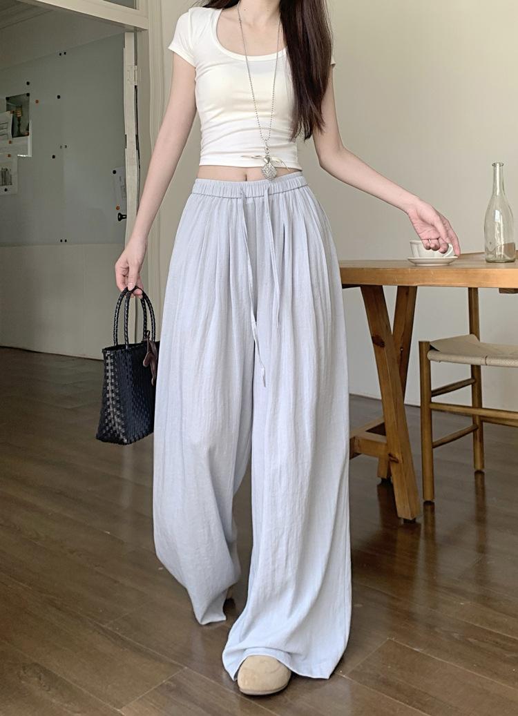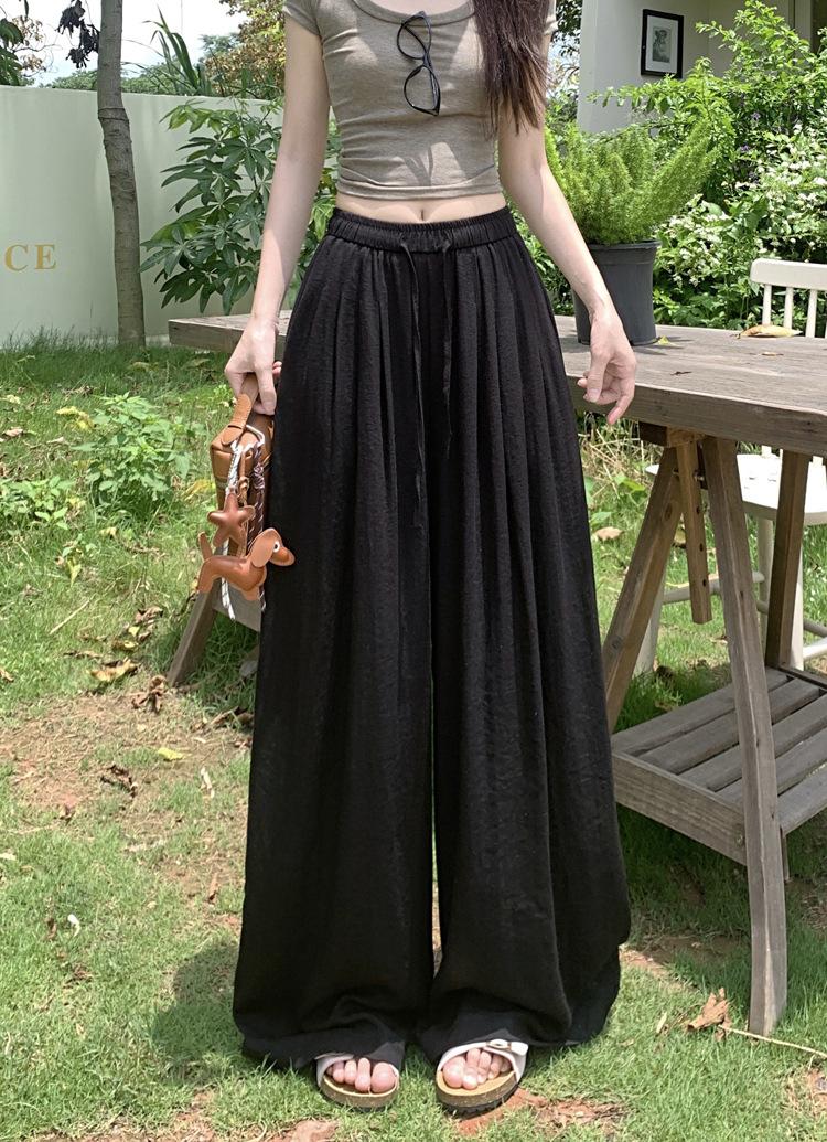 Foto real de pantalones casuales de seda de hielo para mujer, pantalones de verano con cintura elástica, pantalones adelgazantes de pierna ancha, pantalones sueltos drapeados hasta el suelo