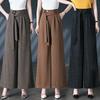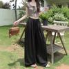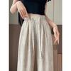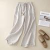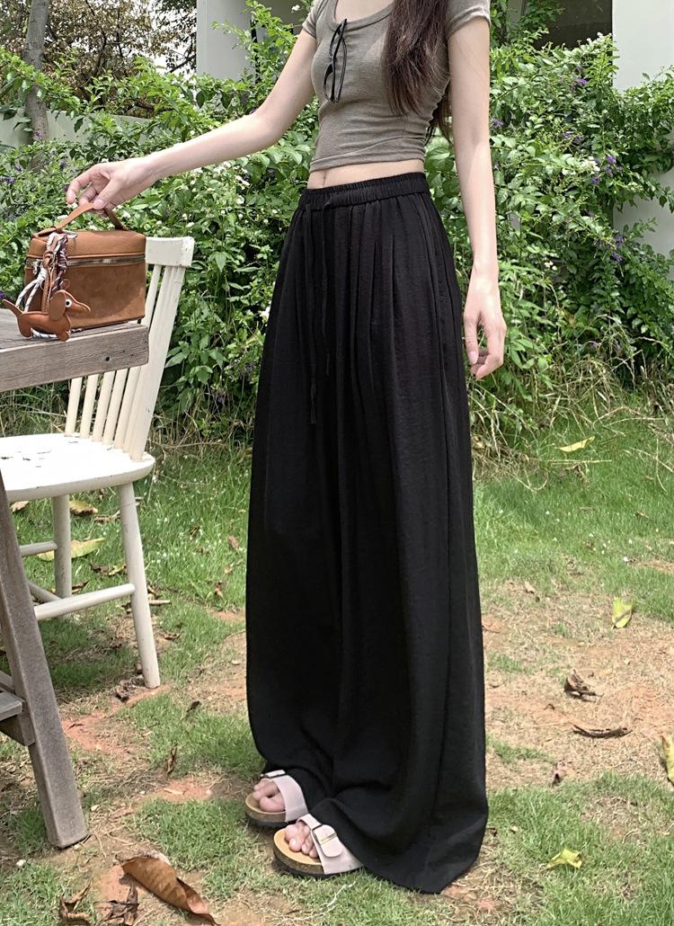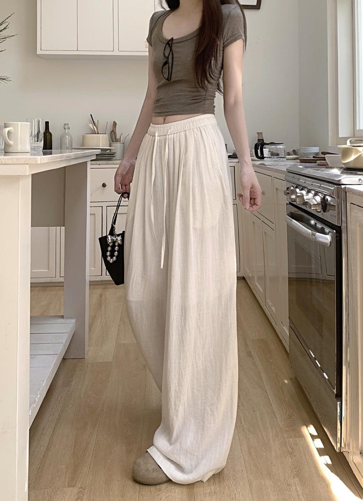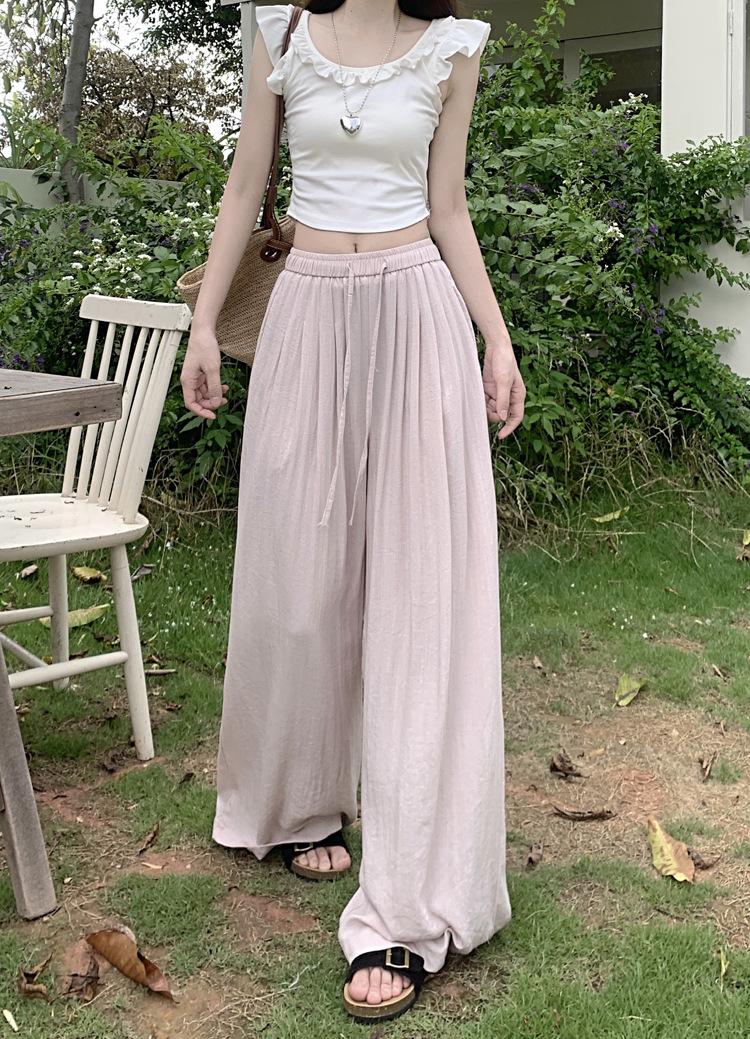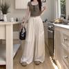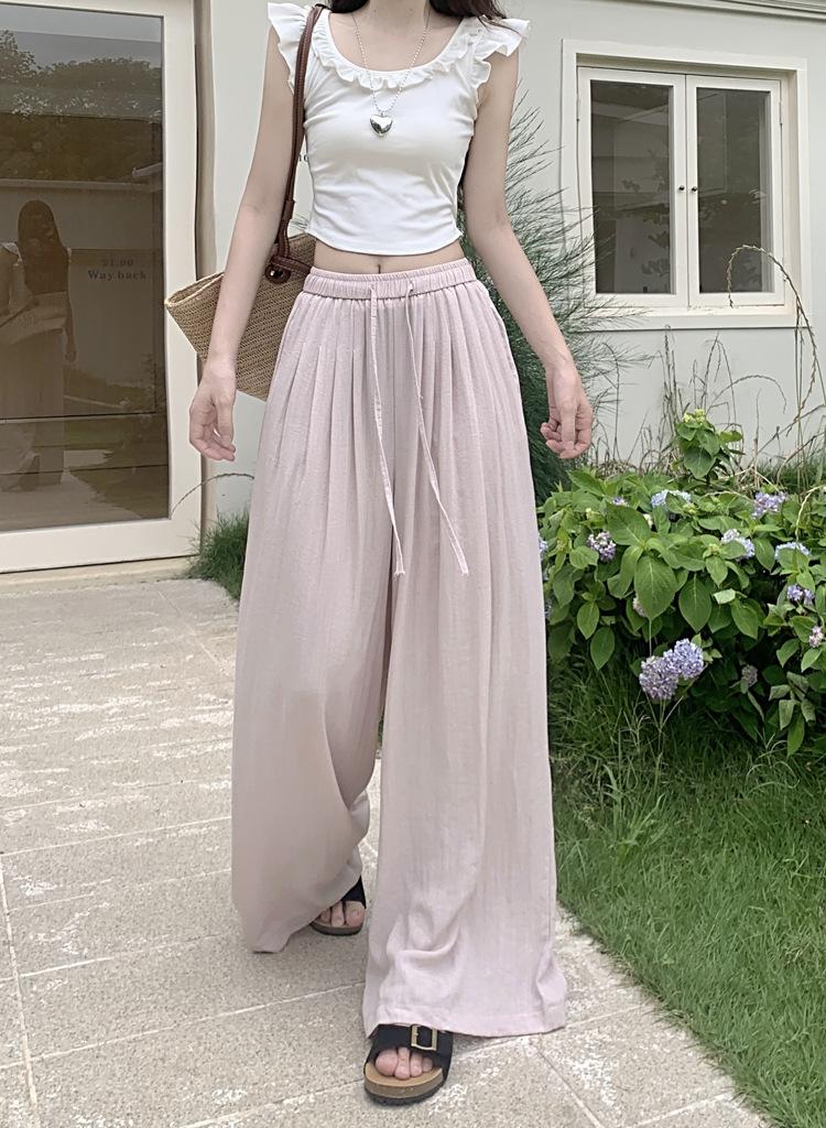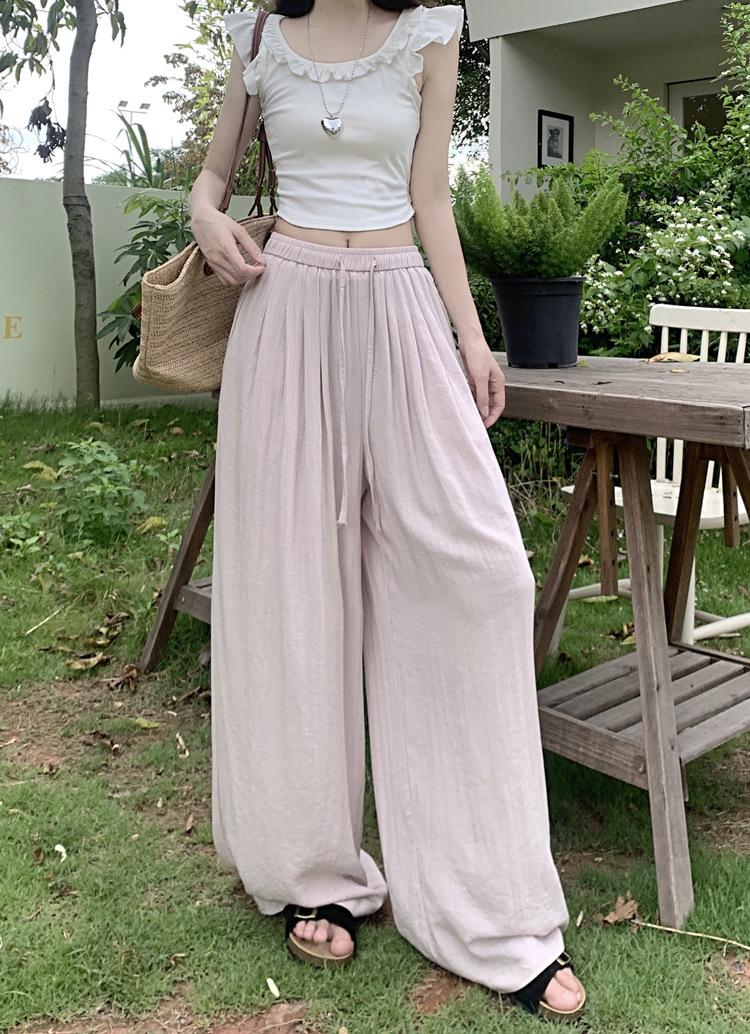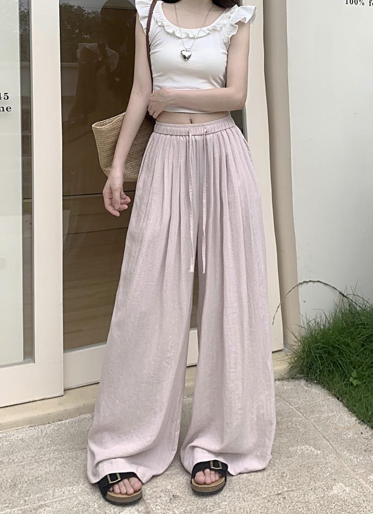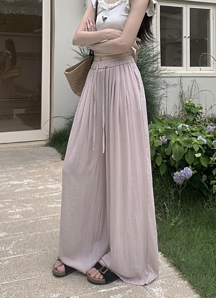 Foto real de pantalones casuales de seda de hielo para mujer, pantalones de verano con cintura elástica, pantalones adelgazantes de pierna ancha, pantalones sueltos drapeados hasta el suelo