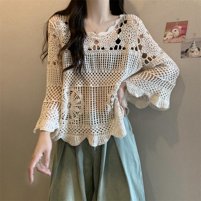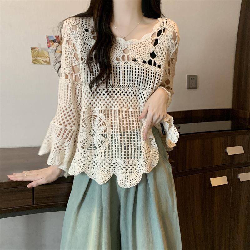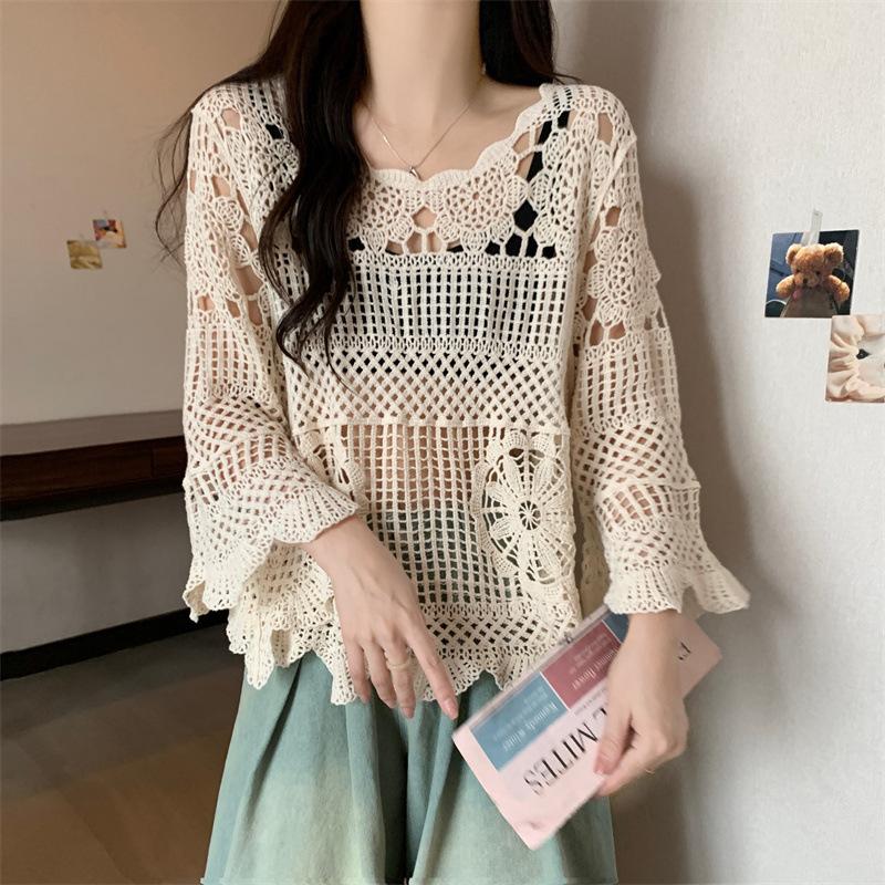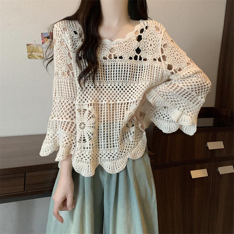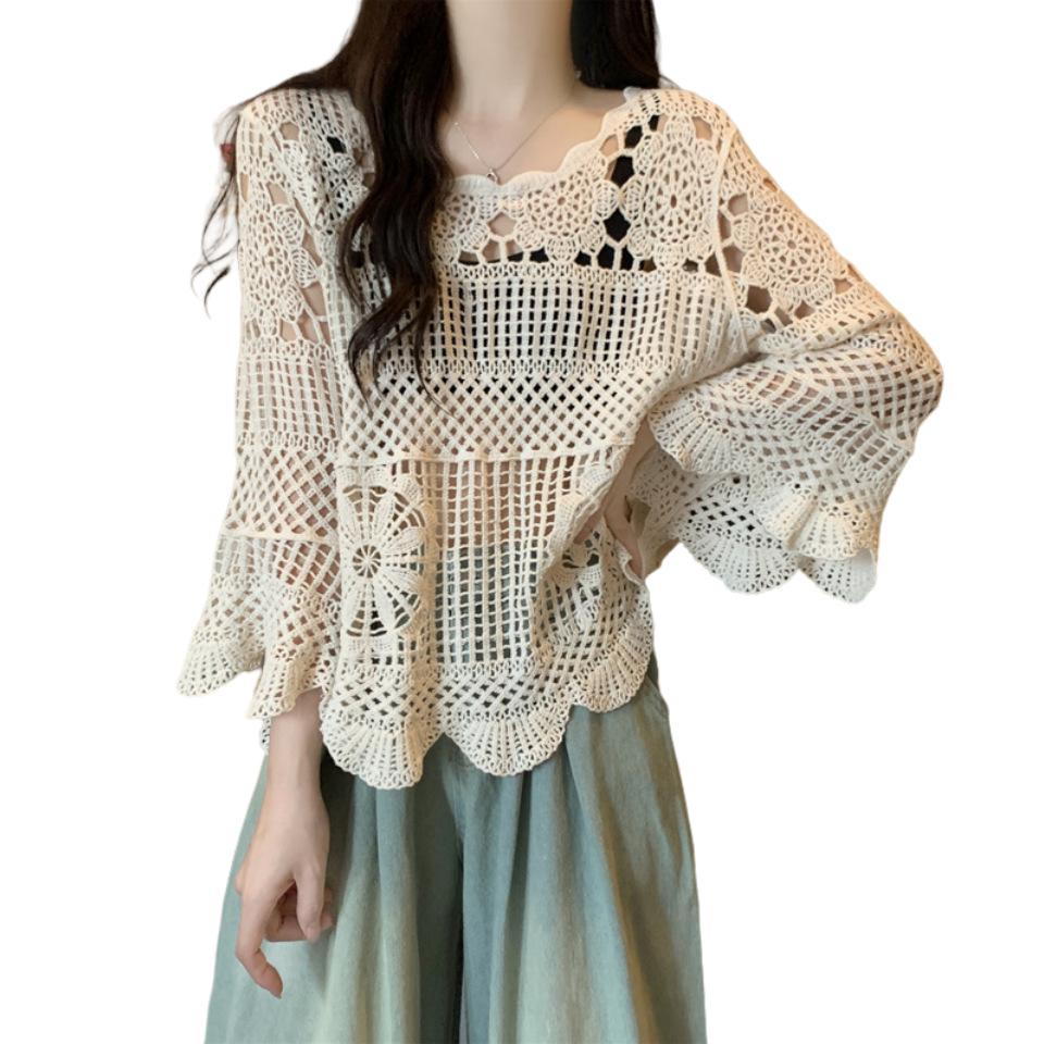 Nuevo 2024 Versátil Estilo Bohemio Casual Suelto Calado Sexy Top de Punto Verano Cuello Redondo Blusa Manga Mariposa