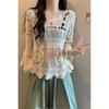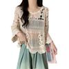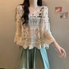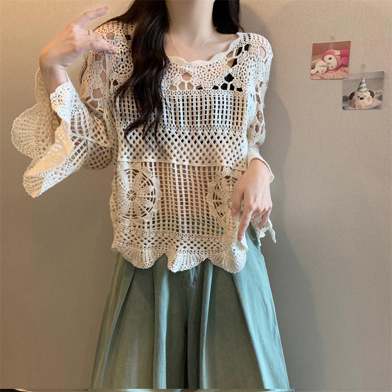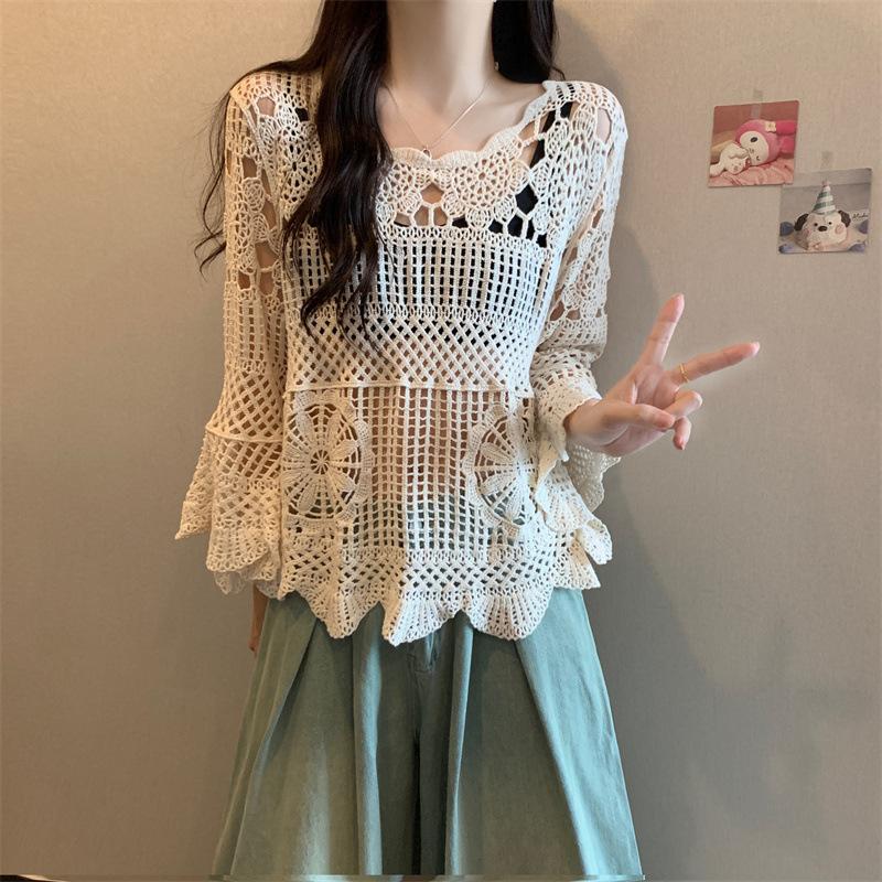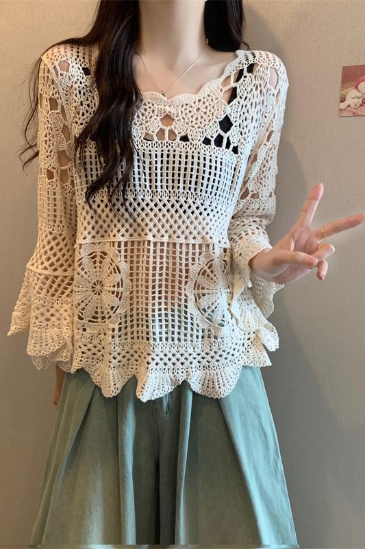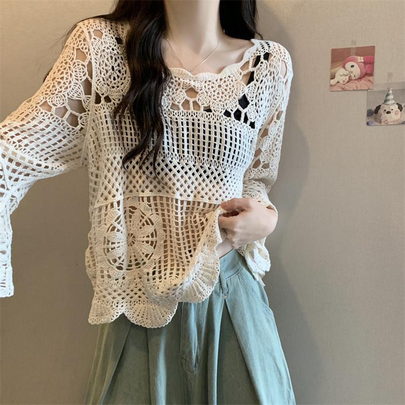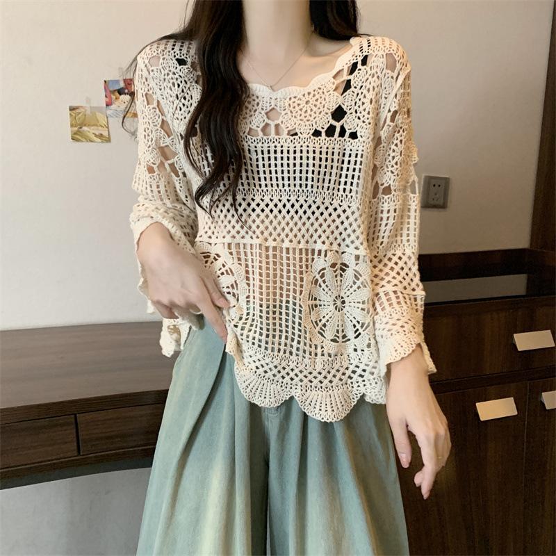 Nuevo 2024 Versátil Estilo Bohemio Casual Suelto Calado Sexy Top de Punto Verano Cuello Redondo Blusa Manga Mariposa