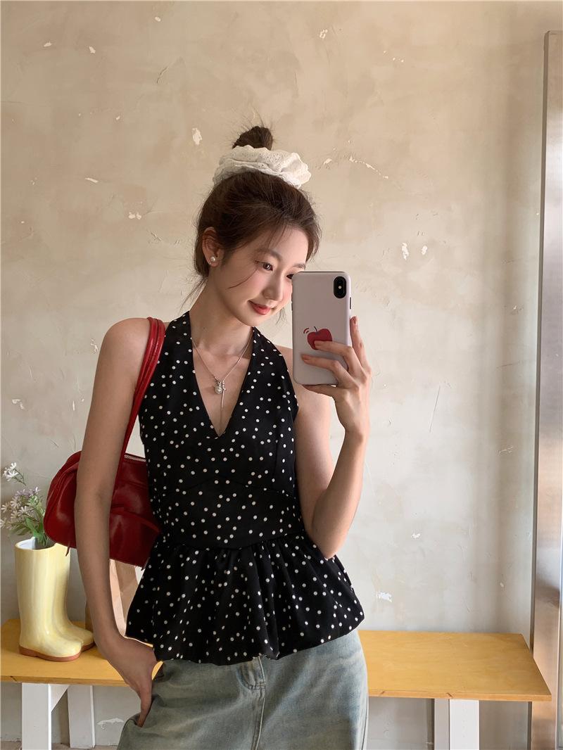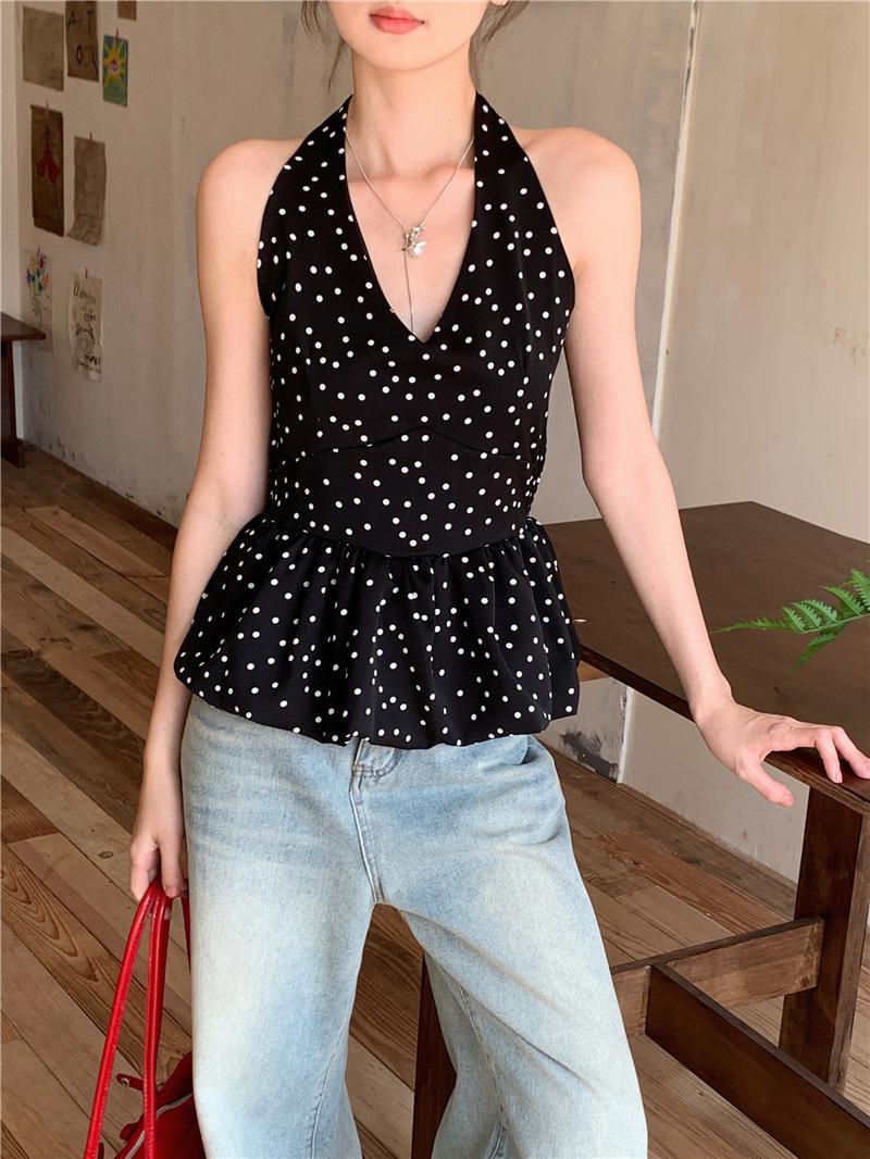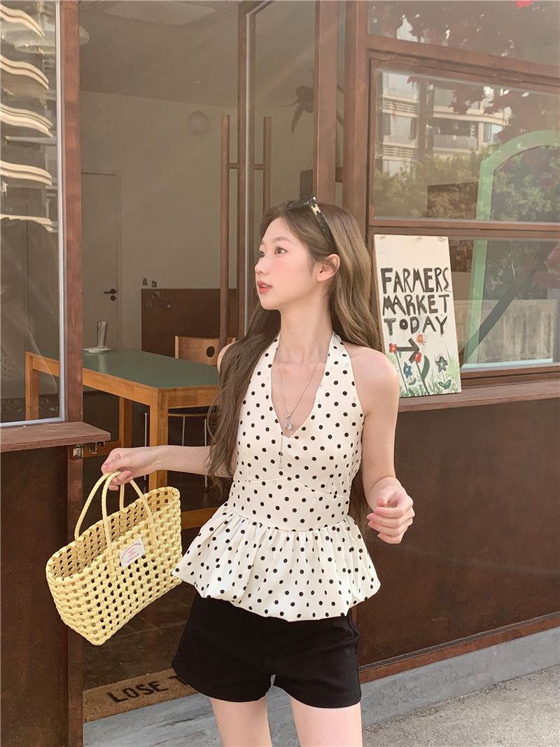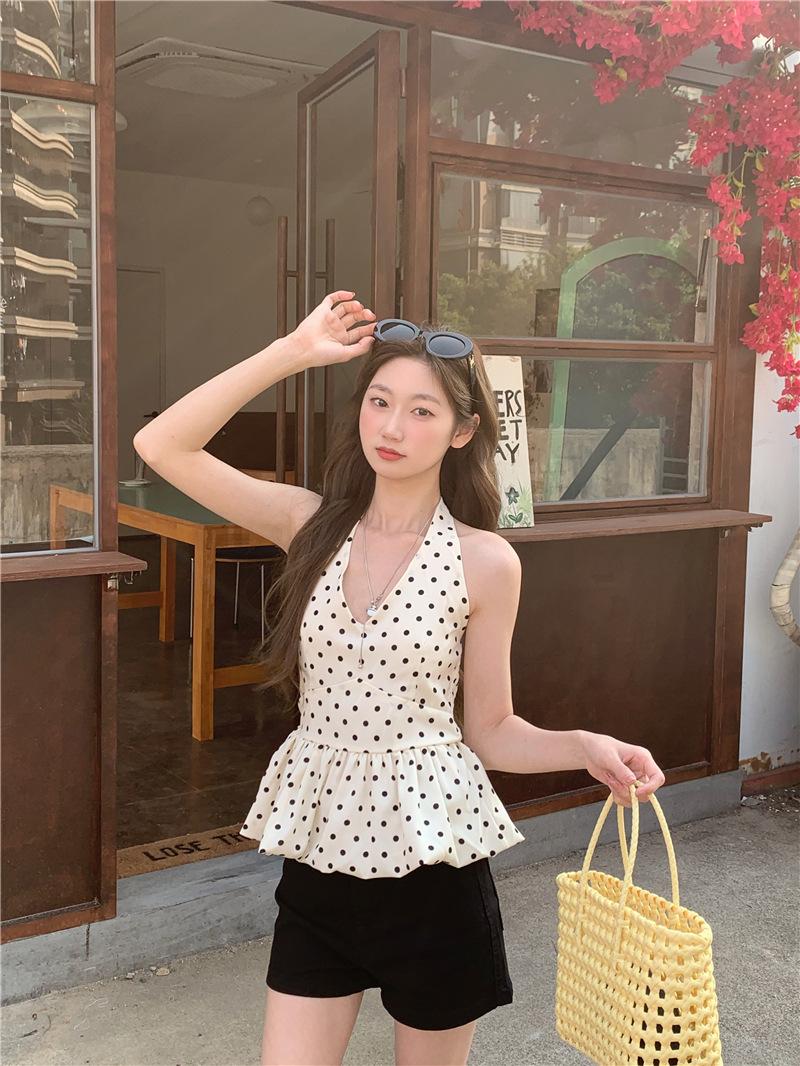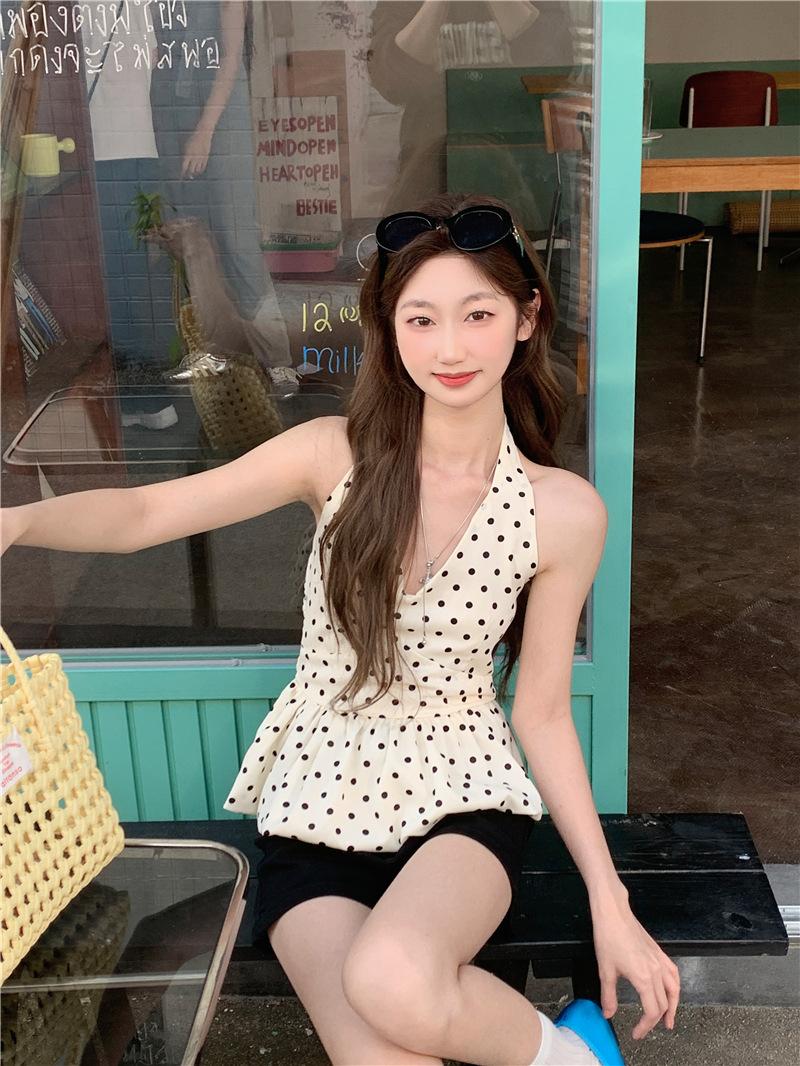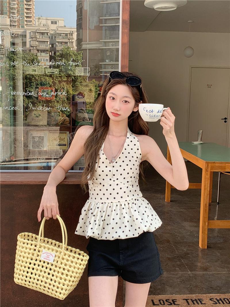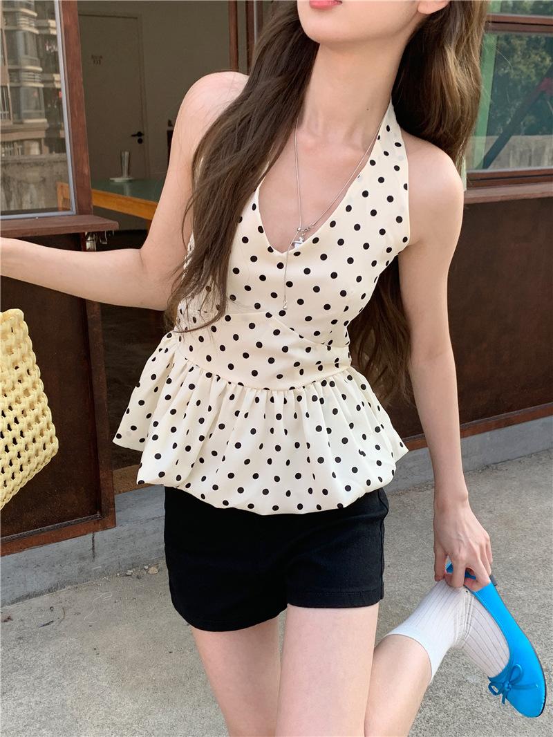 Camisola de Tiro Real para Mujer Verano 2025 Nueva Ajustada Adelgazante Top Corto sin Mangas con Cuello Polo Lunares 80871