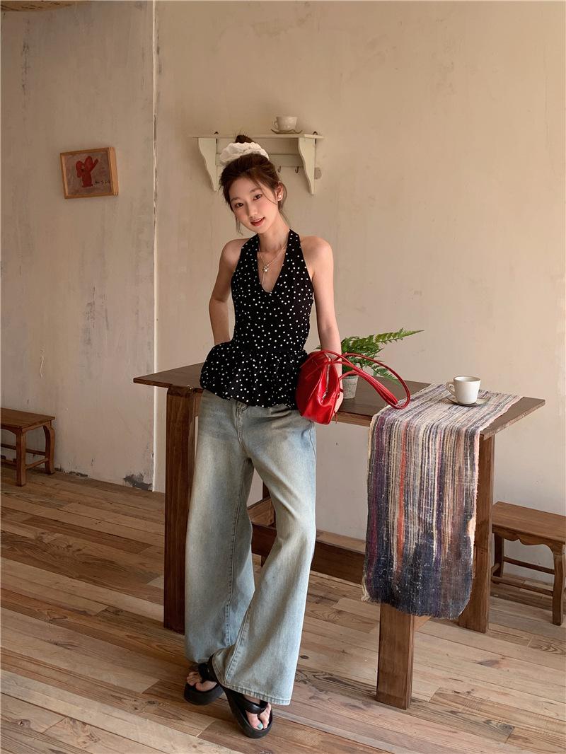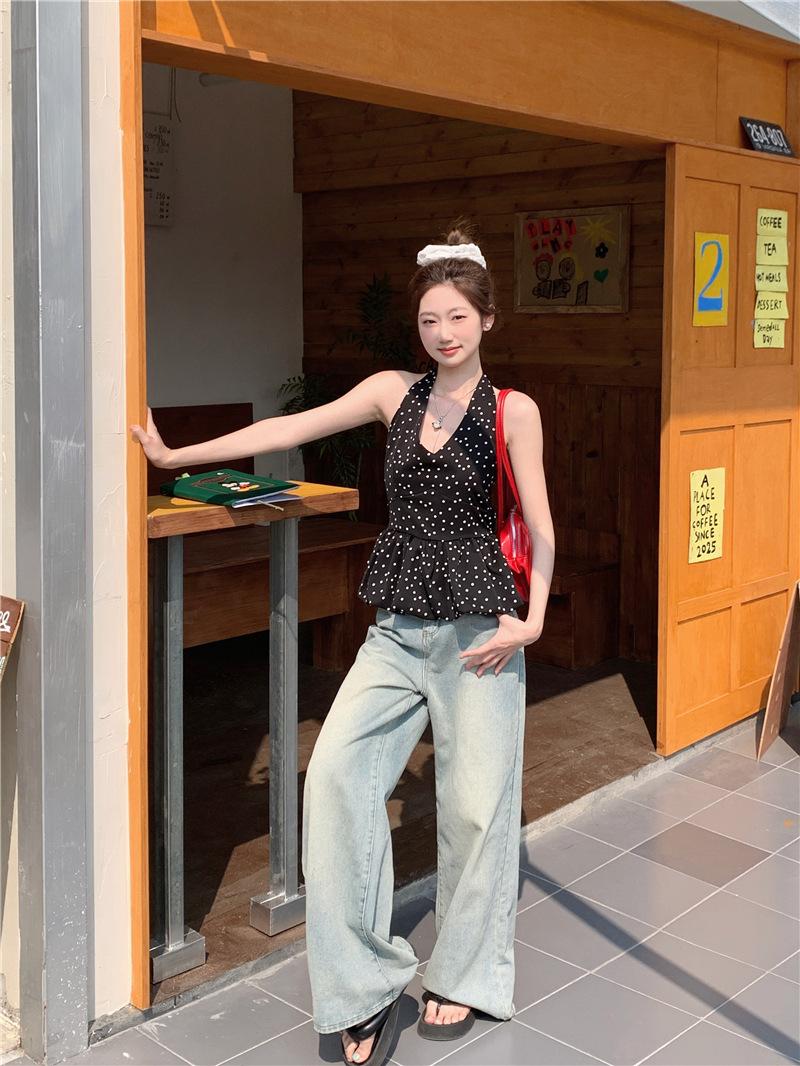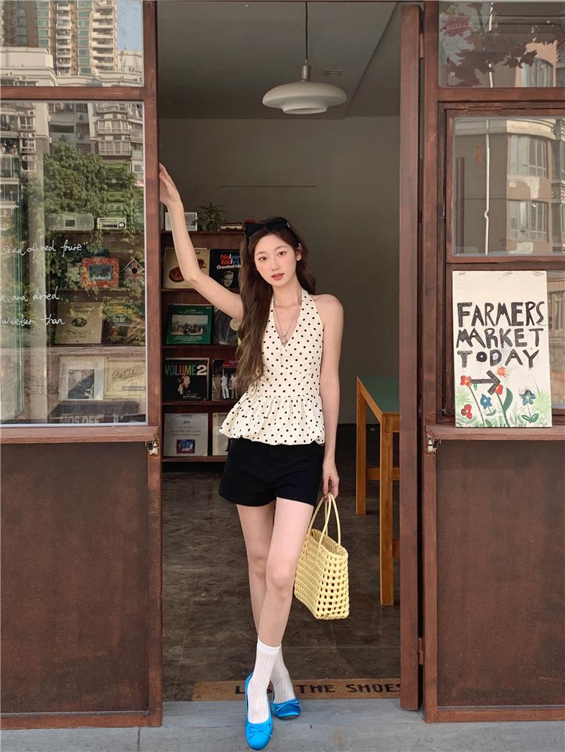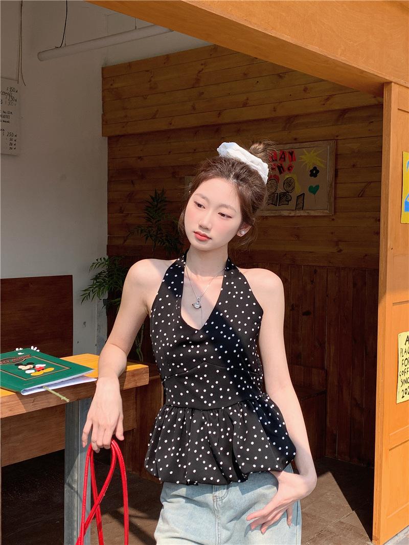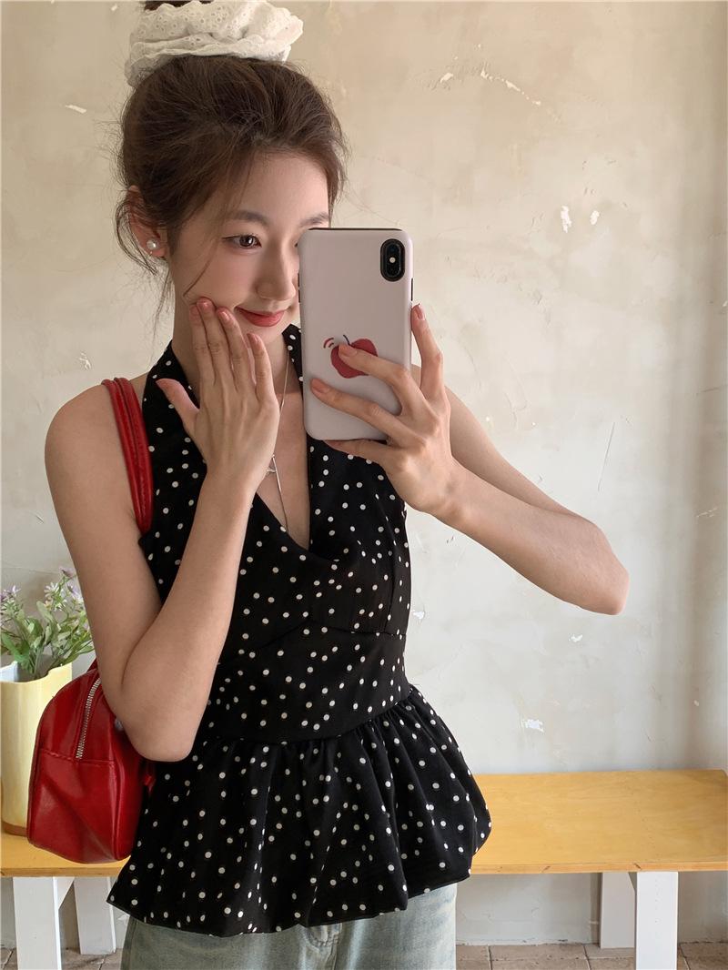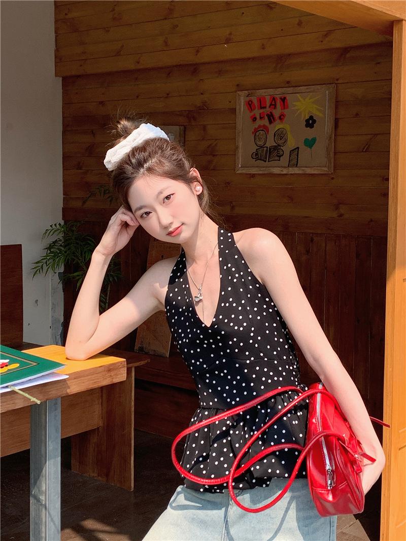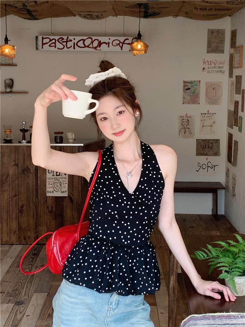 Camisola de Tiro Real para Mujer Verano 2025 Nueva Ajustada Adelgazante Top Corto sin Mangas con Cuello Polo Lunares 80871