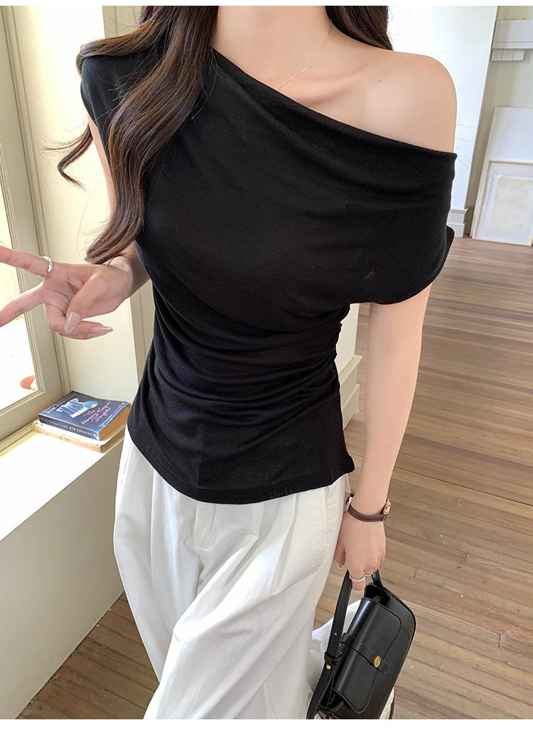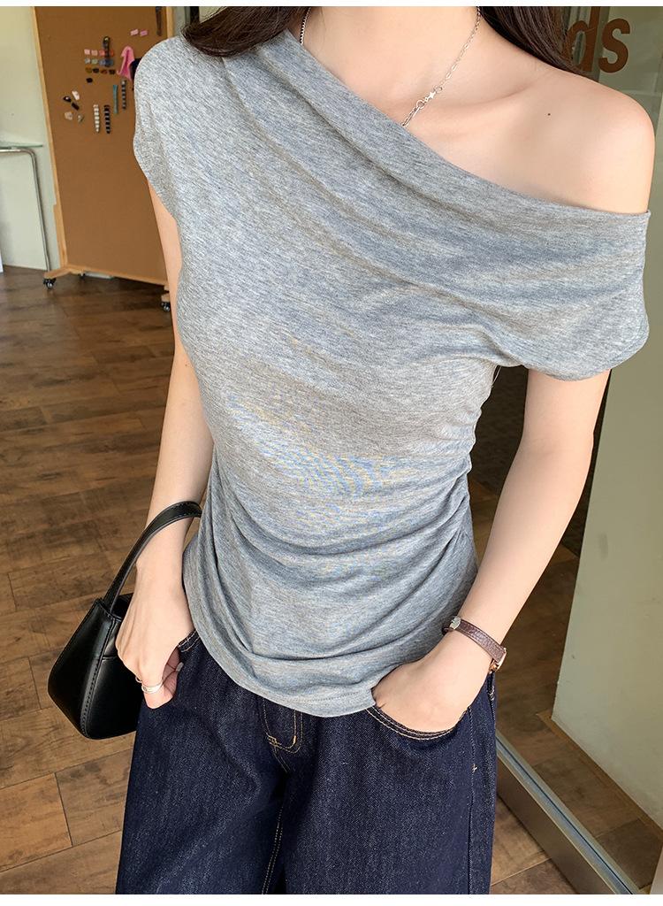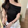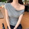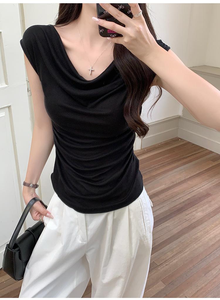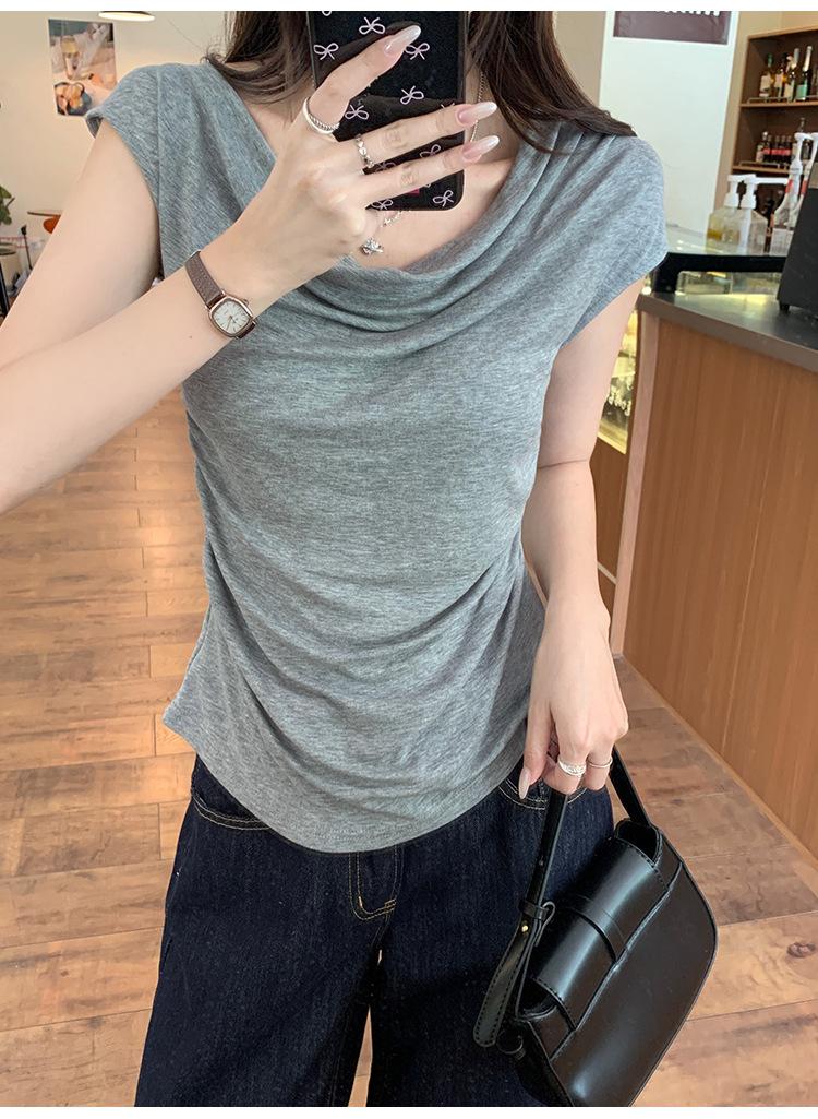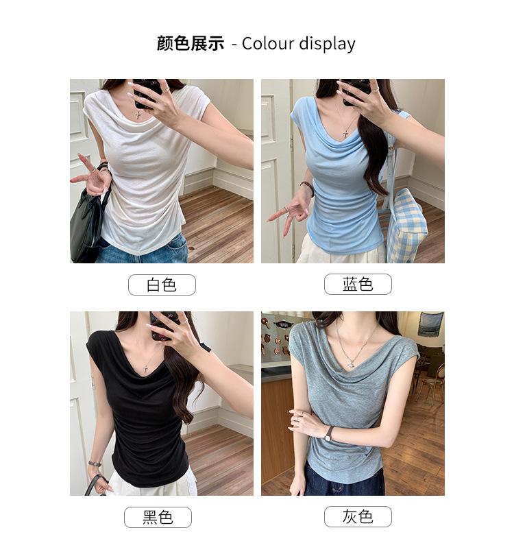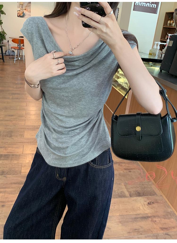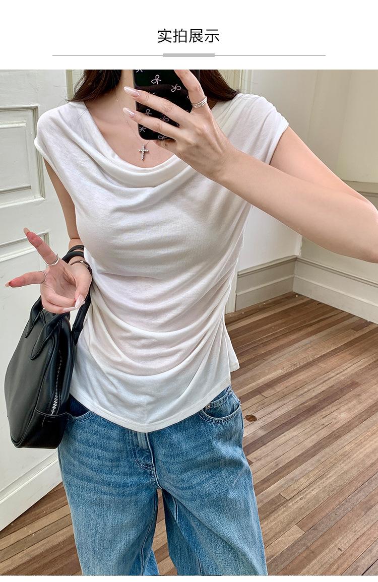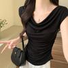 Foto Real # Camiseta sin Mangas con Cuello Irregular Oscilante para Mujer 2025 Nuevo Diseño Plisada de un Hombro Top Corto