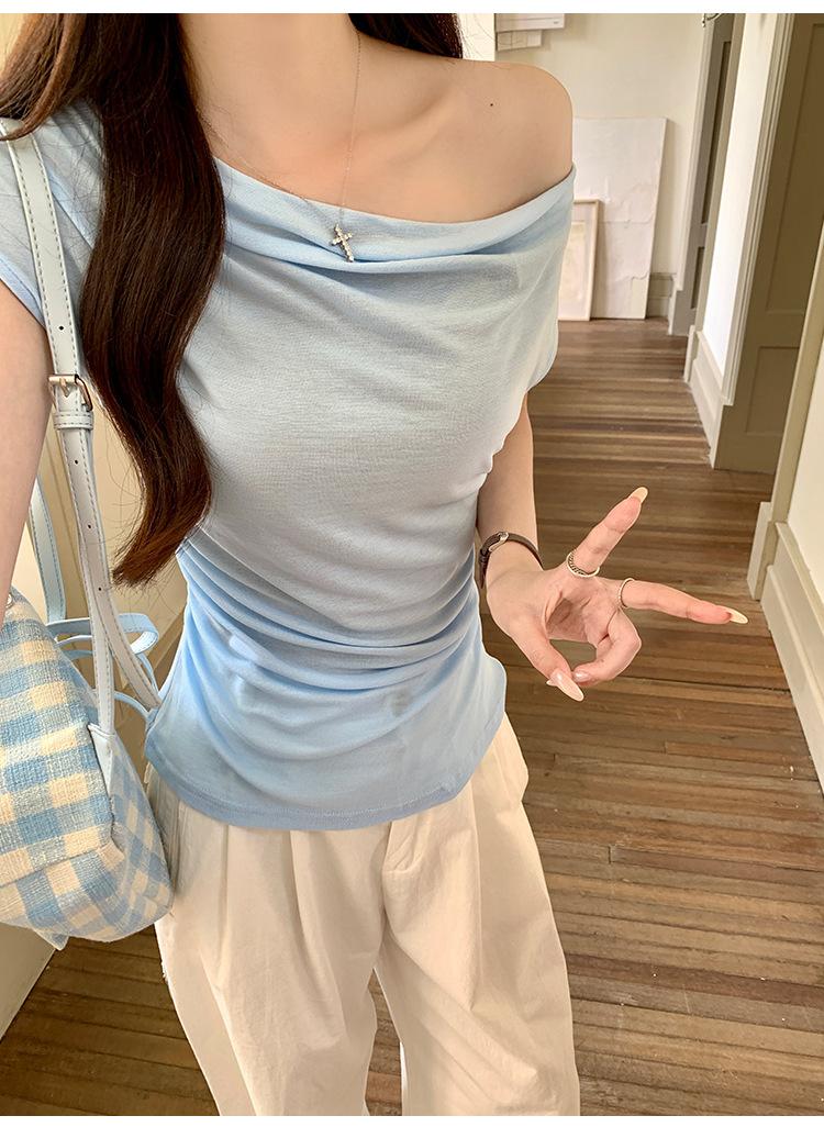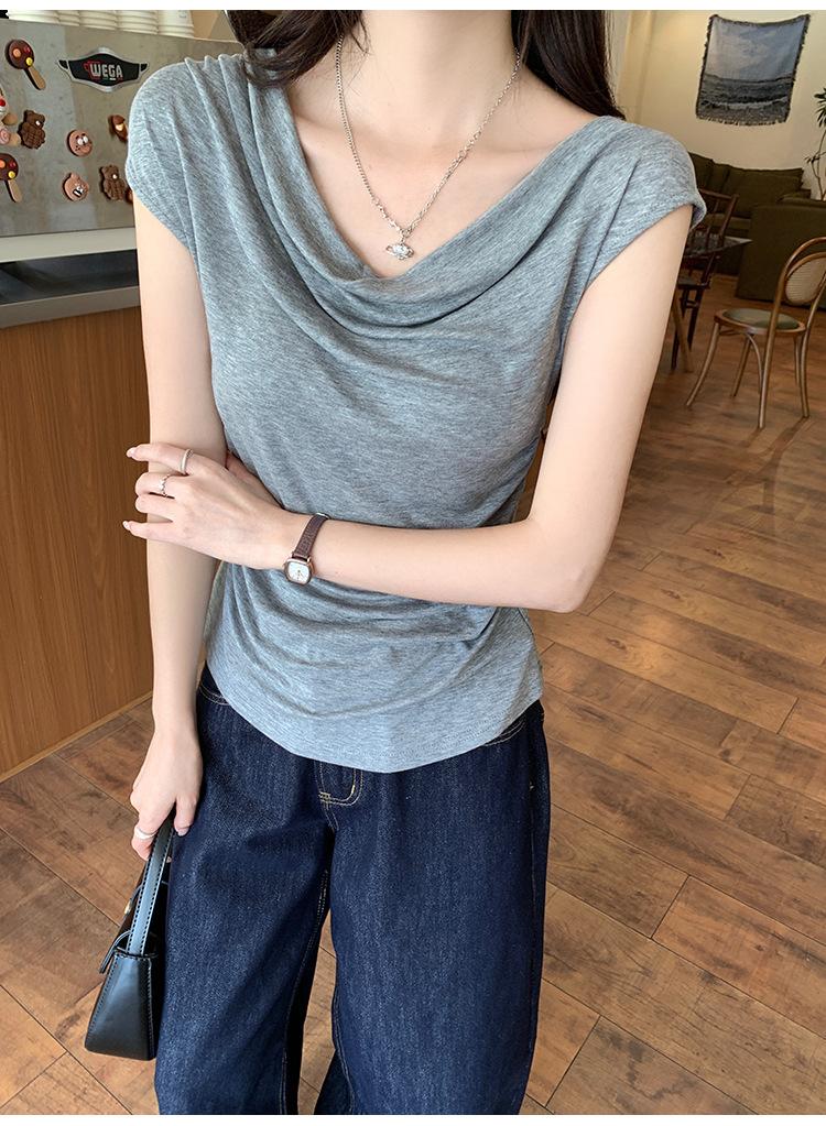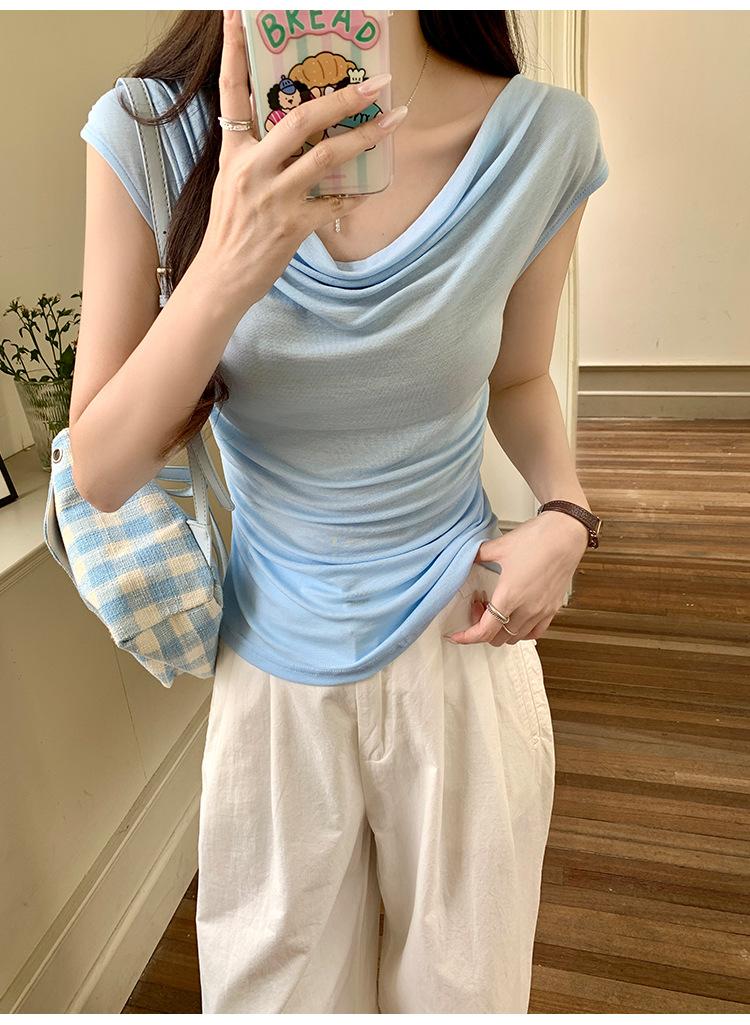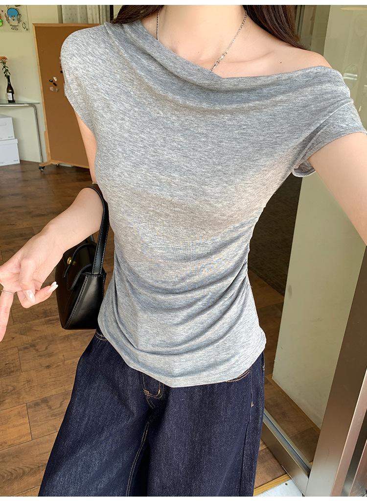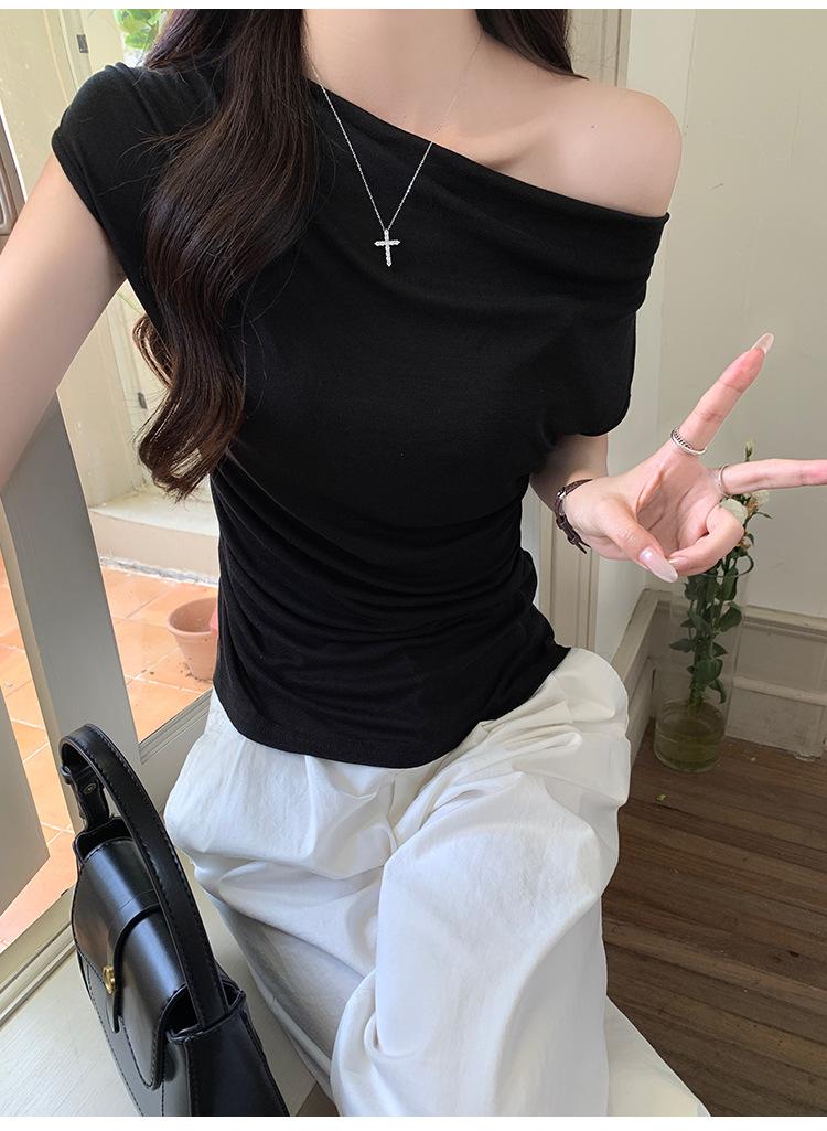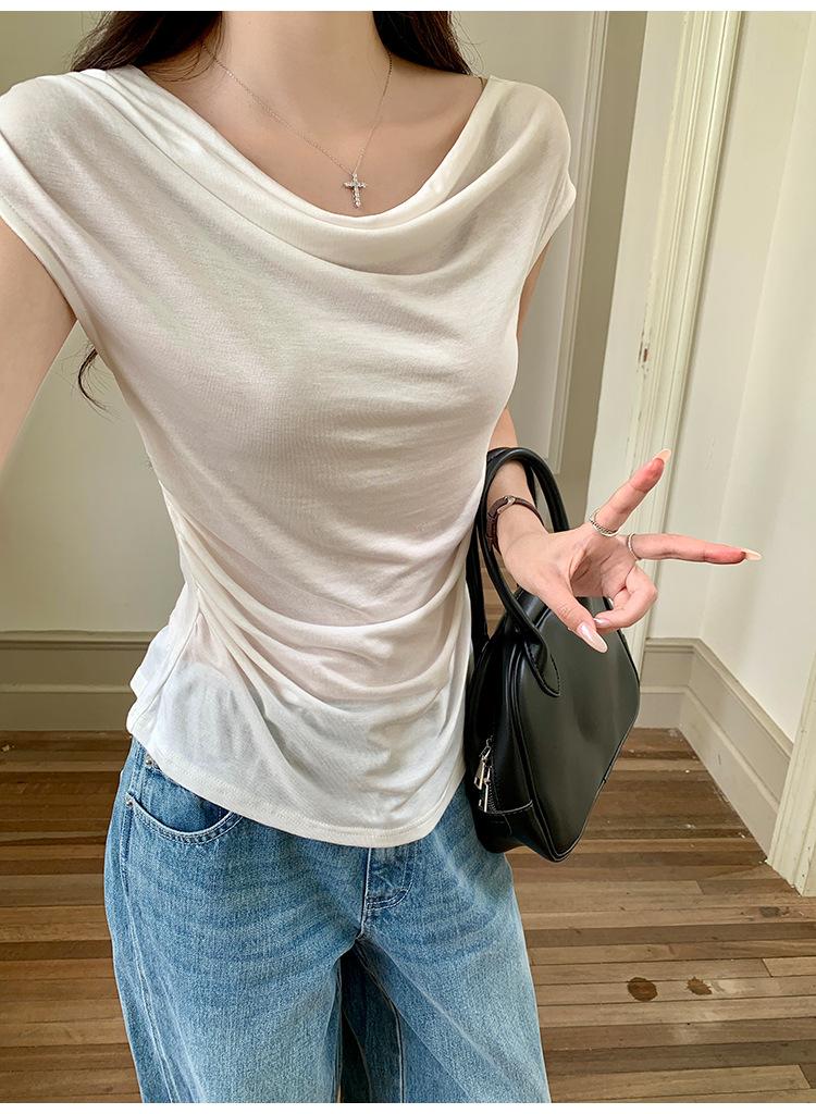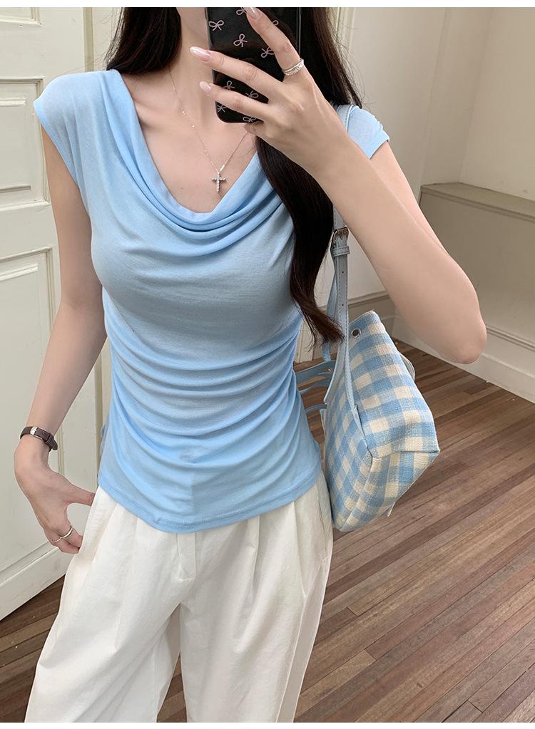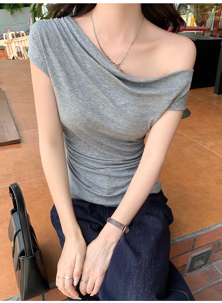 Foto Real # Camiseta sin Mangas con Cuello Irregular Oscilante para Mujer 2025 Nuevo Diseño Plisada de un Hombro Top Corto