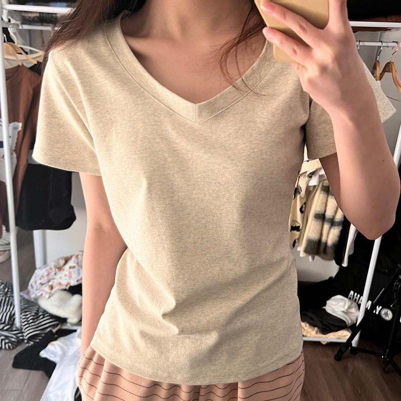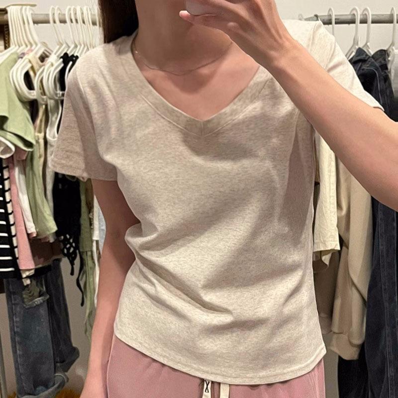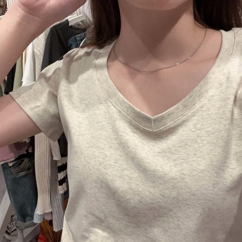 Playera de Manga Corta con Cuello en V para Hombro Derecho para Mujer Verano 2025 Nueva Algodón Aspecto Adelgazante Básica Versátil Top Clavícula