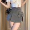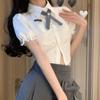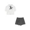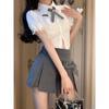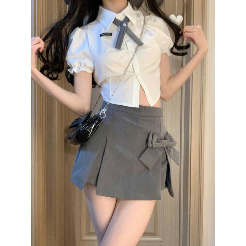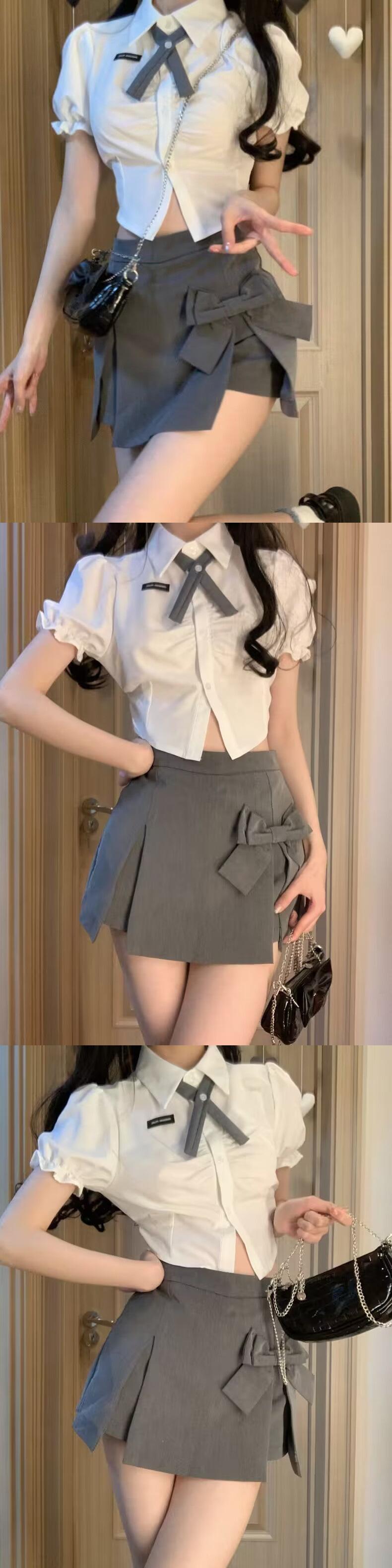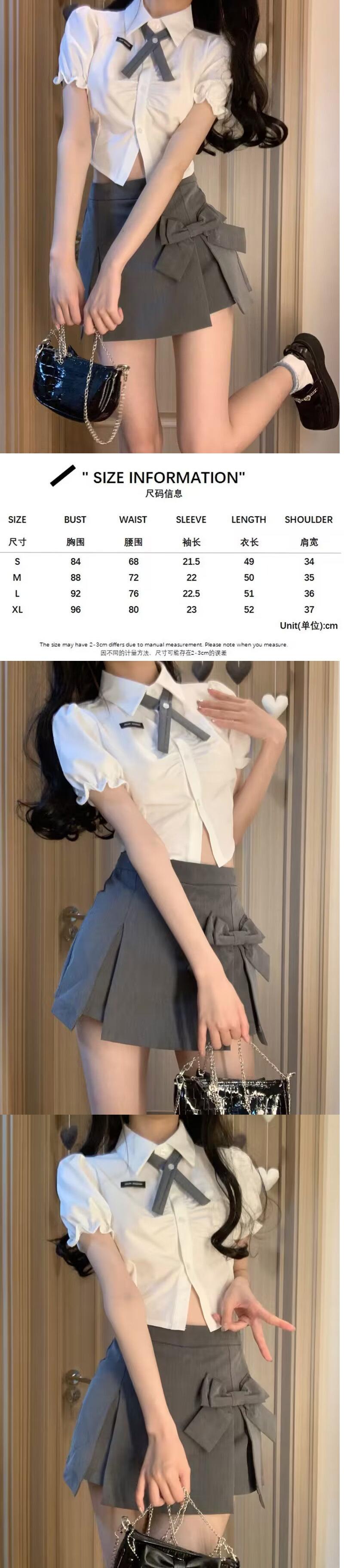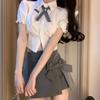 Pleated short-sleeved shirt single piece, Pleated short-sleeved shirt + gray tie, Gray bow skirt single piece,...