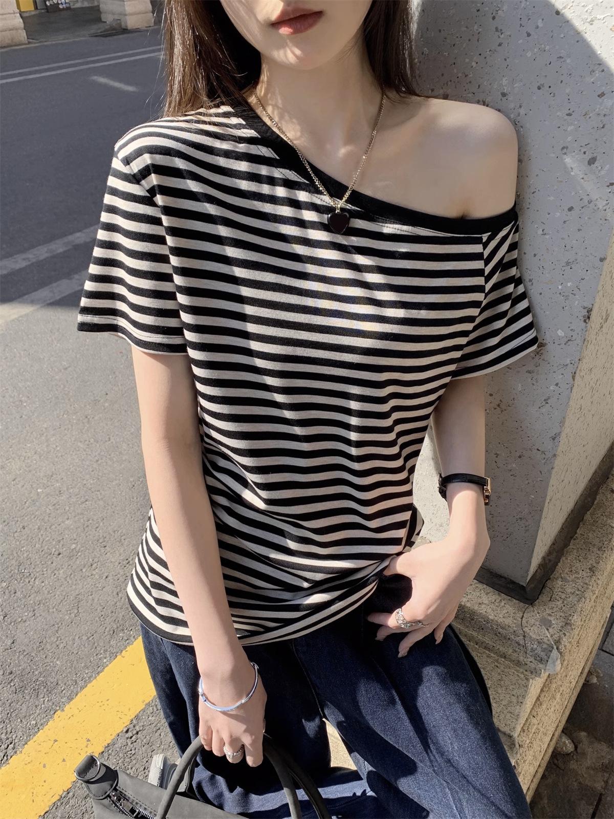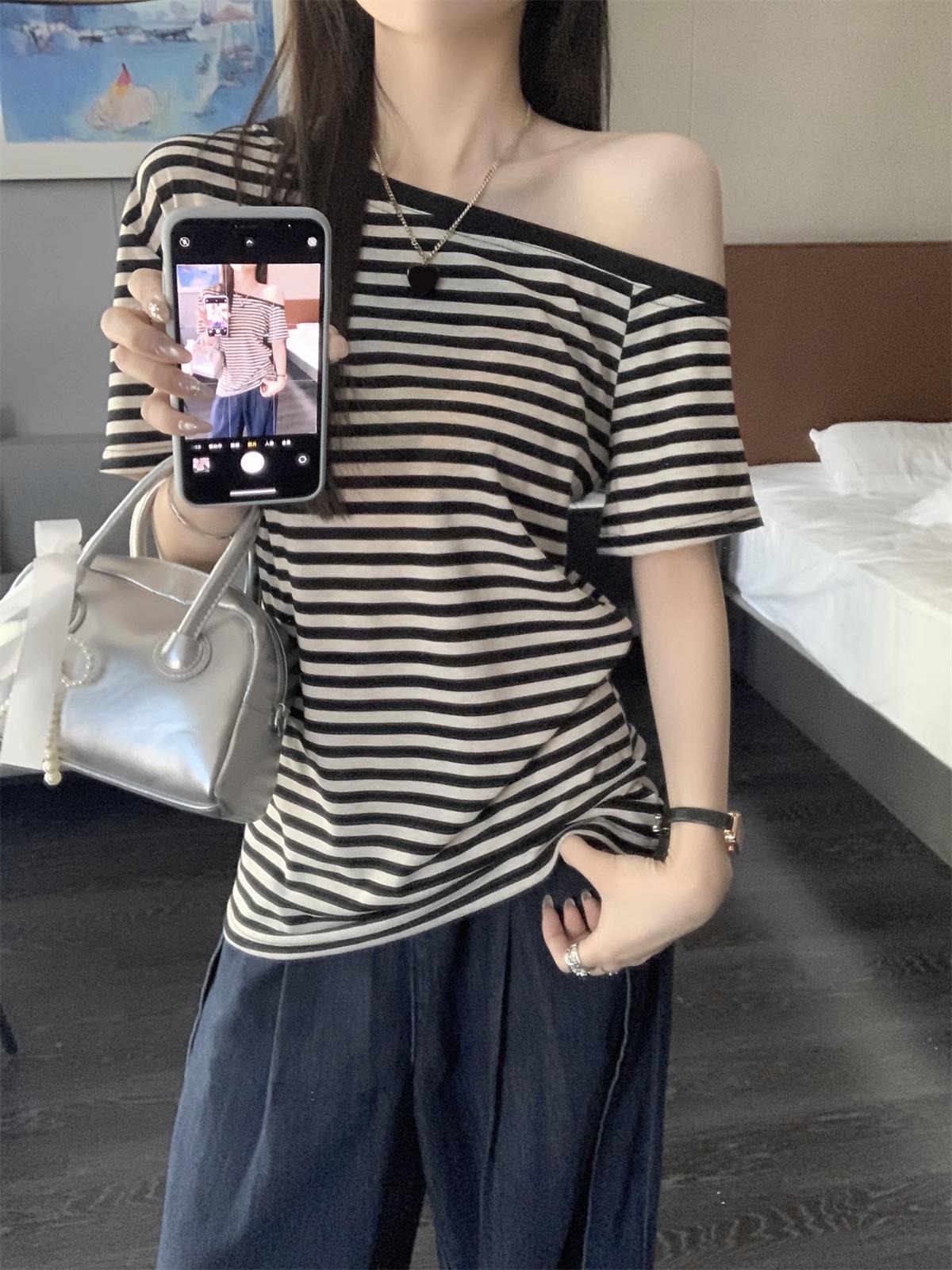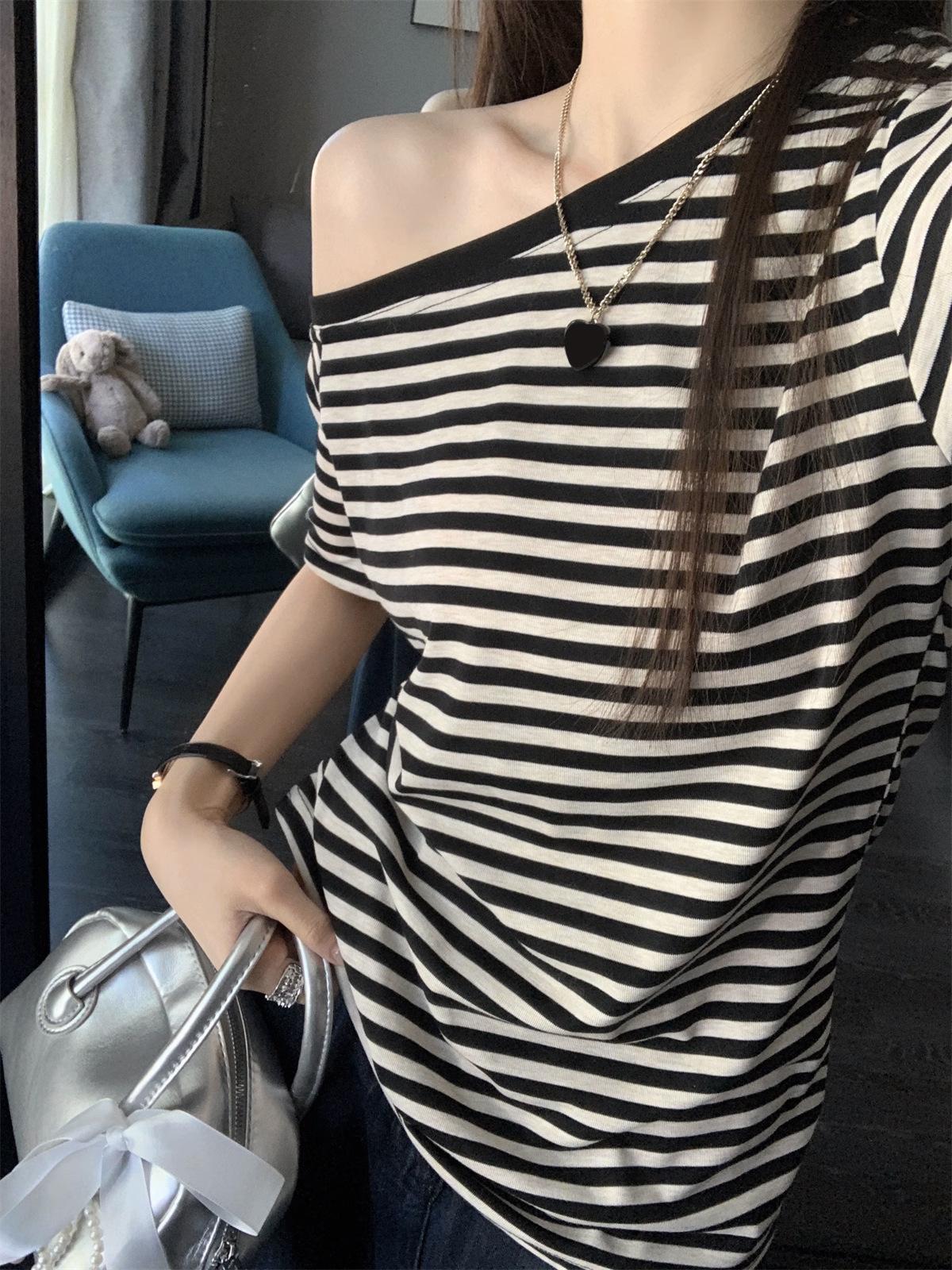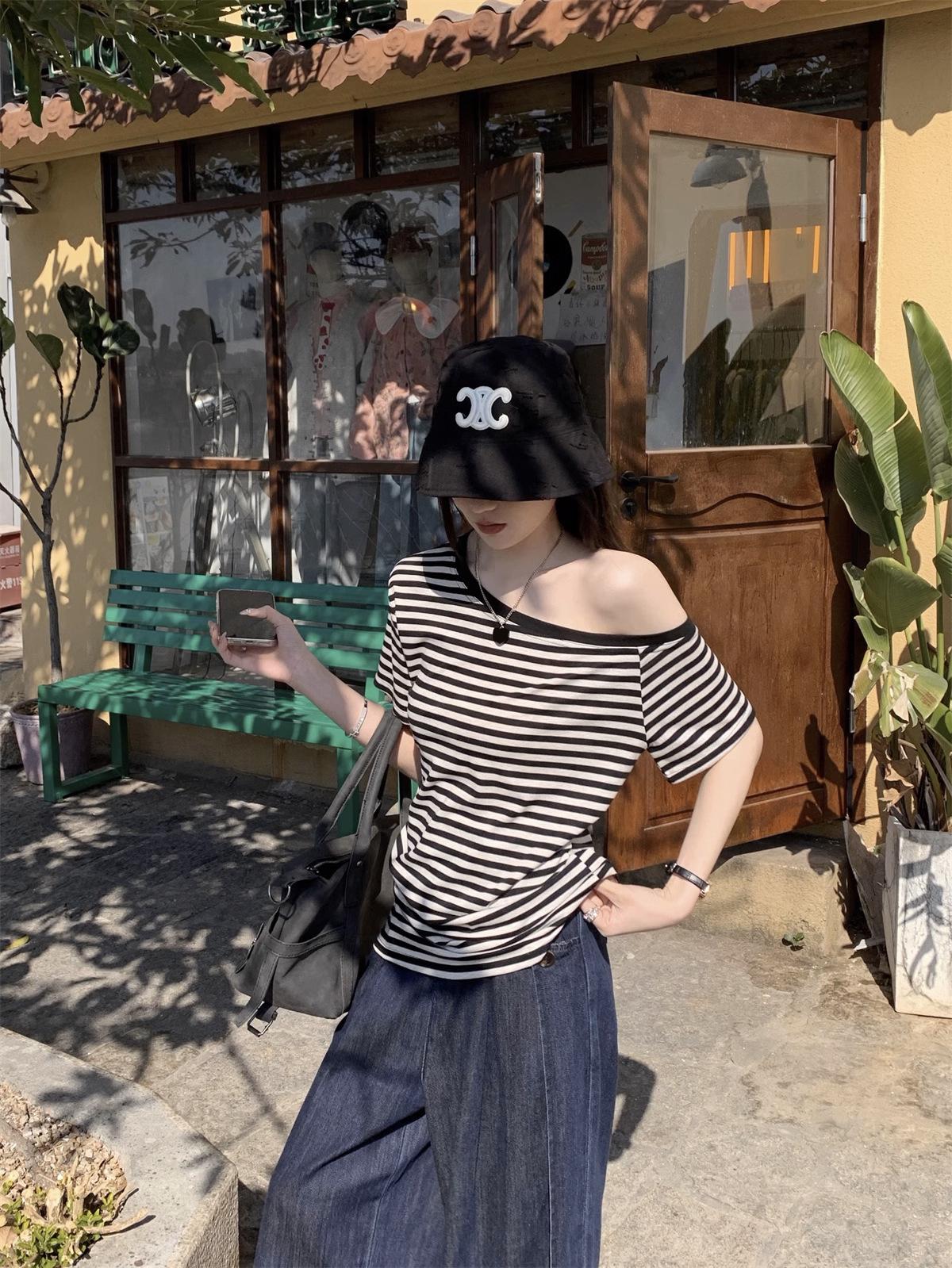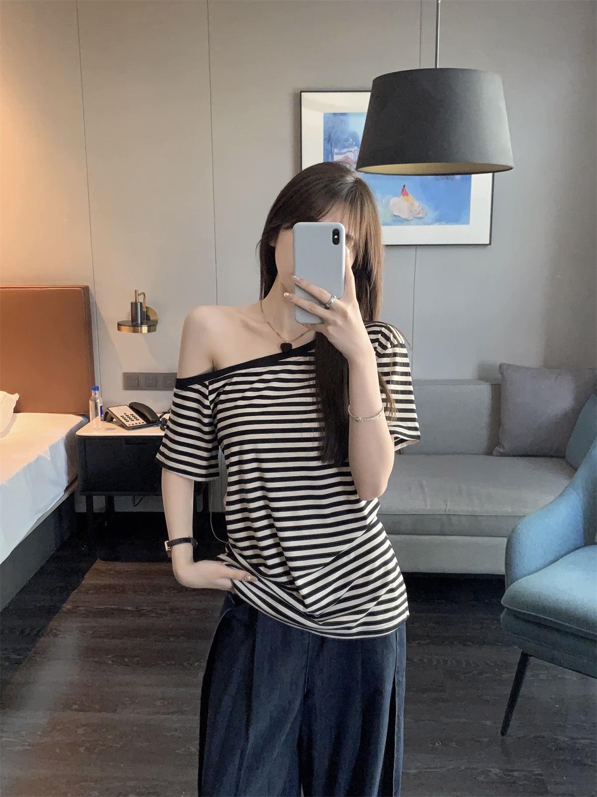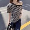 Compra Camiseta de Diseño Sense de Hombro Caído de Manga Corta a Rayas para Mujer 2025 Verano Nuevo Holgada Adelgazante Versátil Hombro Descubierto Top de Estudiante al por mayor en Joom.pro