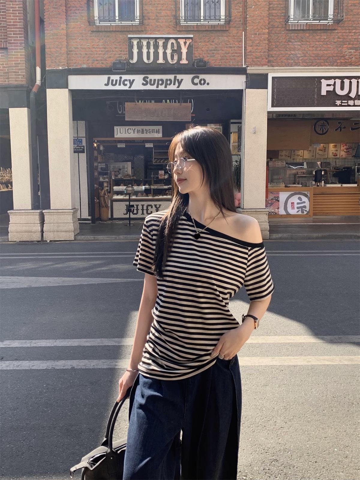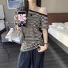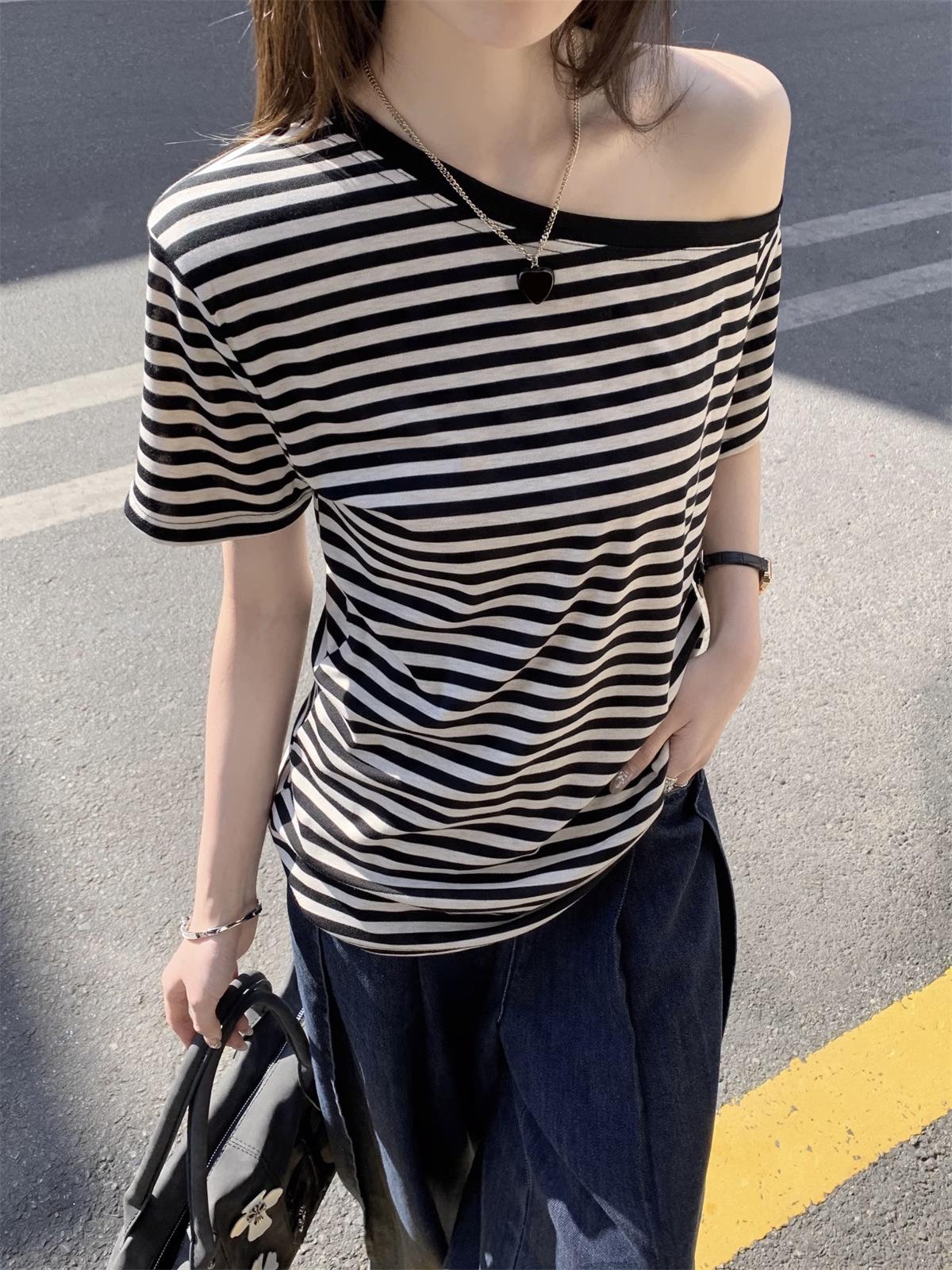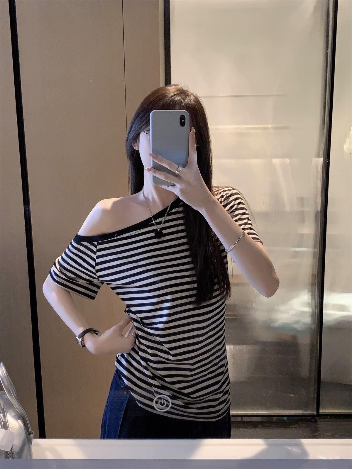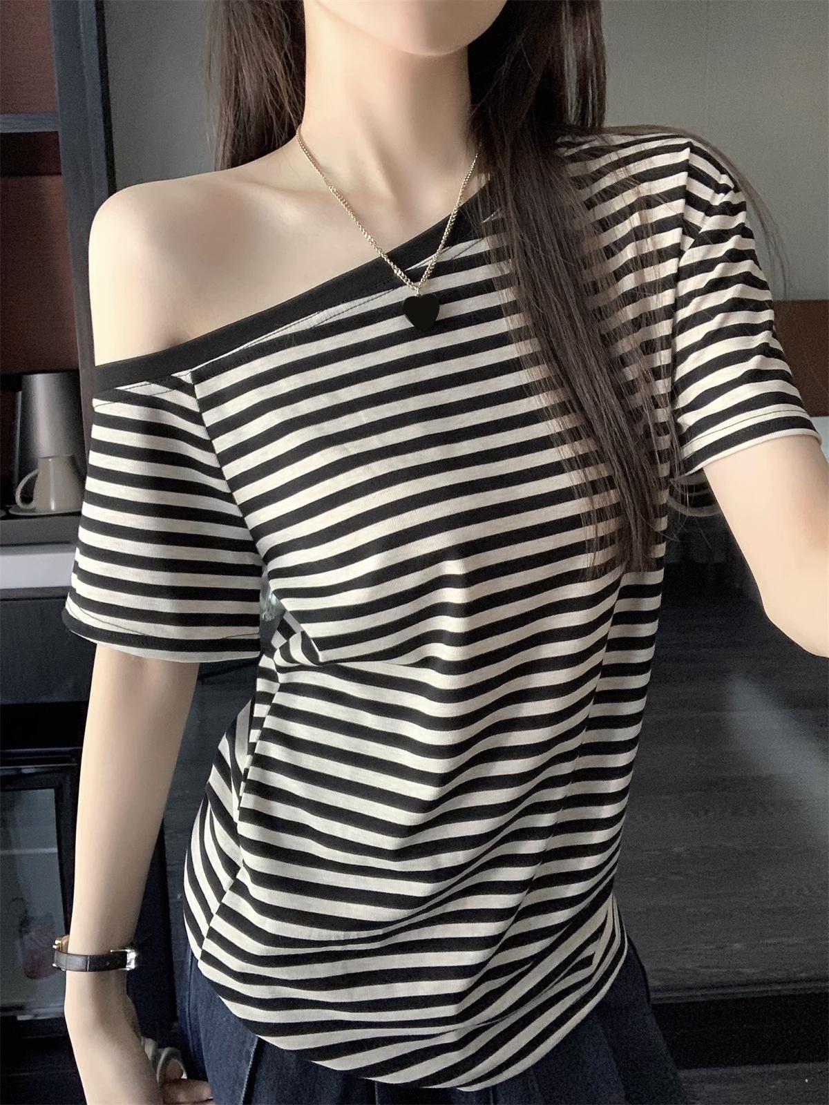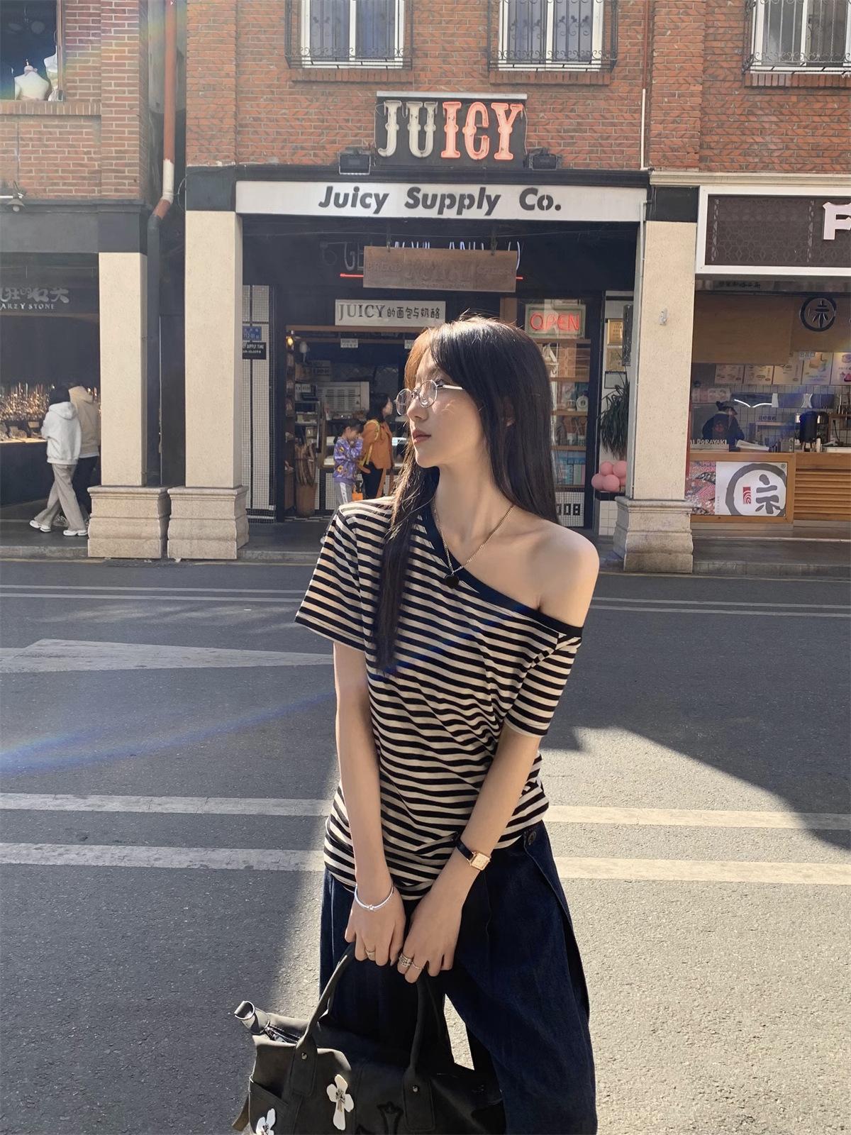 Compra Camiseta de Diseño Sense de Hombro Caído de Manga Corta a Rayas para Mujer 2025 Verano Nuevo Holgada Adelgazante Versátil Hombro Descubierto Top de Estudiante al por mayor en Joom.pro