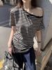 Camiseta de Diseño Sense de Hombro Caído de Manga Corta a Rayas para Mujer 2025 Verano Nuevo Holgada Adelgazante Versátil Hombro Descubierto Top de Estudiante