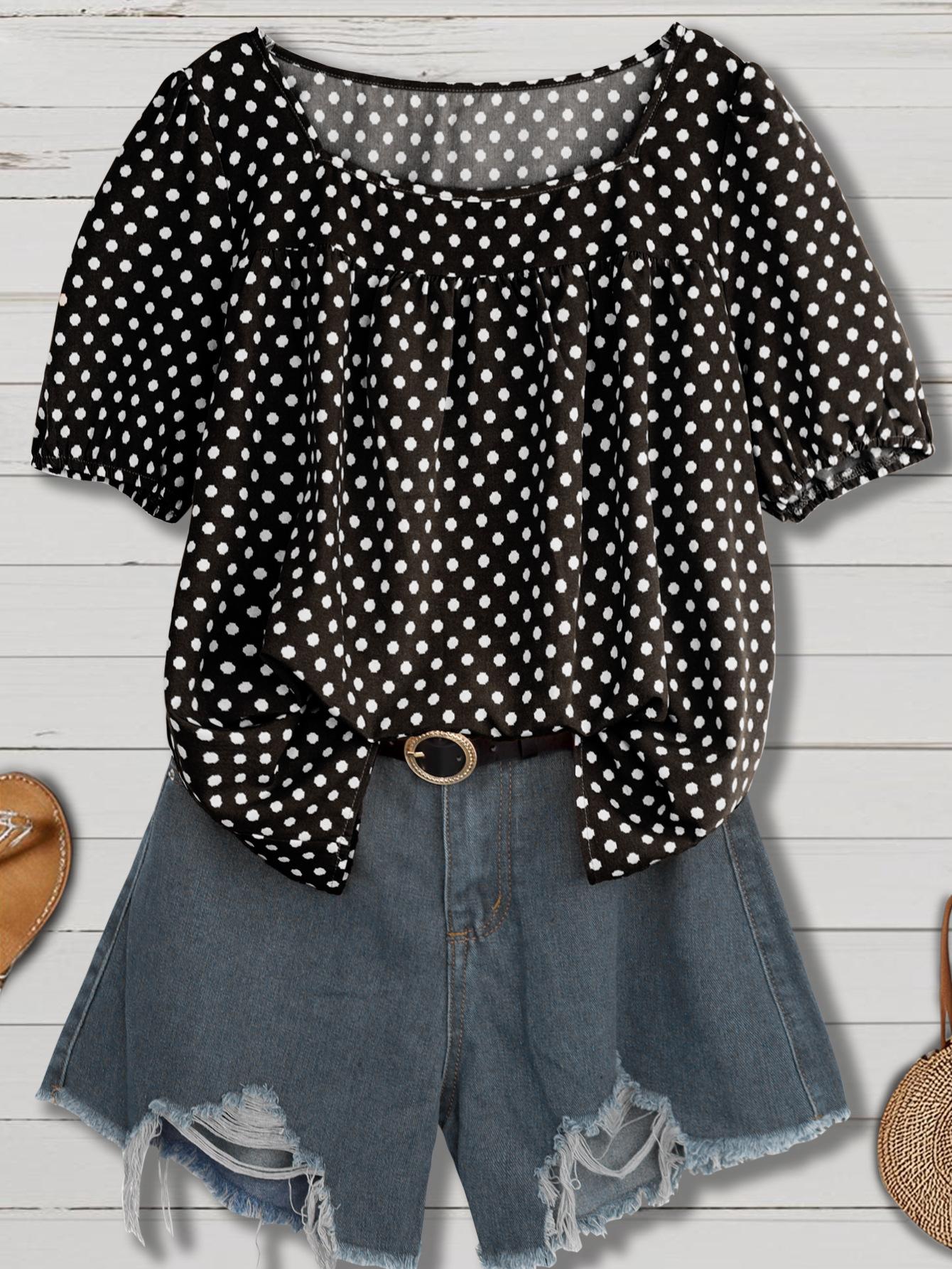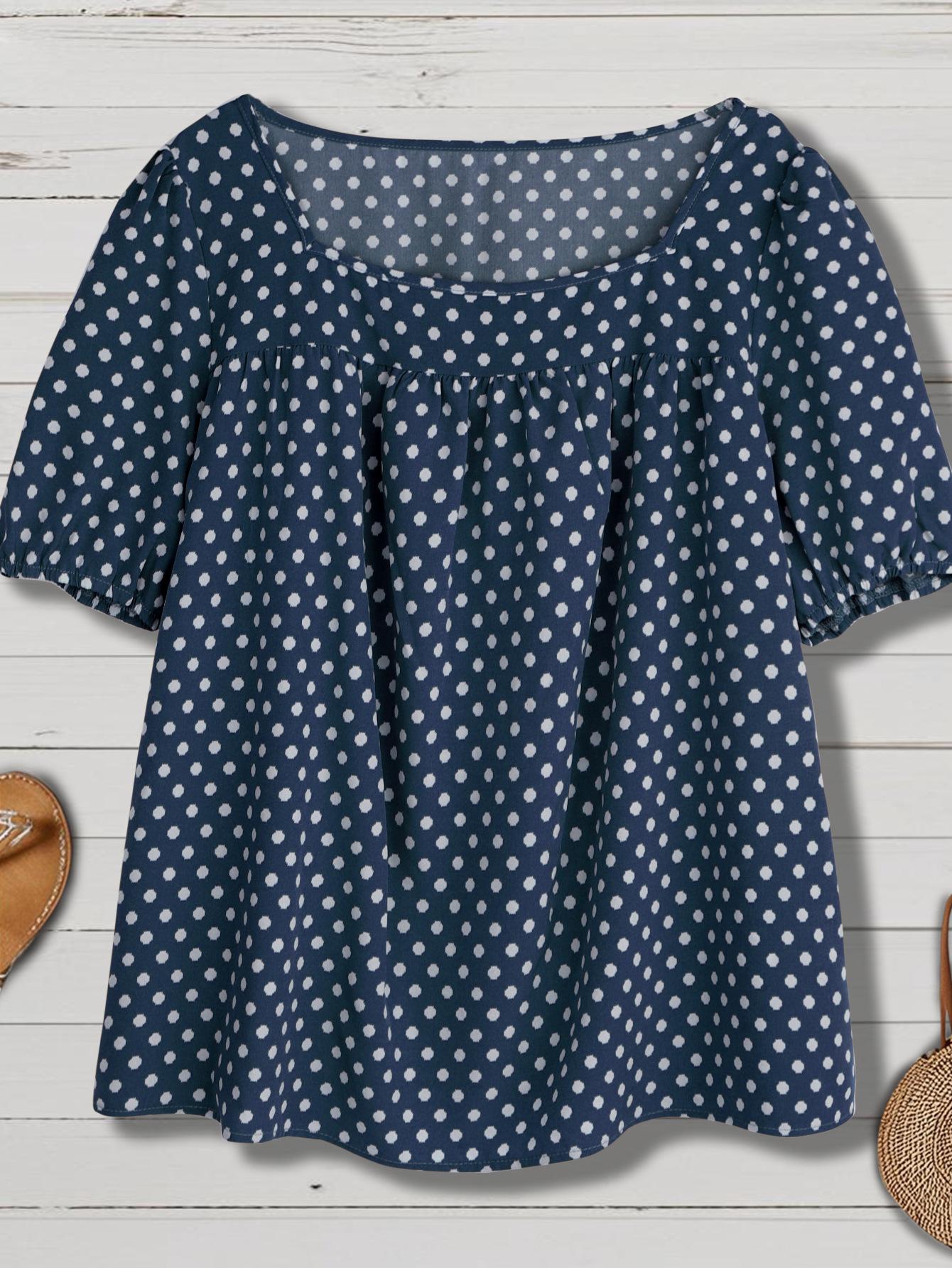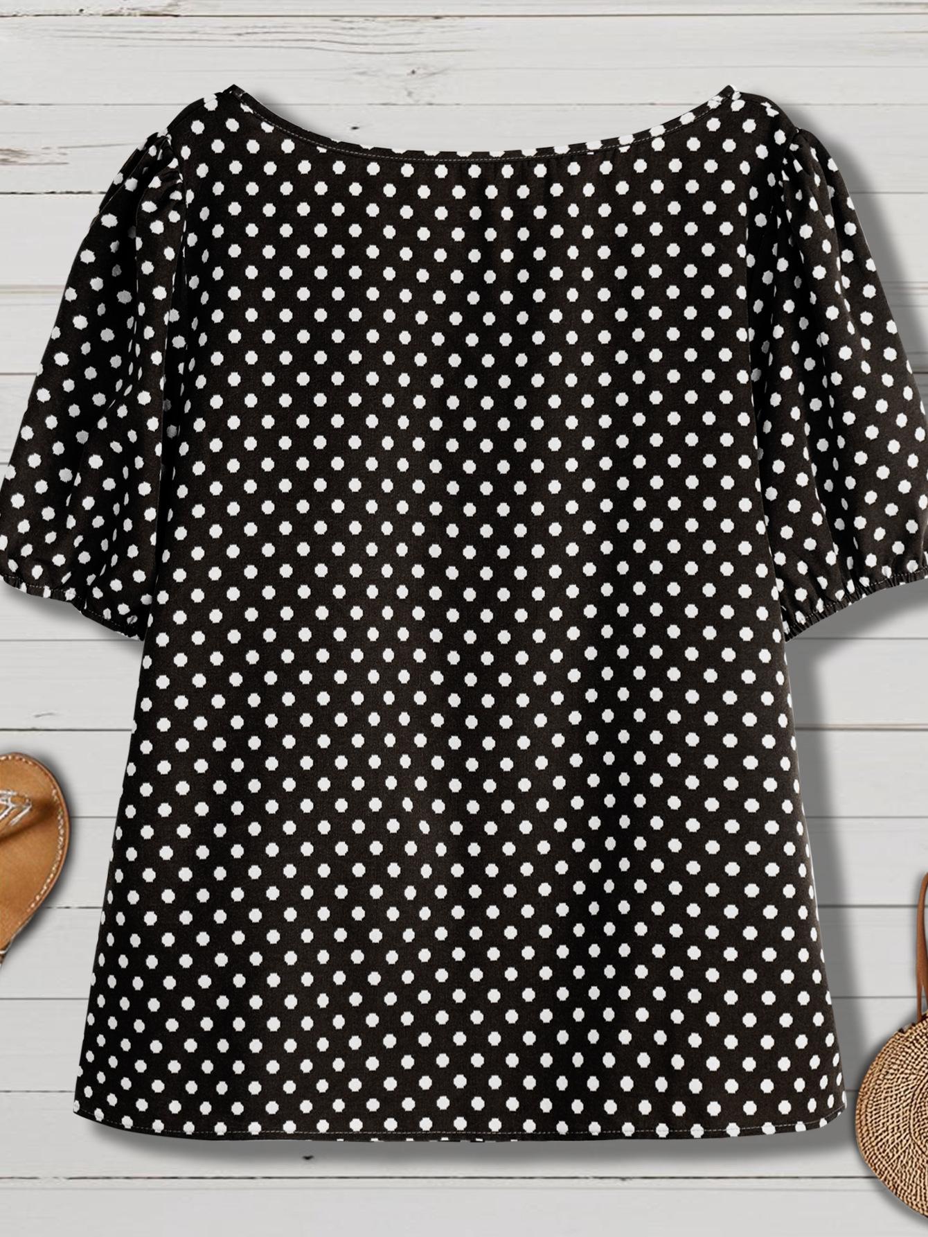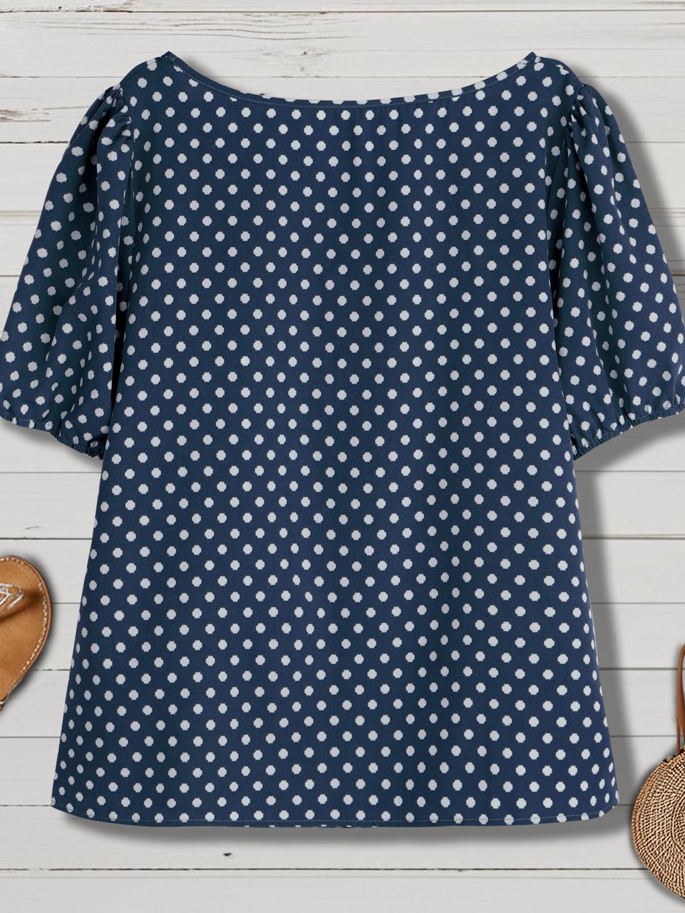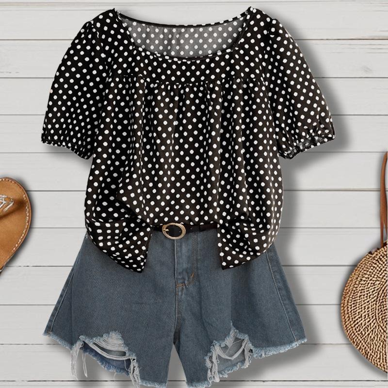 Estilo Nuevo Europeo y Americano Chifón Cuello Redondo Tops de Chifón Temperamento Viajero Comercio Exterior Jersey Lunares Talla Grande Camisas de Mujer al Por Mayor