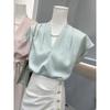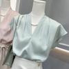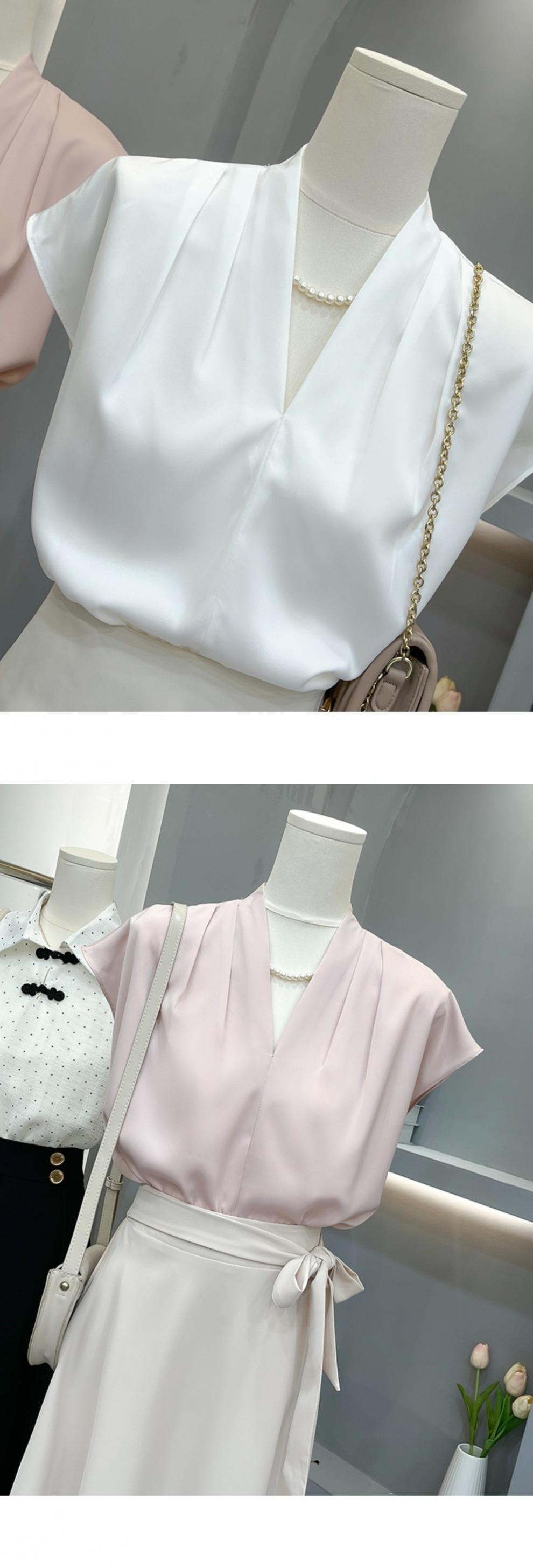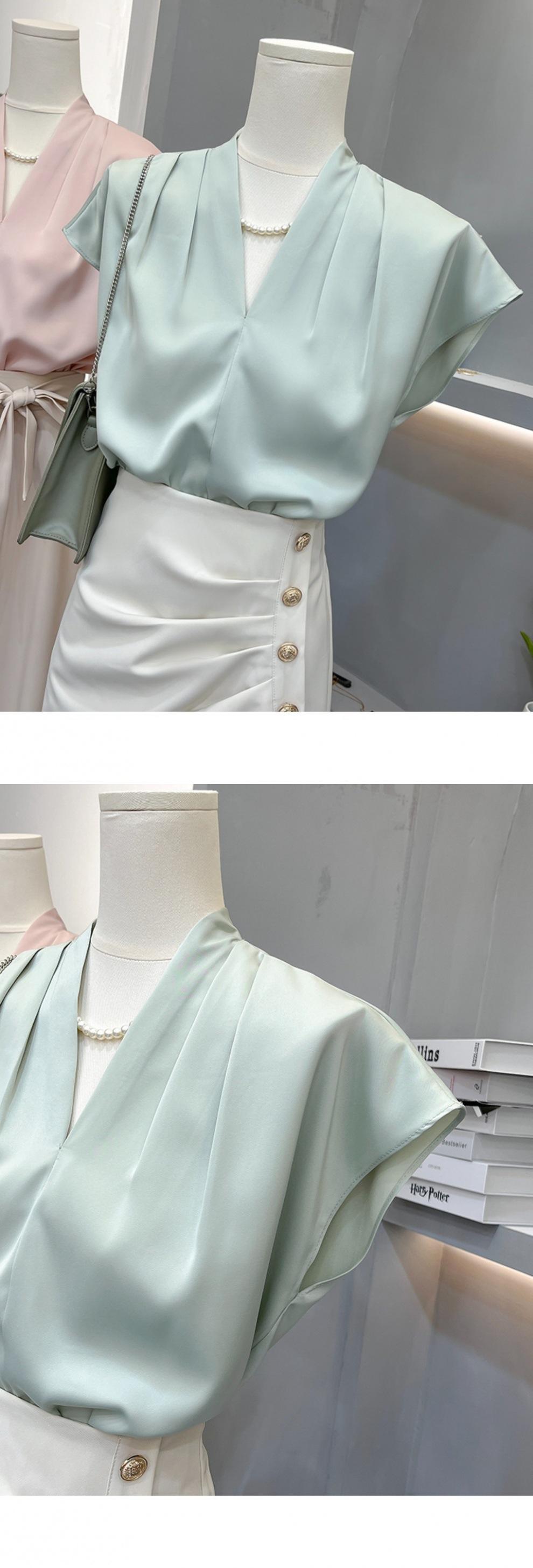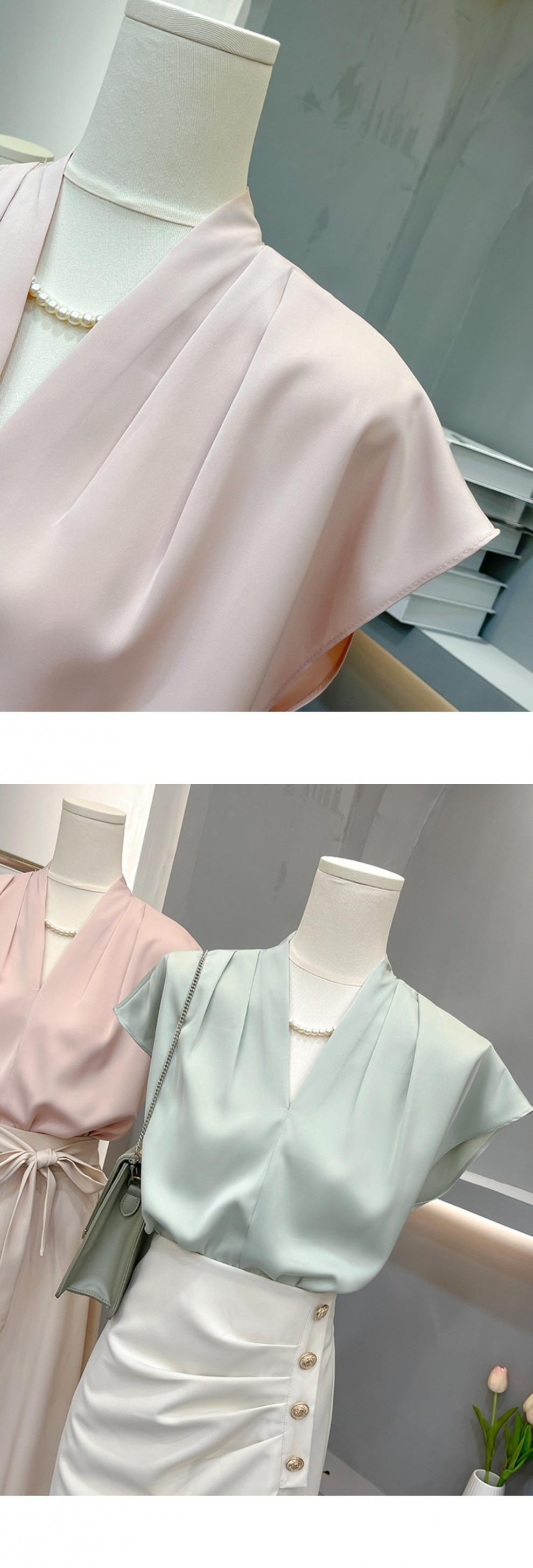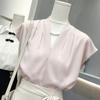 Camisa de Acetato Diseño Nicho Alta Gama Commuter Cuello en V Manga Corta Delgada Francesa Manga Pequeña Volada Top Estilo Verano para Mujer