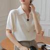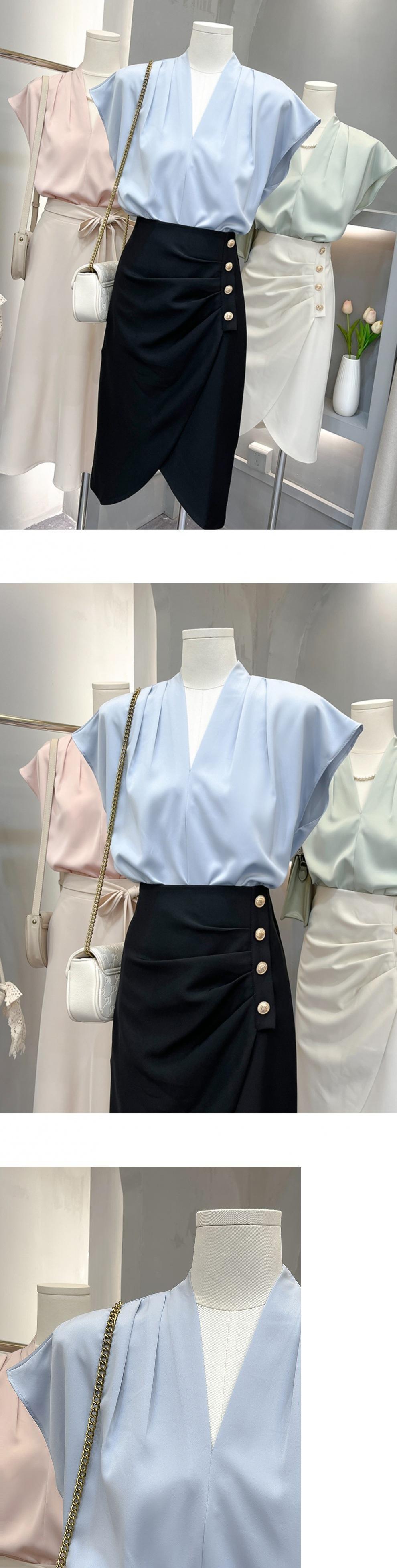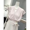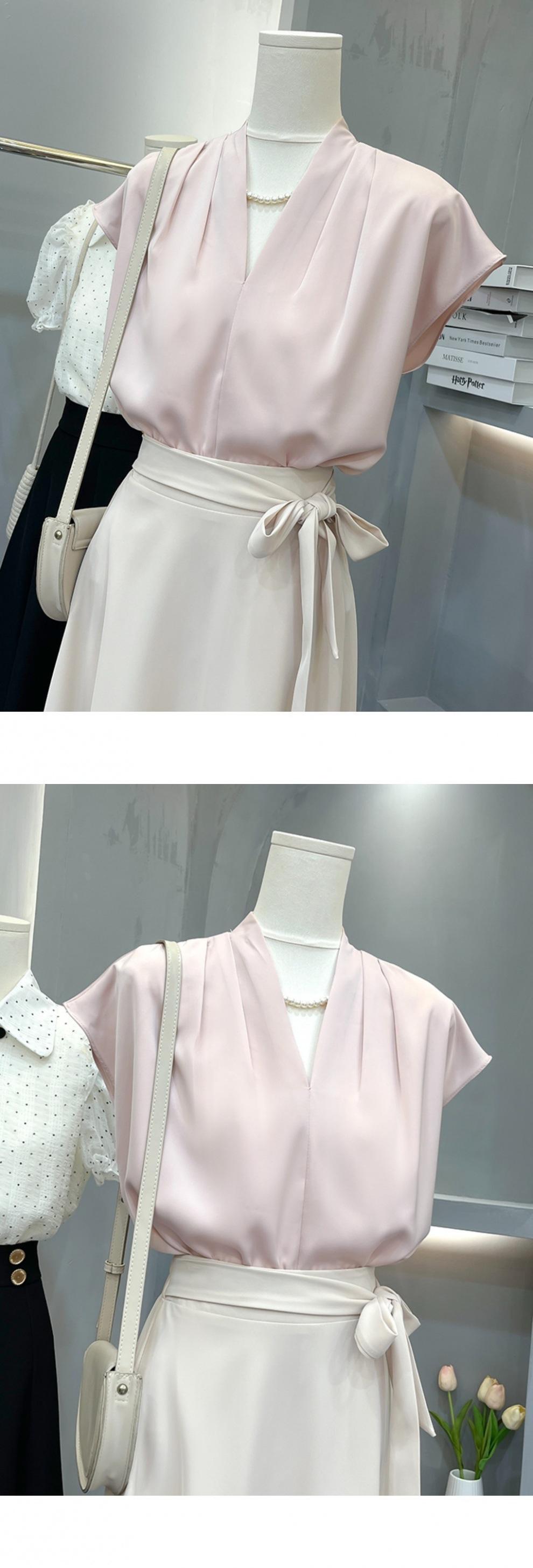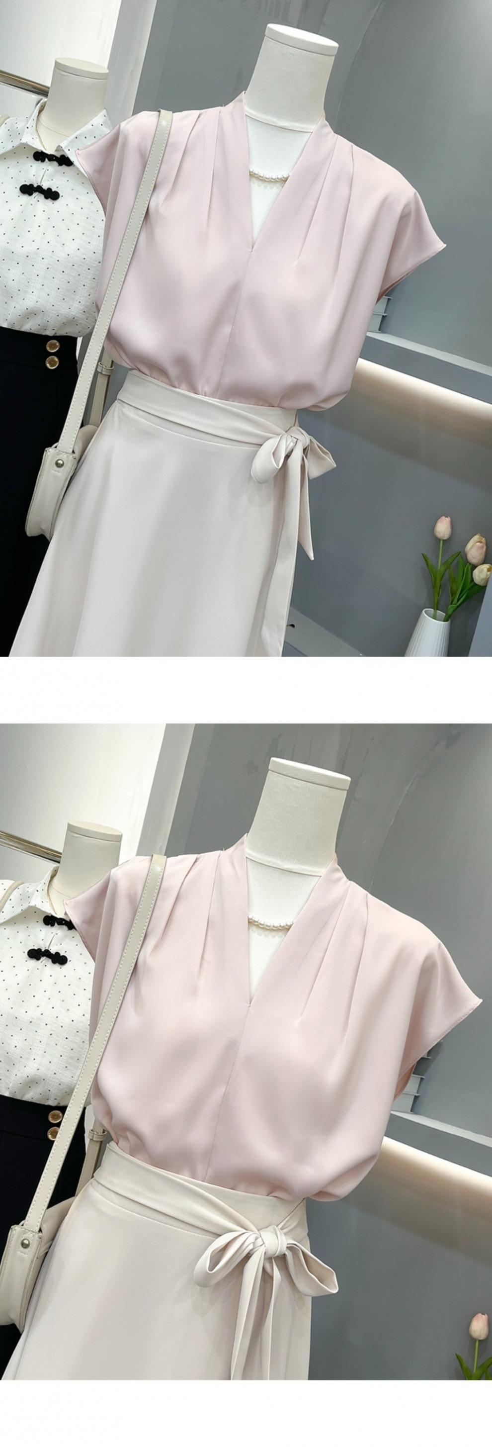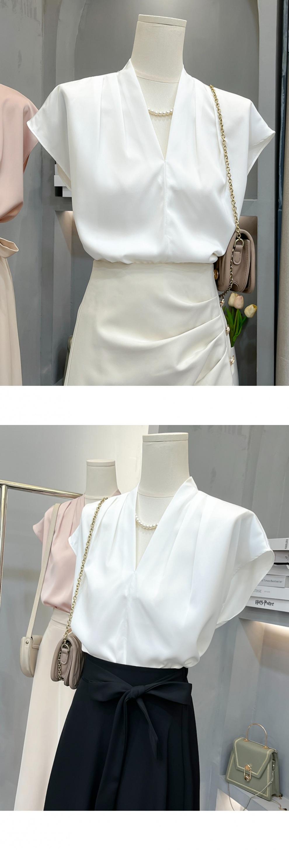 Camisa de Acetato Diseño Nicho Alta Gama Commuter Cuello en V Manga Corta Delgada Francesa Manga Pequeña Volada Top Estilo Verano para Mujer