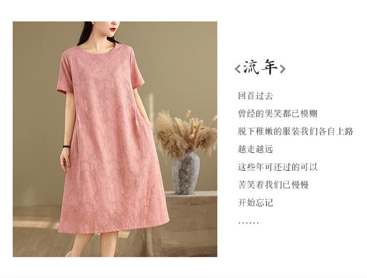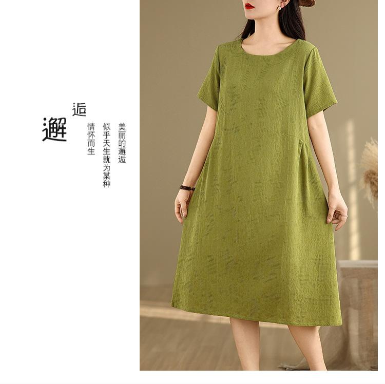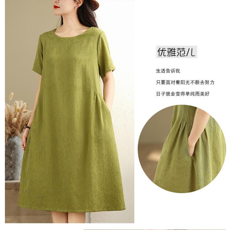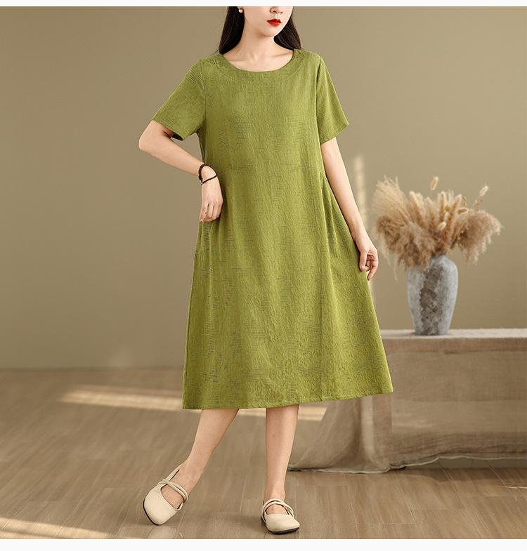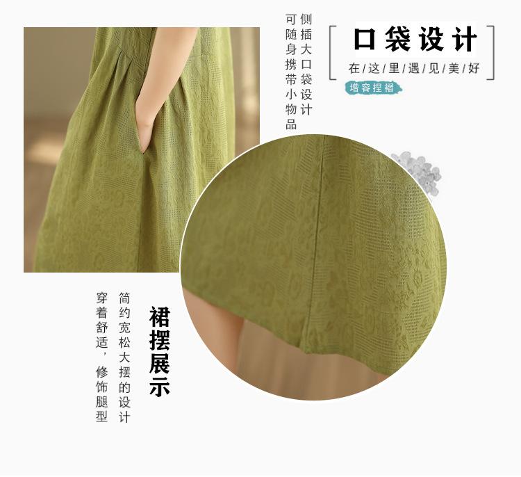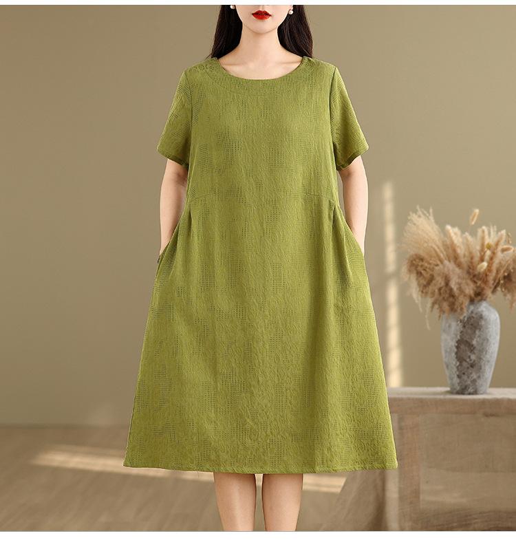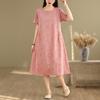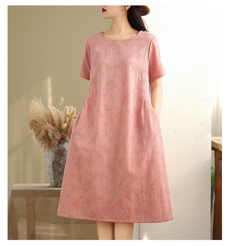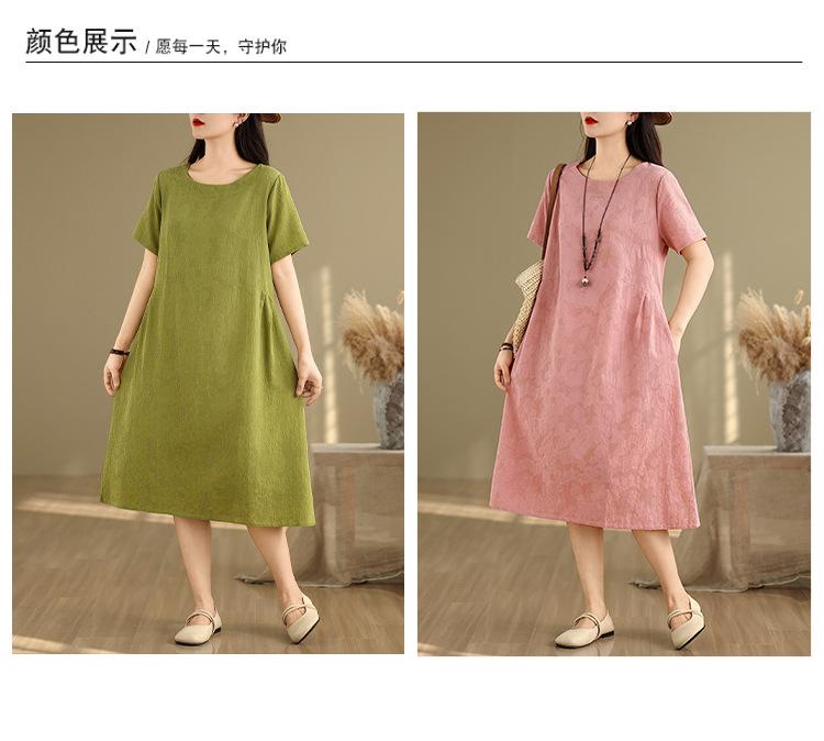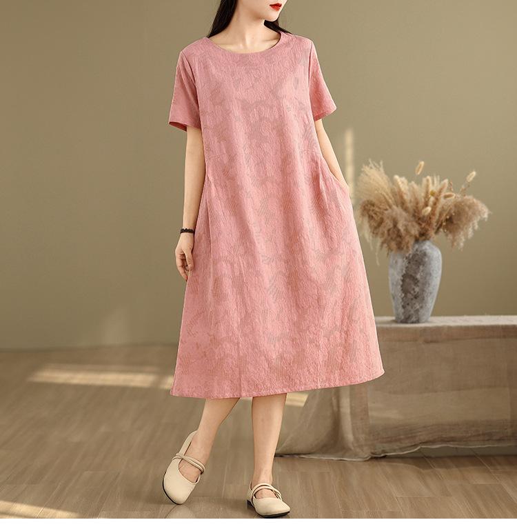 2025 Nuevo Verano Moda Casual Adelgazante Holgado Estilo Occidental Jacquard Algodón y Lino Vestido de Manga Corta Midi Mujer
