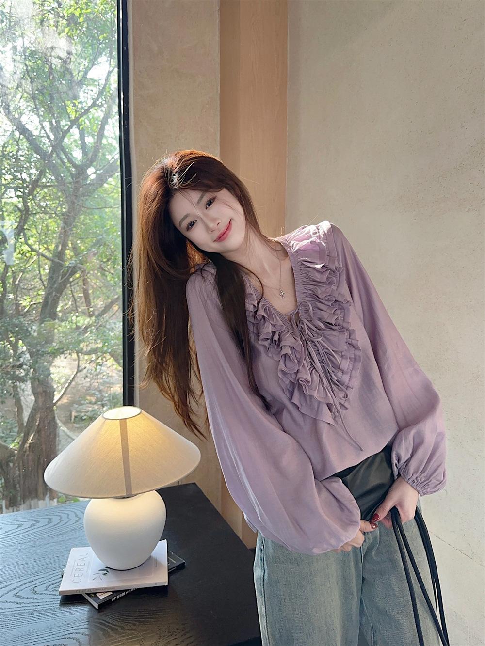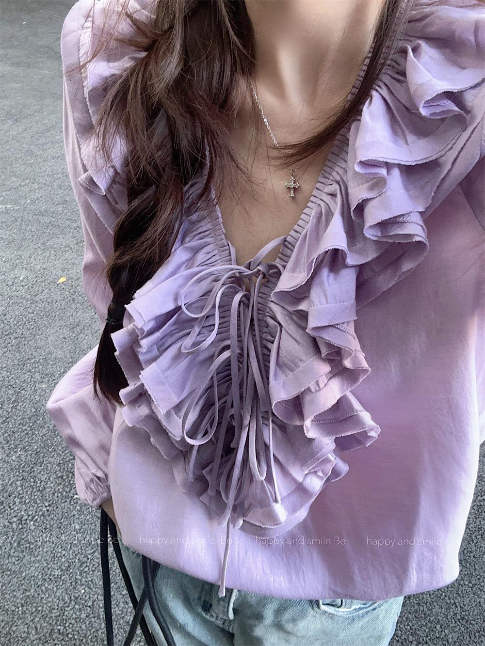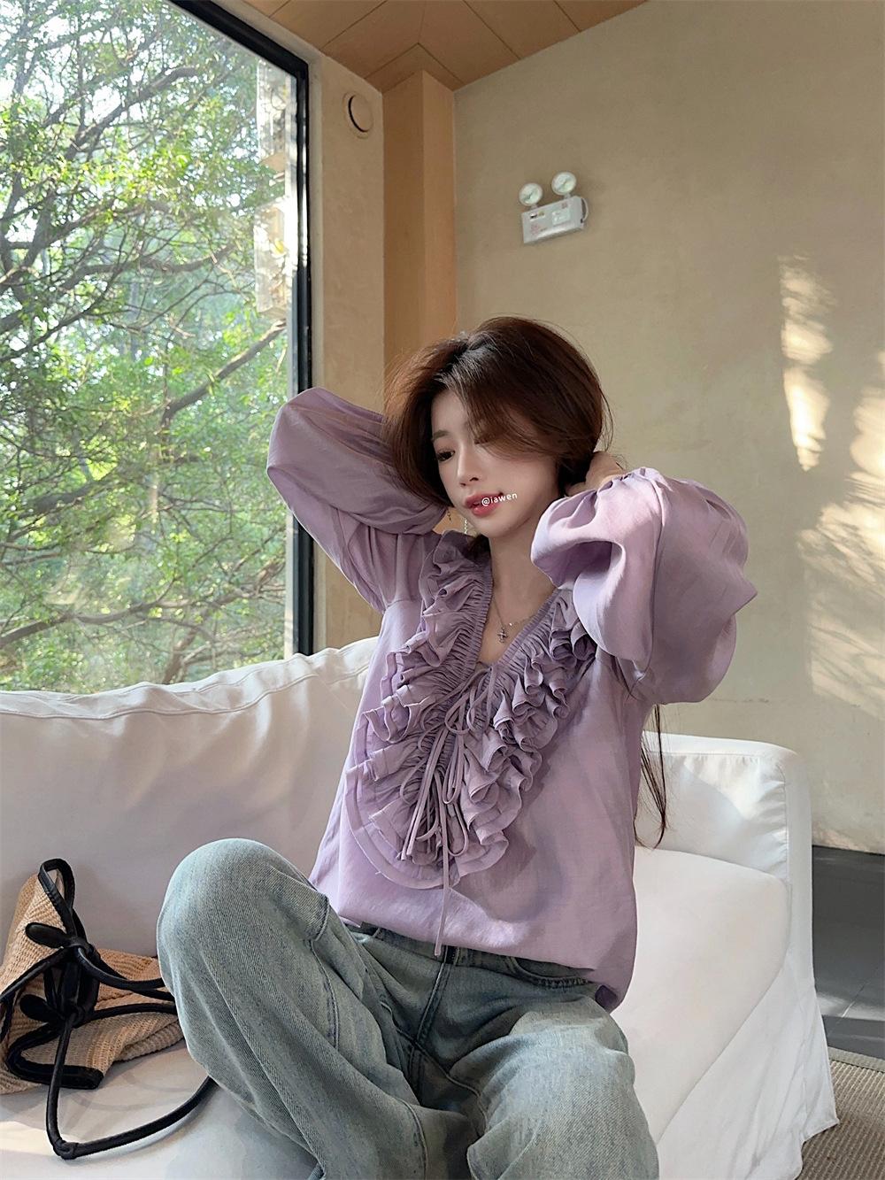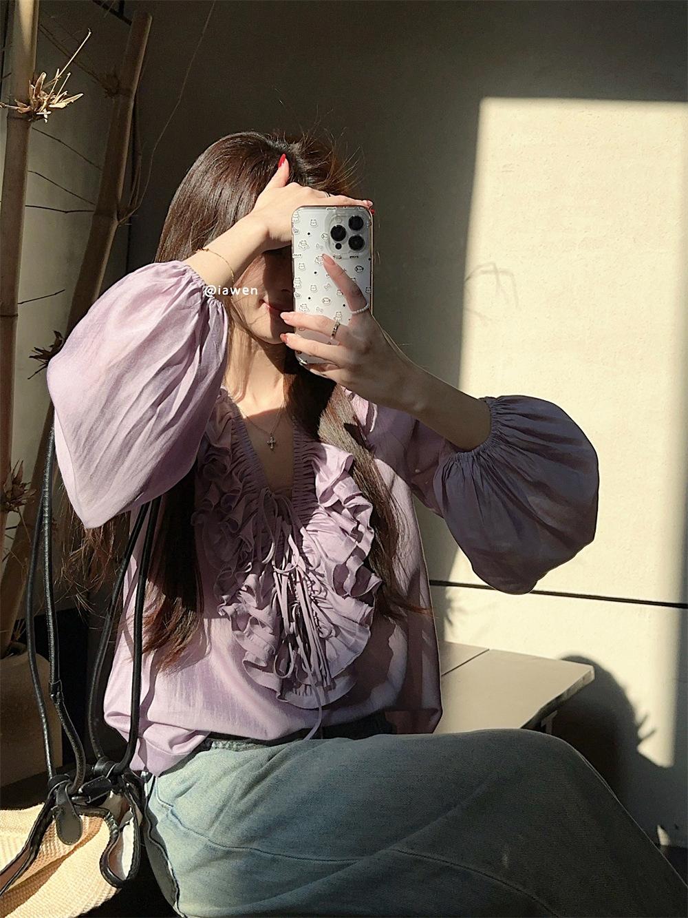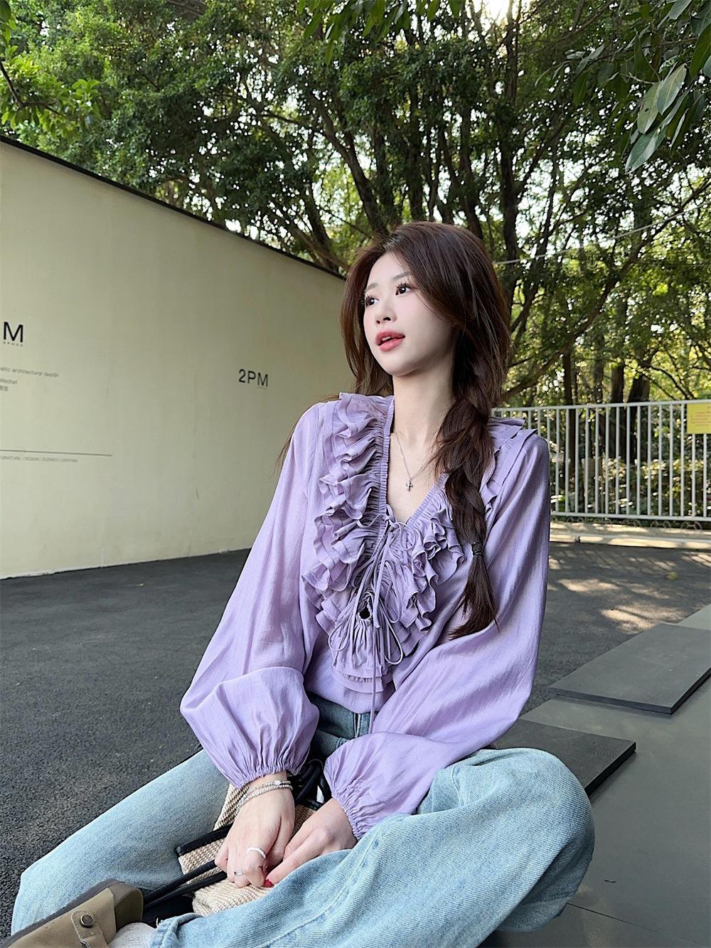 Camisa Francesa de Alta Gama con Volantes y Cuello en V para Mujer Primavera Morada Camisa de Manga Larga Top Casual Holgado