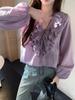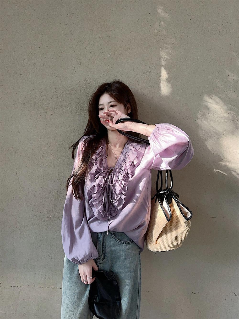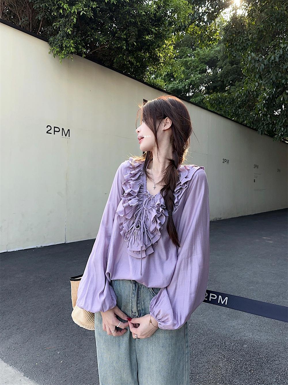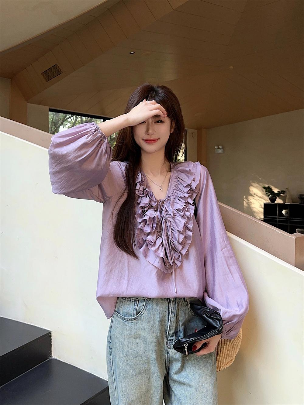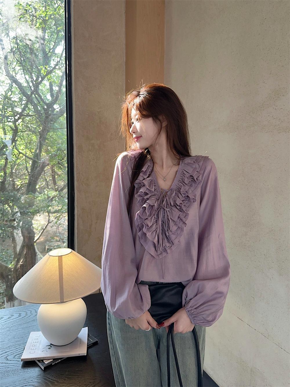 Camisa Francesa de Alta Gama con Volantes y Cuello en V para Mujer Primavera Morada Camisa de Manga Larga Top Casual Holgado