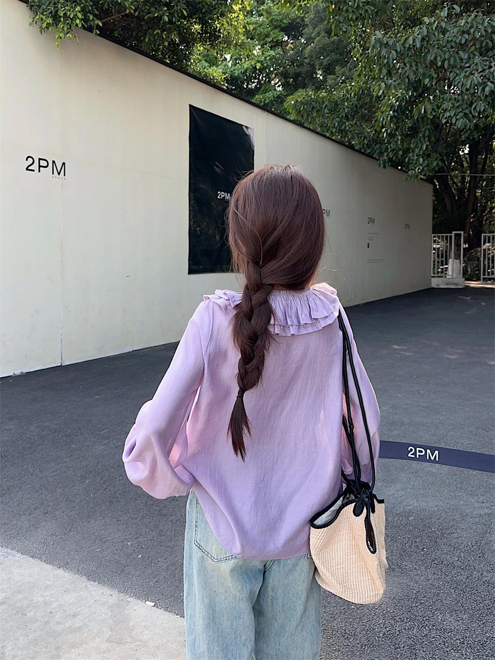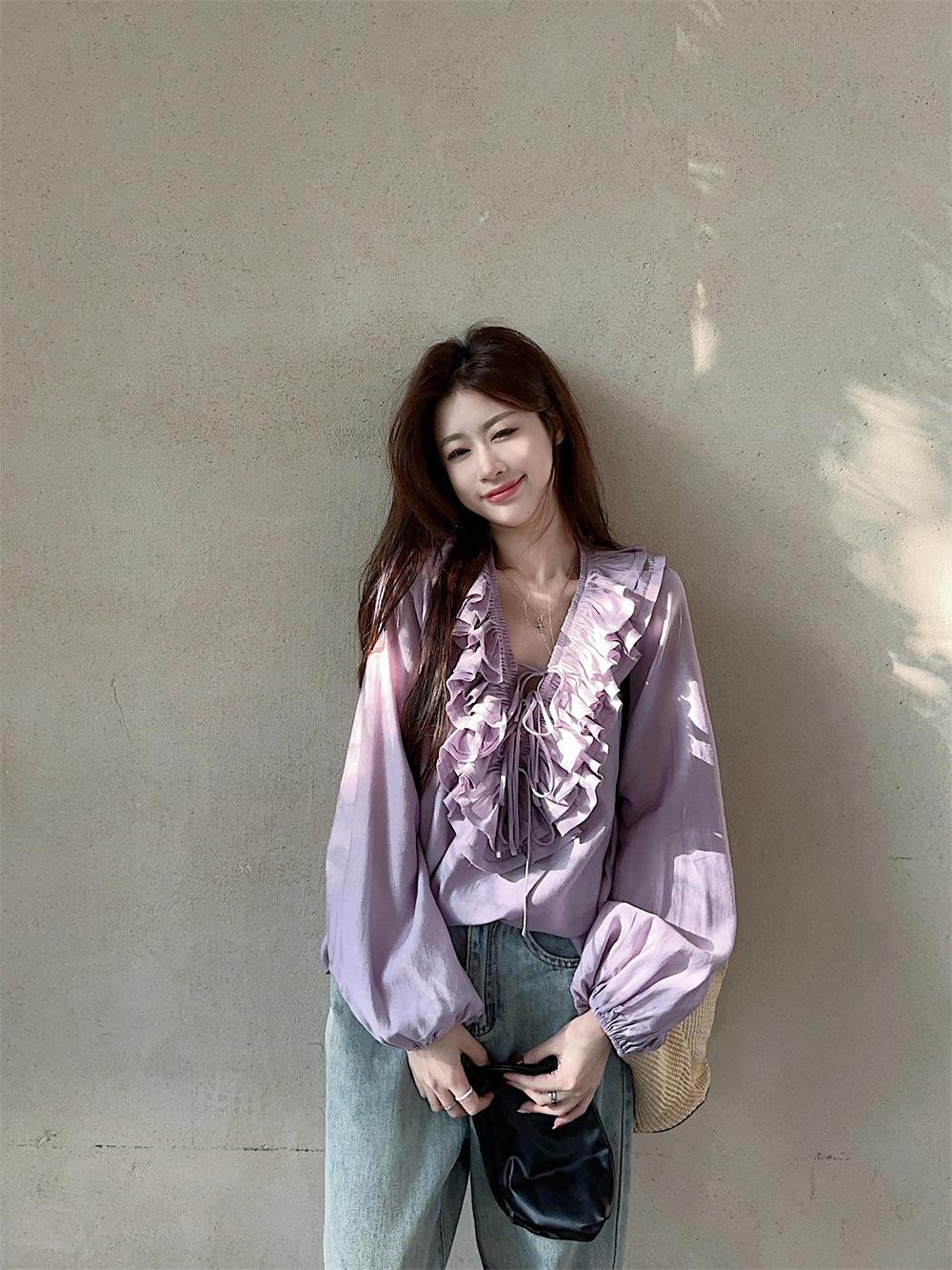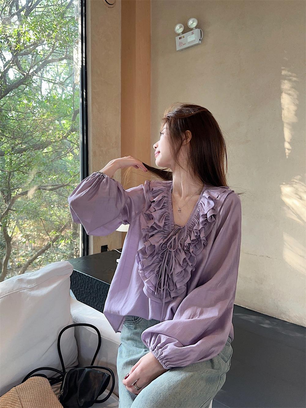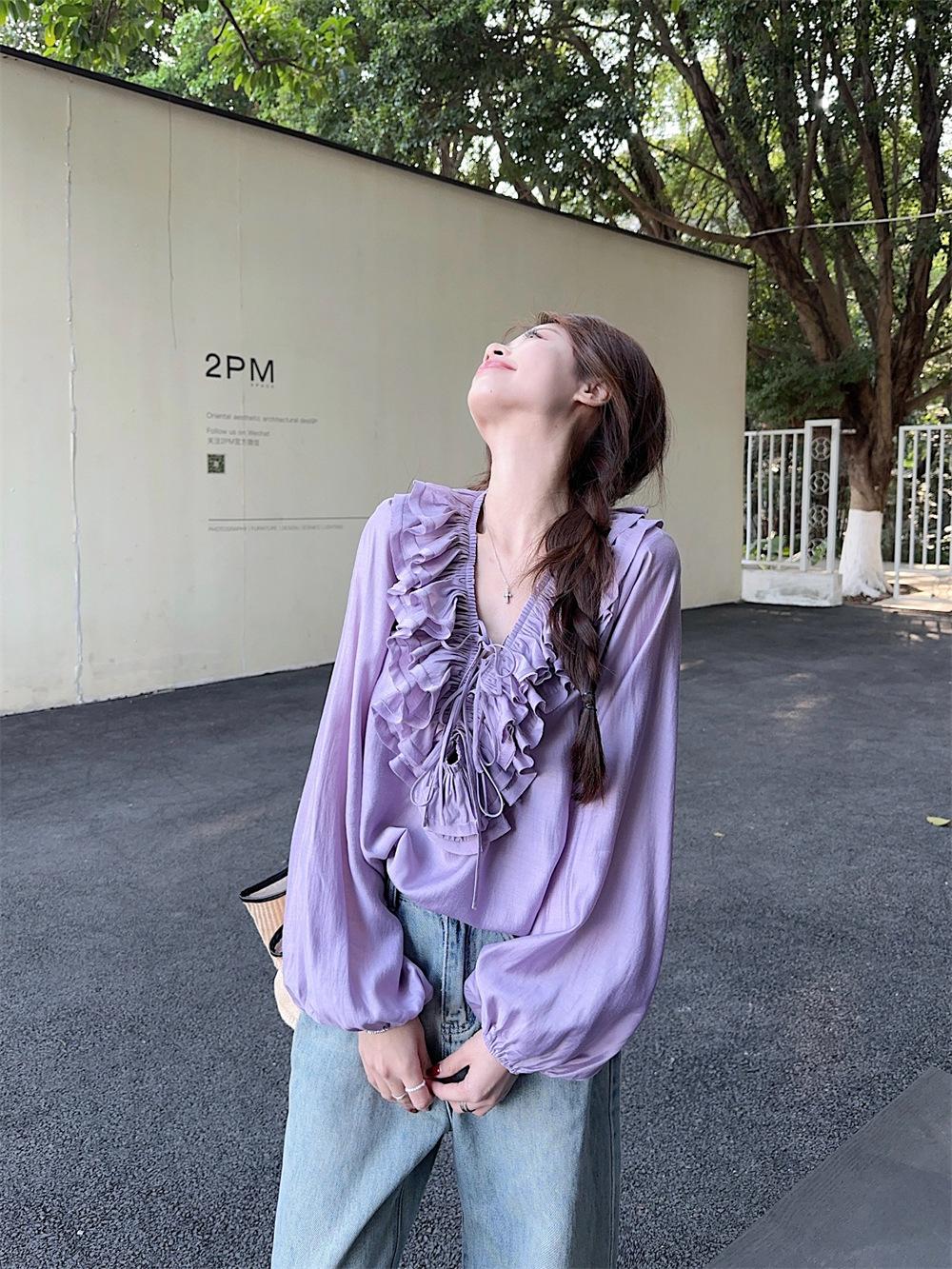Compra Camisa Francesa de Alta Gama con Volantes y Cuello en V para Mujer Primavera Morada Camisa de Manga Larga Top Casual Holgado al por mayor en Joom.pro