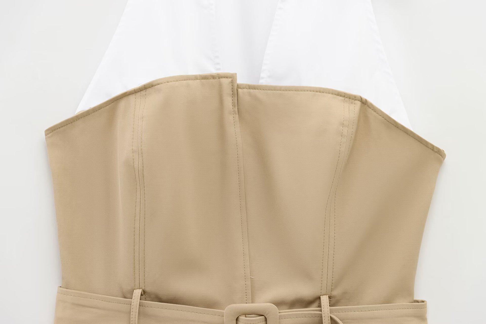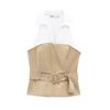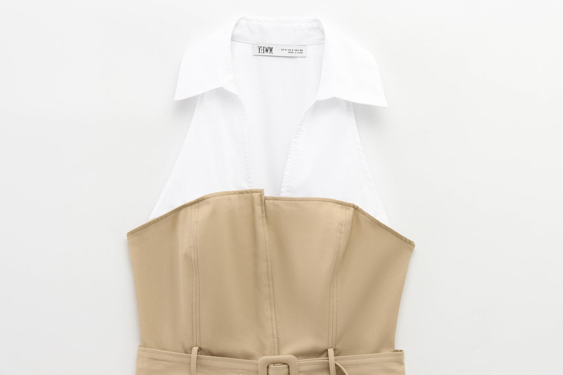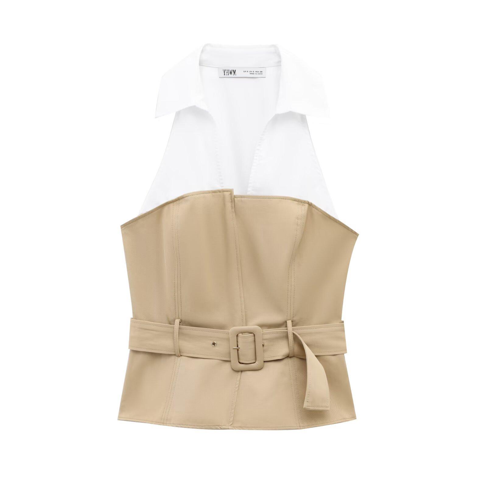 Ropa de Mujer Nueva Primavera 2025 Diseño Casual Europeo y Americano Cuello Halter Parcheado de Color en Contraste Top Ajustado con Cinturón