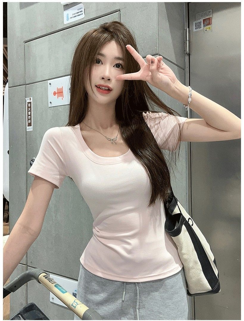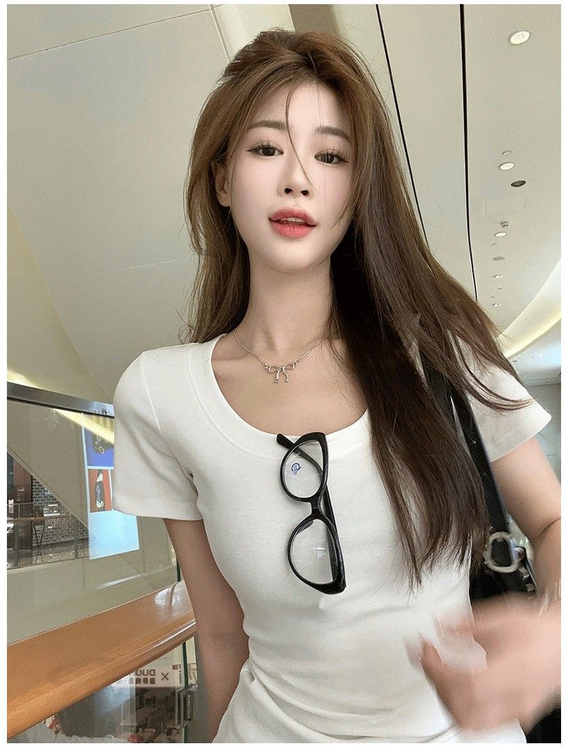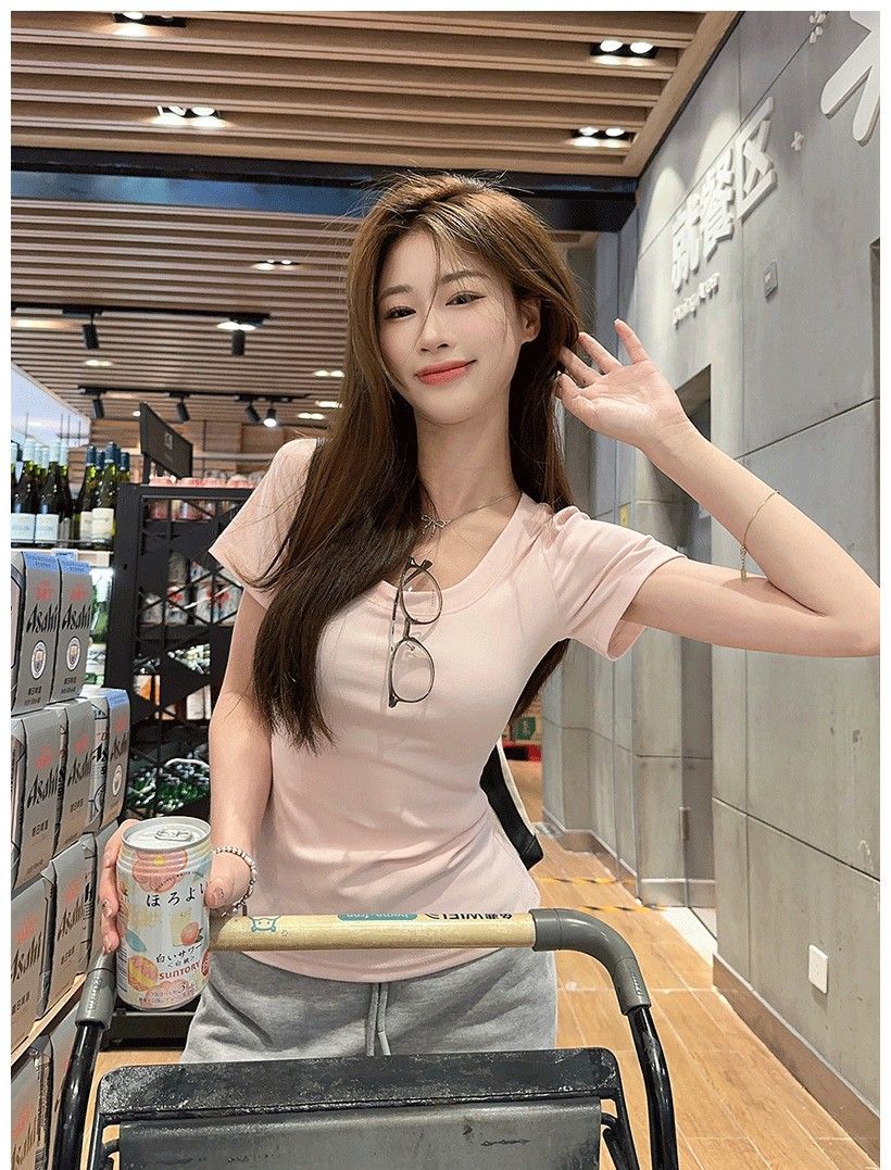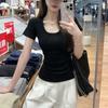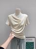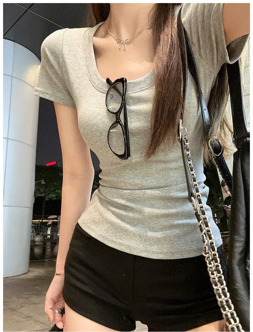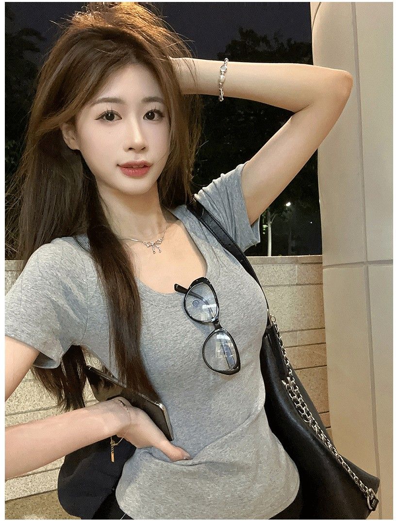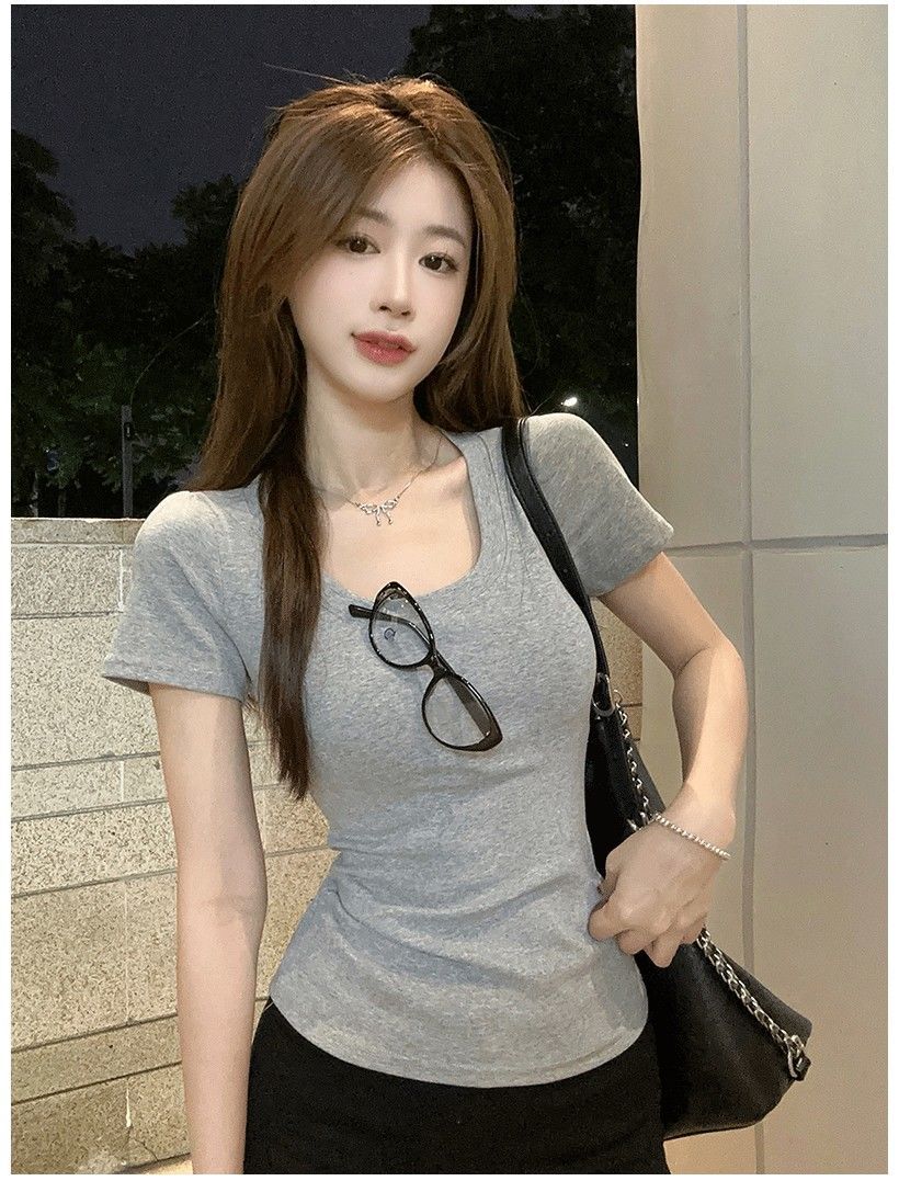 Playera Corta de Hombro Derecho Gris Verano 2025 Elástica Nueva Slim Manga Corta Cuello Redondo Grande Slim Sexy Top
