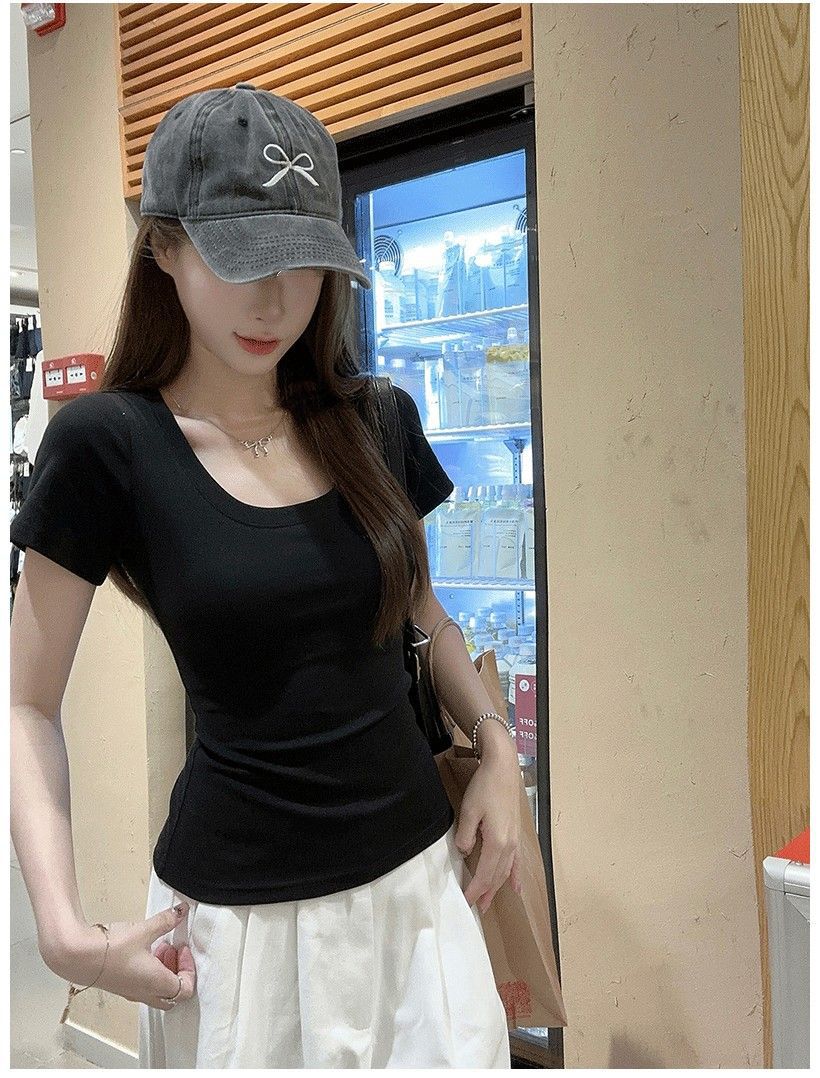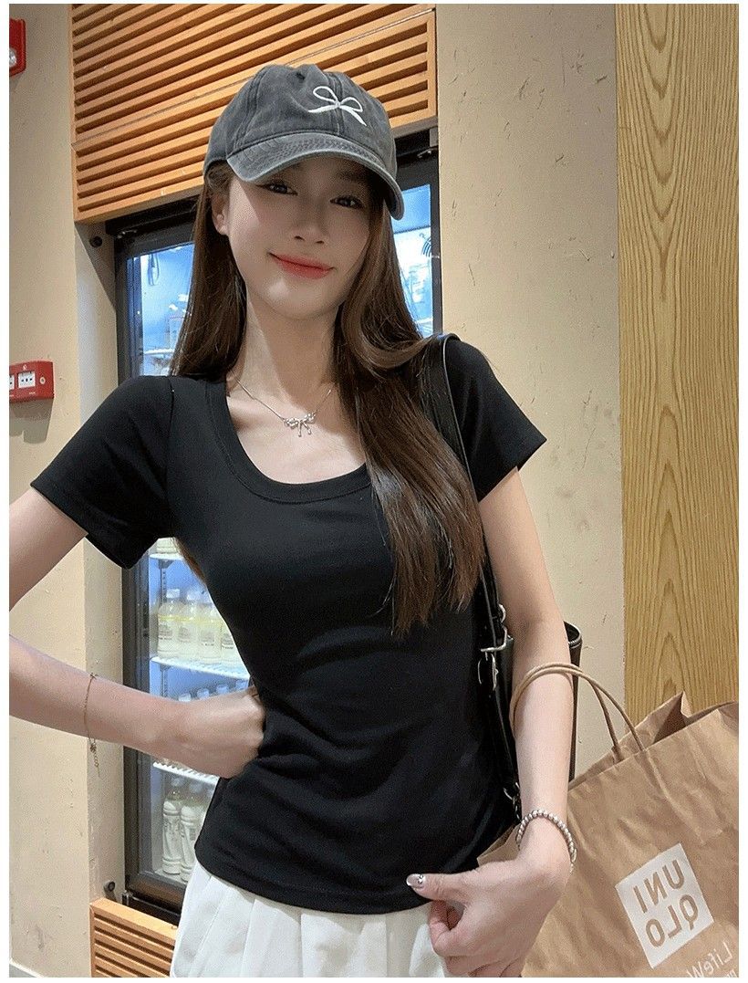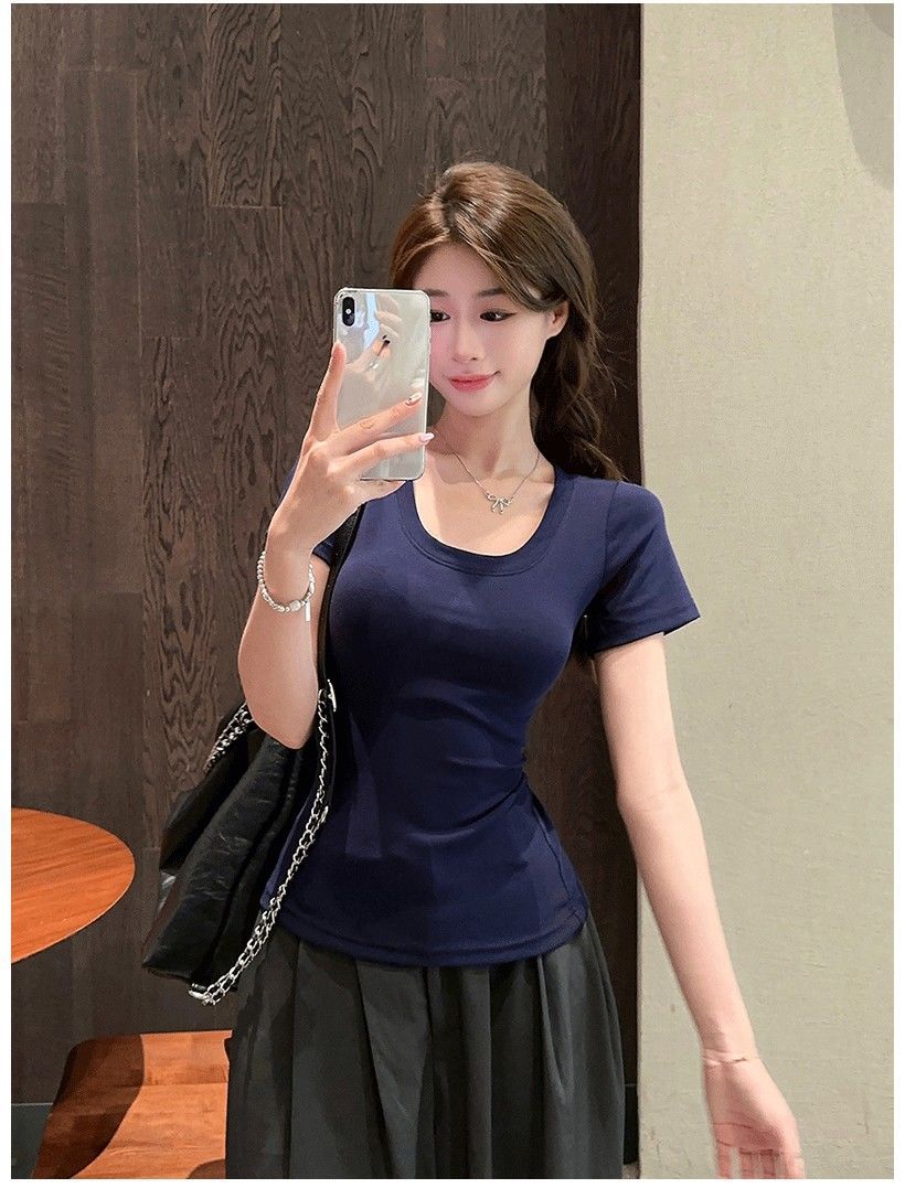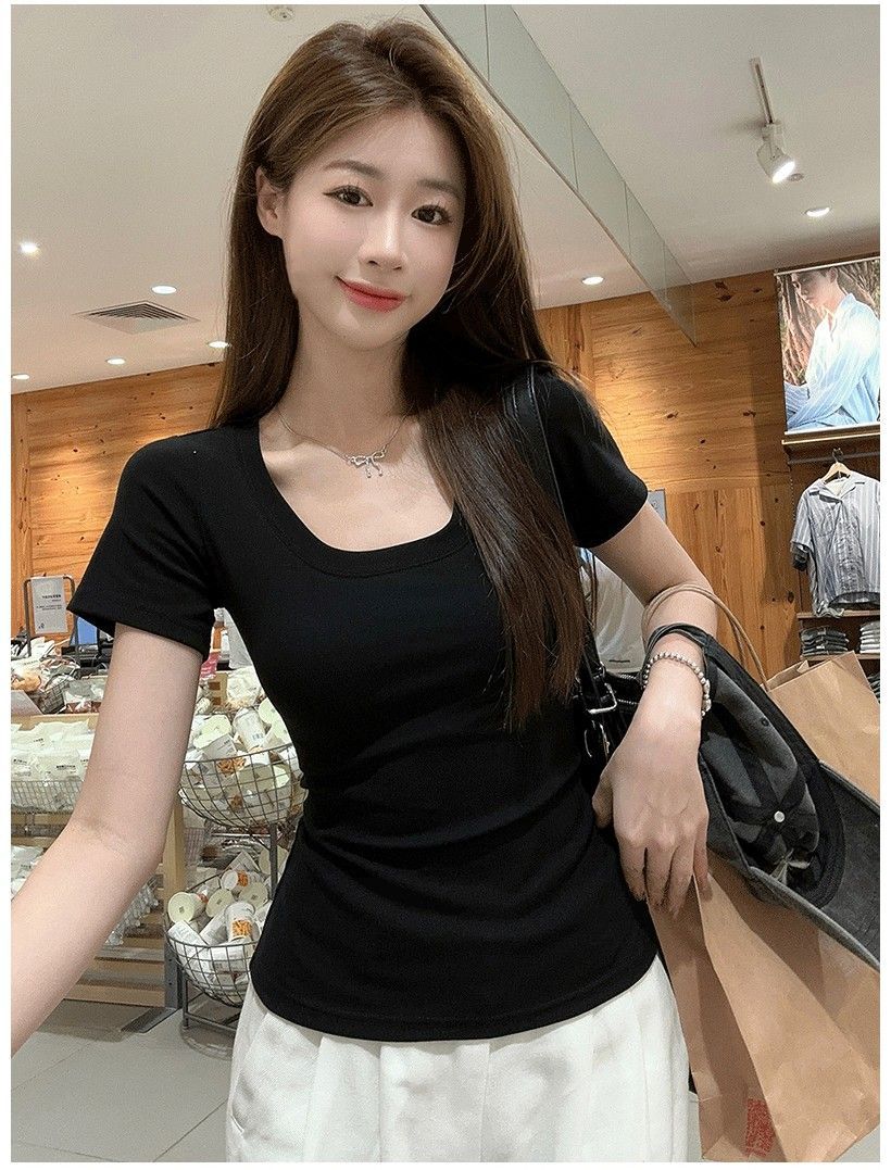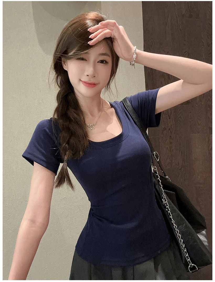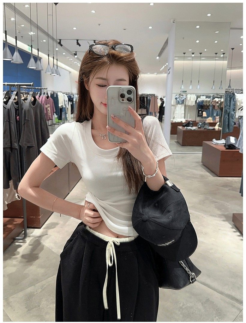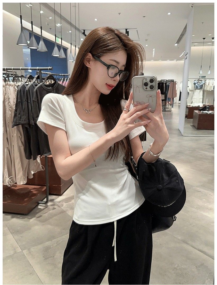 Playera Corta de Hombro Derecho Gris Verano 2025 Elástica Nueva Slim Manga Corta Cuello Redondo Grande Slim Sexy Top