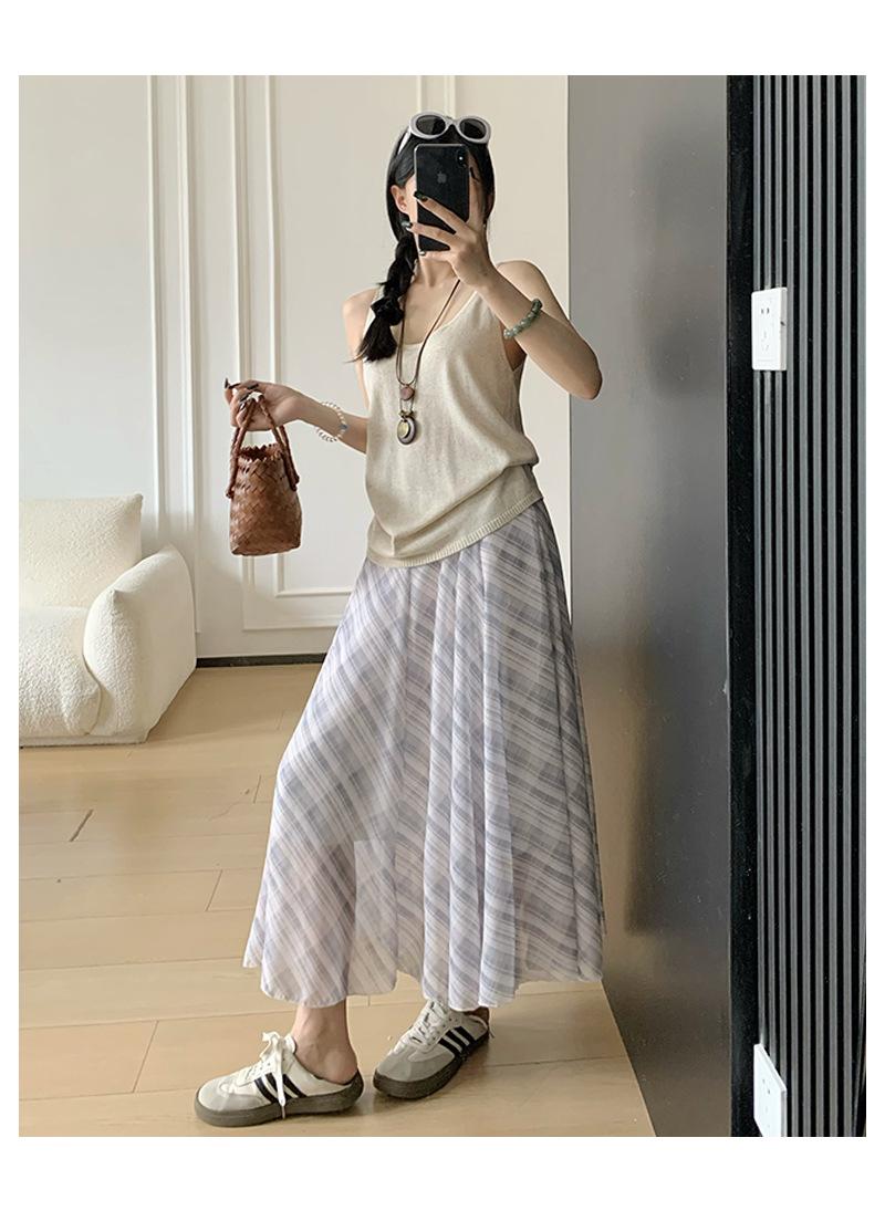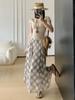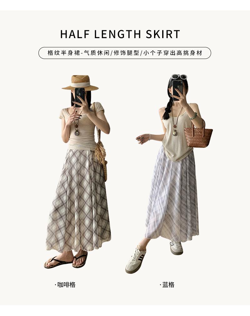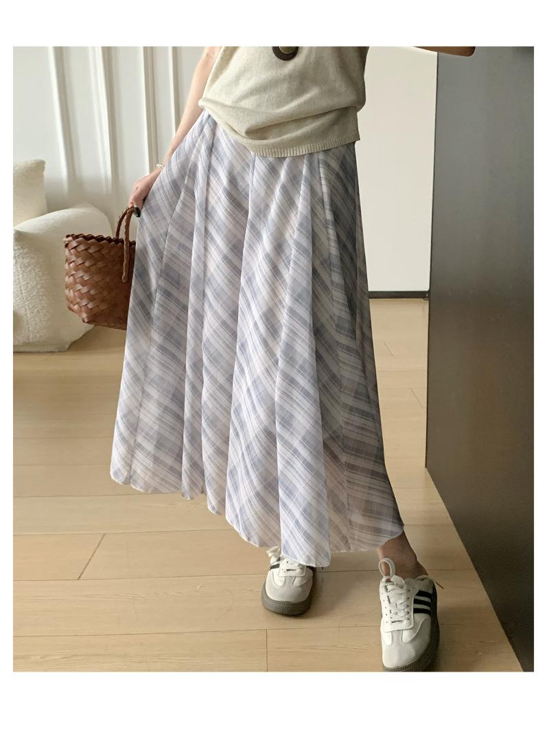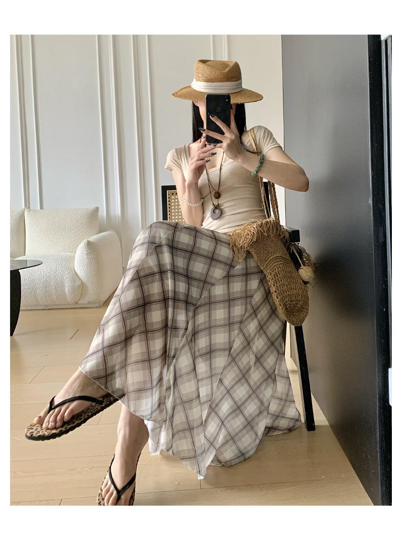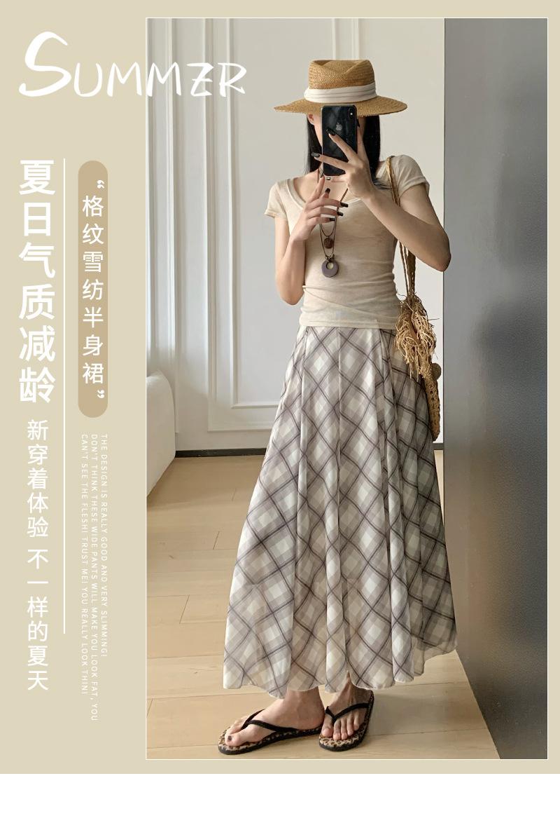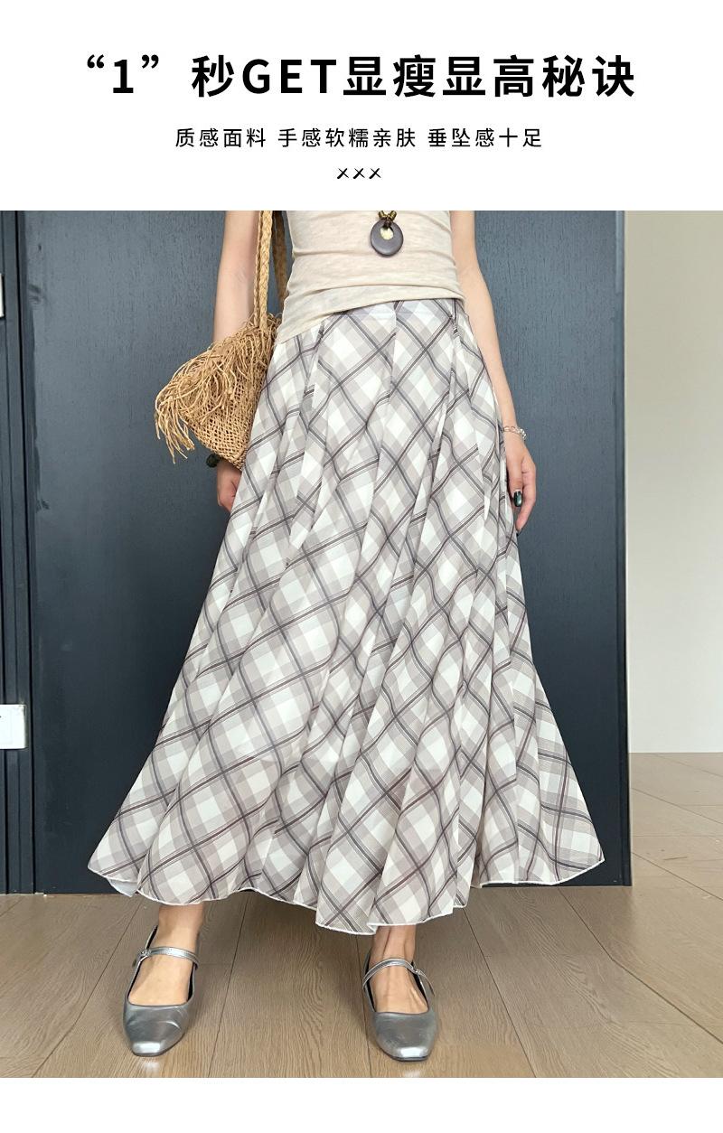 Falda Francesa Retro a Cuadros Contrastantes para Mujer Verano Nuevo Estilo Look Adelgazante Cintura Alta Drapeada Línea A Falda Larga