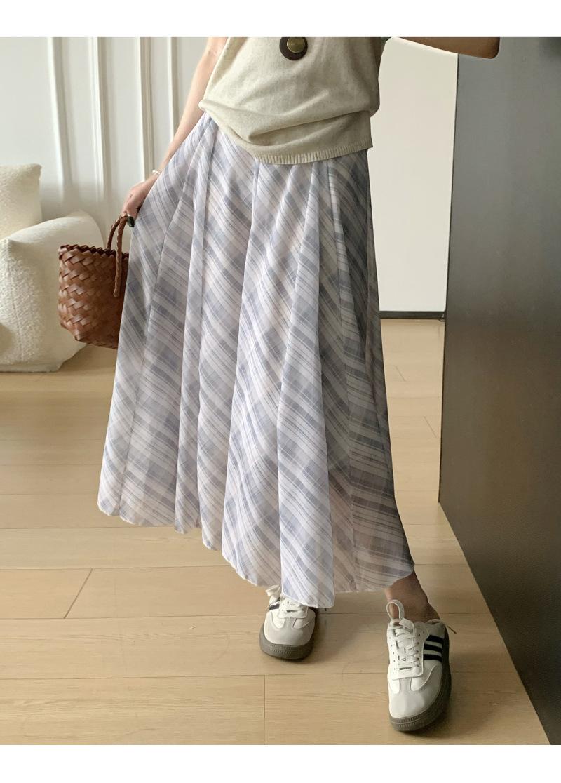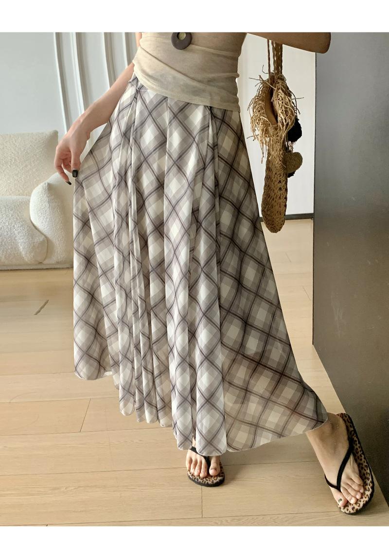 Compra Falda Francesa Retro a Cuadros Contrastantes para Mujer Verano Nuevo Estilo Look Adelgazante Cintura Alta Drapeada Línea A Falda Larga al por mayor en Joom.pro